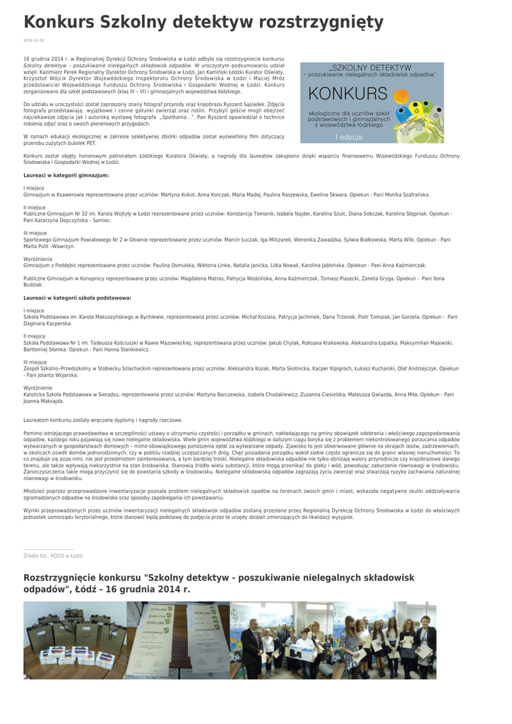 Konkurs Szkolny detektyw rozstrzygnięty 2014-12-19 16 grudnia 2014 r. w Regionalnej Dyrekcji Ochrony Środowiska w Łodzi odbyło się rozstrzygniecie konkursu Szkolny detektyw – poszukiwanie nielegalnych składowisk odpadów. W uroczystym podsumowaniu udział wzięli: Kazimierz Perek Regionalny Dyrektor Ochrony Środowiska w Łodzi, Jan Kamiński Łódzki Kurator Oświaty, Krzysztof Wójcik Dyrektor Wojewódzkiego Inspektoratu Ochrony Środowiska w Łodzi i Maciej Mróz przedstawiciel Wojewódzkiego Funduszu Ochrony Środowiska i Gospodarki Wodnej w Łodzi. Konkurs zorganizowano dla szkół podstawowych (klas IV – VI) i gimnazjalnych województwa łódzkiego. Do udziału w uroczystości został zaproszony znany fotograf przyrody oraz krajobrazu Ryszard Sąsiadek. Zdjęcia fotografa przedstawiają wyjątkowe i cenne gatunki zwierząt oraz roślin. Przybyli goście mogli obejrzeć najciekawsze zdjęcia jak i autorską wystawę fotografa „Spotkania…”. Pan Ryszard opowiedział o technice robienia zdjęć oraz o swoich plenerowych przygodach. W ramach edukacji ekologicznej w zakresie selektywnej zbiórki odpadów został wyświetlony film dotyczący przerobu zużytych butelek PET. Konkurs został objęty honorowym patronatem Łódzkiego Kuratora Oświaty, a nagrody dla laureatów zakupiono dzięki wsparciu finansowemu Wojewódzkiego Funduszu Ochrony Środowiska i Gospodarki Wodnej w Łodzi. Laureaci w kategorii gimnazjum: I miejsce Gimnazjum w Ksawerowie reprezentowane przez uczniów: Martyna Kokot, Anna Korczak, Maria Madej, Paulina Raszewska, Ewelina Skwara. Opiekun - Pani Monika Szafrańska. II miejsce Publiczne Gimnazjum Nr 32 im. Karola Wojtyły w Łodzi reprezentowane przez uczniów: Konstancja Tomanik, Izabela Najder, Karolina Szulc, Diana Sobczak, Karolina Stępniak. Opiekun Pani Katarzyna Depczyńska – Samiec. III miejsce Sportowego Gimnazjum Powiatowego Nr 2 w Głownie reprezentowane przez uczniów: Marcin Łuczak, Iga Milczarek, Weronika Zawadzka, Sylwia Białkowska, Marta Wilk. Opiekun - Pani Marta Polit –Wawrzyn. Wyróżnienia Gimnazjum z Poddębic reprezentowane przez uczniów: Paulina Osmulska, Wiktoria Linke, Natalia Janicka, Lidia Nowak, Karolina Jabłońska. Opiekun - Pani Anna Kaźmierczak. Publiczne Gimnazjum w Konopnicy reprezentowane przez uczniów: Magdalena Matras, Patrycja Wodzińska, Anna Kaźmierczak, Tomasz Piasecki, Żaneta Gryga. Opiekun - Pani Ilona Budziak. Laureaci w kategorii szkoła podstawowa: I miejsce Szkoła Podstawowa im. Karola Makuszyńskiego w Bychlewie, reprezentowana przez uczniów: Michał Koziara, Patrycja Jachimek, Daria Trzonek, Piotr Tomalak, Jan Gorzela. Opiekun - Pani Dagmara Kacperska. II miejsce Szkoła Podstawowa Nr 1 im. Tadeusza Kościuszki w Rawie Mazowieckiej, reprezentowana przez uczniów: Jakub Chylak, Roksana Krakowska, Aleksandra Łopatka, Maksymilian Majewski, Bartłomiej Słomka. Opiekun - Pani Hanna Stankiewicz. III miejsce Zespół Szkolno–Przedszkolny w Stobiecku Szlacheckim reprezentowana przez uczniów: Aleksandra Kozak, Marta Skotnicka, Kacper Kipigroch, Łukasz Kucharski, Olaf Andrzejczyk. Opiekun - Pani Jolanta Wojarska. Wyróżnienie Katolicka Szkoła Podstawowa w Sieradzu, reprezentowana przez uczniów: Martyna Barczewska, Izabela Chodakiewicz, Zuzanna Ciesielska, Mateusza Gwiazda, Anna Miła. Opiekun - Pani Joanna Maksajda. Laureatom konkursu zostały wręczone dyplomy i nagrody rzeczowe. Pomimo istniejącego prawodawstwa w szczególności ustawy o utrzymaniu czystości i porządku w gminach, nakładającego na gminy obowiązek odebrania i właściwego zagospodarowania odpadów, każdego roku pojawiają się nowe nielegalne składowiska. Wiele gmin województwa łódzkiego w dalszym ciągu boryka się z problemem niekontrolowanego porzucania odpadów wytwarzanych w gospodarstwach domowych – mimo obowiązkowego ponoszenia opłat za wytwarzane odpady. Zjawisko to jest obserwowane głównie na skrajach lasów, zadrzewieniach, w okolicach osiedli domów jednorodzinnych, czy w pobliżu rzadziej uczęszczanych dróg. Chęć posiadania porządku wokół siebie często ogranicza się do granic własnej nieruchomości. To co znajduje się poza nimi, nie jest przedmiotem zainteresowania, a tym bardziej troski. Nielegalne składowiska odpadów nie tylko obniżają walory przyrodnicze czy krajobrazowe danego terenu, ale także wpływają niekorzystnie na stan środowiska. Stanowią źródło wielu substancji, które mogą przenikać do gleby i wód, powodując zaburzenie równowagi w środowisku. Zanieczyszczenia takie mogą przyczynić się do powstania szkody w środowisku. Nielegalne składowiska odpadów zagrażają życiu zwierząt oraz stwarzają ryzyko zachwiania naturalnej równowagi w środowisku. Młodzież poprzez przeprowadzone inwentaryzacje poznała problem nielegalnych składowisk opadów na terenach swoich gmin i miast, wskazała negatywne skutki oddziaływania zgromadzonych odpadów na środowisko oraz sposoby zapobiegania ich powstawaniu. Wyniki przeprowadzonych przez uczniów inwentaryzacji nielegalnych składowisk odpadów zostaną przesłane przez Regionalną Dyrekcję Ochrony Środowiska w Łodzi do właściwych jednostek samorządu terytorialnego, które stanowić będą podstawę do podjęcia przez te urzędy działań zmierzających do likwidacji wysypisk. -----------------------------Źródło fot.: RDOŚ w Łodzi Rozstrzygnięcie konkursu "Szkolny detektyw - poszukiwanie nielegalnych składowisk odpadów", Łódź - 16 grudnia 2014 r.