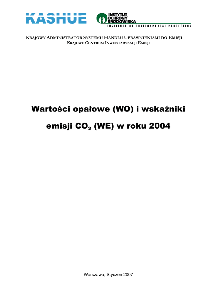 KRAJOWY ADMINISTRATOR SYSTEMU HANDLU UPRAWNIENIAMI DO EMISJI KRAJOWE CENTRUM INWENTARYZACJI EMISJI Wartości opałowe (WO) i wskaźniki emisji CO2 (WE) w roku 2004 Warszawa, Styczeń 2007 W niniejszym pliku zamieszczono tabele sektorowe (tab. 1-15), zawierające dane dla podstawowych paliw wykorzystywanych w danym rodzaju działalności oraz dodatkową tabelę 16 zawierającą średnie krajowe wartości opałowe i wskaźniki emisji dla poszczególnych paliw, odnoszącą się tylko do przypadków, kiedy dane paliwo jest stosowane a nie zostało uwzględnione w odpowiedniej tabeli sektorowej (tab. 1-15). Wszystkie wartości wskaźników emisji i wartości opałowych w tabelach 1-16, z wyjątkiem wartości zaznaczonych pogrubioną kursywą, są wartościami użytymi w krajowej inwentaryzacji gazów cieplarnianych za rok 2004. Dane wykorzystane w obliczeniach w krajowej inwentaryzacji mogą nie występować bezpośrednio w raporcie inwentaryzacyjnym, ze względu na agregacje do wyższych kategorii zgodnie z wytycznymi do sporządzania krajowej inwentaryzacji 1. Wartości zaznaczone pogrubioną kursywą w tabelach 1-16 zostały podane w celach informacyjnych dla ułatwienia raportowania przez operatorów instalacji. Wartości te nie są stosowane w krajowej inwentaryzacji emisji gazów cieplarnianych Wskaźniki emisji zestawione w tabelach 1-16 odpowiadają wyłącznie podanej wartości opałowej paliwa, z wyjątkiem paliw dla których wartość opałowa jest zaznaczona pogrubioną kursywą lub dla których wartość opałowa nie jest określana (ze względu na to, że ich zużycie jest podawane w statystyce wyłącznie w jednostkach energetycznych). Współczynnik utlenienia jest już uwzględniony w wartości wskaźnika emisji. Ze względu na różne wartości współczynników utlenienia dla różnych rodzajów działalności, może wystąpić sytuacja, że tej samej wartości opałowej w różnych tabelach będą odpowiadać inne wartości wskaźnika emisji. W porównaniu do podobnego zestawienia danych za rok 2003 wprowadzone zostały następujące zmiany, które mają na celu ułatwienie korzystania z podanych informacji: zrezygnowano z podziału zużycia paliw na produkcję energii elektrycznej i produkcję ciepła; z tabelach sektorowych uwzględniono wszystkie paliwa (z wyjątkiem paliw pędnych), jakie dla danego działu są wykazywane w Gospodarce paliwowoenergetycznej GUS; zmniejszono ogólną liczbę tabel/działów poprzez agregację części z nich, i tak: − połączono dział 24 (Produkcja chemikaliów i wyrobów chemicznych oraz dział 25 (Produkcja wyrobów z gumy i tworzyw sztucznych), − połączono dział 21 (Produkcja celulozowo-papiernicza) oraz dział 22 (działalność wydawnicza i poligraficzna), − utworzono zagregowany dział Budownictwo oraz inne działy przemysłu nie ujęte powyżej obejmujący między innymi następujące działy przemysłu nie wymienione w tabelach szczegółowych: kopalnictwo surowców nieenergetycznych (dział 13 i 14), włókiennictwo (dział 17), produkcja odzieży oraz futrzarstwo (dział 18), obróbka skóry i produkcja wyrobów ze 1 IPCC 1997, Revised 1996 IPCC Guidelines for National Greenhouse Gas Inventories: Vol. 1. Reporting Instructions, Vol. 2. Workbook, Vol. 3. Reference Manual. IPCC 2000, Good Practice Guidance and Uncertainty Management in National GHG Inventories. 1 skóry (dział 19), produkcja drewna i wyrobów z drewna (dział 20), produkcja mebli - i pozostała działalność produkcyjna (dział 36), produkcja wyrobów z pozostałych surowców niemetalicznych, która obejmuje m.in. produkcję cementu, wapna, szkła i ceramiki (dział 26), produkcja wyrobów z metali, bez maszyn i urządzeń (dział 28), produkcja maszyn i urządzeń (dział 29 oraz 30), produkcja maszyn i aparatury elektrycznej, radiowej, telewizyjnej i komunikacyjnej (dział 31 oraz 32), produkcja instrumentów medycznych, precyzyjnych i optycznych (dział 33), produkcja pojazdów mechanicznych i innego sprzętu transportowego (dział 34 oraz 35), zagospodarowanie odpadów (dział 37), zaopatrywanie w gaz (grupa 40.2) zaopatrywanie w wodę (dział 41); zrezygnowano z prezentowania danych dla kategorii Inne przemysły energetyczne oraz Gospodarstwa domowe, ponieważ dane te nie dotyczą jednostek uczestniczących w systemie handlu uprawnieniami do emisji. Należy stosować tabelę wskaźników emisji i wartości opałowych oznaczoną stosownie do podstawowego rodzaju działalności (PKD) wpisywanego na sprawozdaniach G-02 i G-03. Dla poszczególnych rodzajów działalności w niniejszym opracowaniu dane dla podstawowych paliw są umieszczone następująco: Rodzaj działalności Nr tabeli elektrownie i elektrociepłownie zawodowe 1 elektrociepłownie przemysłowe 2 ciepłownie zawodowe („c. komunalne”) 3 ciepłownie niezawodowe („c. przemysłowe”) 4 kotły ciepłownicze energetyki zawodowej („c. zawodowe”) 5 rafinerie 6 koksownie 7 produkcja metali - stopy żelaza (PKD dział 27) 8 produkcja metali - metale nieżelazne (dział 27) 9 produkcja chemikaliów i wyrobów chemicznych (dział 24) oraz produkcja wyrobów z gumy i tworzyw sztucznych (dział 25) 10 produkcja celulozowo-papiernicza (dział 21) oraz działalność wydawnicza i poligraficzna (dział 22) 11 produkcja artykułów spożywczych napojów i tytoniu (dział 15 oraz 16) 12 kopalnictwo surowców nieenergetycznych (dział 13 i 14), włókiennictwo (dział 17), produkcja odzieży oraz futrzarstwo (dział 18), obróbka skóry i produkcja wyrobów ze skóry (dział 19), produkcja drewna i wyrobów z drewna (dział 20), produkcja mebli - i pozostała działalność produkcyjna (dział 36), produkcja wyrobów z pozostałych surowców niemetalicznych, która obejmuje m.in. produkcję cementu, wapna, szkła i ceramiki (dział 26), produkcja wyrobów z metali, bez maszyn i urządzeń (dział 28), produkcja maszyn i urządzeń (dział 29 oraz 30), produkcja maszyn i aparatury elektrycznej
