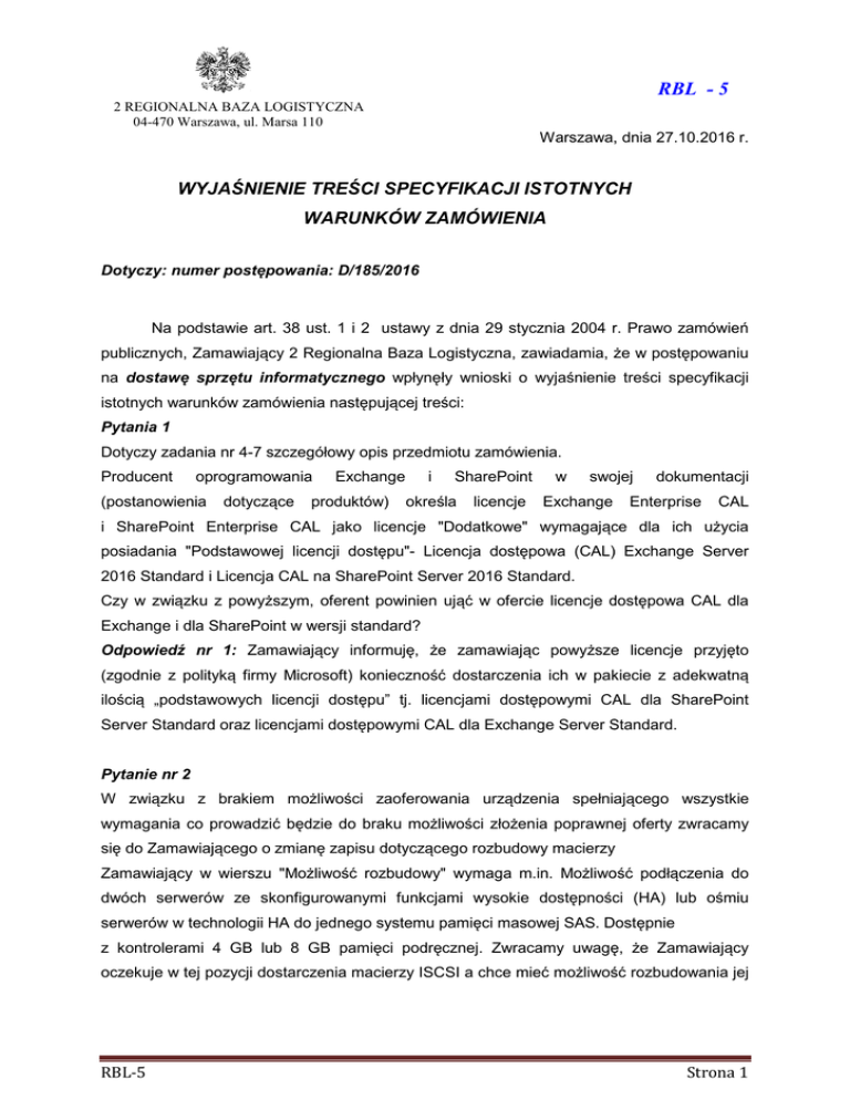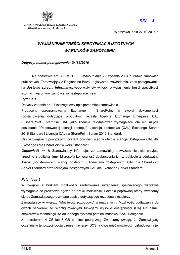 RBL - 5 2 REGIONALNA BAZA LOGISTYCZNA 04-470 Warszawa, ul. Marsa 110 Warszawa, dnia 27.10.2016 r. WYJAŚNIENIE NIENIE TREŚCI CI SPECYFIKACJI ISTOTNYCH WARUNKÓW ZAMÓWIENIA Dotyczy: numer postępowania: powania: D D/185/2016 Na podstawie art. 38 ust. 1 i 2 ustawy z dnia 29 stycznia 2004 r. Prawo zamówień zamówie publicznych, Zamawiający 2 Regionalna Baza Logistyczna, Logistyczna zawiadamia, że ż w postępowaniu na dostawę sprzętu tu informatycznego wpłynęły wnioski o wyjaśnienie śnienie treści tre specyfikacji istotnych warunków zamówienia następującej nast treści: Pytania 1 Dotyczy zadania nr 4-7 7 szczegółowy opis przedmiotu zamówienia. Producent oprogramowania (postanowienia dotyczące ące Exchange produktów) i Share oint SharePoint okre określa la licencje w swoje swojej Exchange dokumentacji Enterprise CAL i SharePoint Enterprise CAL jako licencje "Dodatkowe" wymagające ące dla ich użycia u posiadania "Podstawowej licencji dostępu"dost Licencja dostępowa powa (CAL) Exchange Server 2016 Standard i Licencja CAL na SharePoint Server 2016 Standard. Czy w związku z powyższym, ższym, oferent powinien ująć uj w ofercie licencje dostępowa dost CAL dla Exchange i dla SharePoint w wersji standard? Odpowiedź nr 1: Zamawiający Zamawiają informuję, że zamawiając powyższe ższe licencje przyjęto przyj (zgodnie z polityką firmy Microsoft) konieczno konieczność dostarczenia ich w pakiecie z adekwatn adekwatną ilością „podstawowych licencji dost dostępu” tj. licencjami dostępowymi powymi CAL dla SharePoint Server Standard oraz licencjami dostępowymi powymi CAL dla Exchange Server Standard. Pytanie nr 2 W związku zku z brakiem moż możliwości zaoferowania urządzenia dzenia spełniają spełniającego wszystkie wymagania co prowadzićć będzie ędzie do braku możliwości mo złożenia enia poprawnej oferty zwracamy się do Zamawiającego o zmianę zapisu dotyczącego cego rozbudowy macierzy Zamawiający cy w wierszu "Moż "Możliwość rozbudowy" wymaga m.in. Możliwość żliwość podłączenia do dwóch serwerów ze skonfigurowanymi funkcjami wysokie dostępności dostę ści (HA) lub ośmiu o serwerów w technologii HA do jednego systemu pamięci pami ci masowej SAS. Dost Dostępnie z kontrolerami 4 GB lub 8 GB pamięci podręcznej. cznej. Zwracamy uwagę uwagę, żże Zamawiający oczekuje w tej pozycji dostarczenia macierzy ISCSI a chce mieć mie możliwość żliwość rozbudowania jej RBL-5 Strona 1 o podłączenie do niej serwerów, ale oznacza już tą samą macierz ISCSI jako pamięć masą SAS. Przypominamy,, że w tym przypadku określenie "Macierz dyskowa" i Pamięć masowa" są tożsame i odnoszą się do tego samego produktu Biorąc pod uwagę fakt, iż wymagana jest macierz dyskowa (pamięć masowa) z kontrolerami ISCSI prosimy o zmianę dotychczasowego (błędnego zapisu) i dopuszczenie macierzy dyskowej spełniającej zapis: "Możliwość podłączenia do dwóch serwerów ze skonfigurowanymi funkcjami wysokiej dostępności (HA) lub ośmiu serwerów bez technologii HA do jednego systemu pamięci masowej ISCSI. Dostępne z kontrolerami 4 GB lub 8 GB pamięci podręcznej". Odpowiedź nr 2: Zamawiający podtrzymuje dotychczasowe zapisy w zakresie opisu przedmiotu zamówienia. Jednocześnie wyjaśnia że zapis dotyczący możliwości rozbudowy tj: • „Możliwość podłączenia do dwóch serwerów ze skonfigurowanymi funkcjami wysokiej dostępności (HA) lub ośmiu serwerów bez technologii HA do jednego systemu pamięci masowej SAS. Dostępne z kontrolerami z 4 GB lub 8 GB pamięci podręcznej”. oznacza że oferowane urządzenie będzie musiało mieć możliwość podłączenia do dwóch serwerów ze skonfigurowanymi funkcjami wysokiej dostępności (HA) (warunek I) lub ośmiu serwerów bez technologii HA do jednego systemu pamięci masowej SAS. Dostępne z kontrolerami z 4 GB lub 8 GB pamięci podręcznej (warunek II). Spójnik „lub” zawarty w opisie oznacza że Zamawiający oczekuje urządzenia które spełnia warunek I lub (albo) warunek II przy czym spełnienie któregokolwiek warunku nie jest uzależnione od zapisów znajdujących się w innym warunku. Pytanie nr 3 Czy Zamawiający potwierdza, że w niniejszym postępowaniu ma zastosowanie tzw. "procedura odwrócona" opisana w art. 24aa Ustawy, czyli Zamawiający najpierw dokonuje oceny złożonych ofert a następie bada, czy wykonawca, którego oferta została oceniona jako najkorzystniejsza, nie podlega wykluczeniu oraz spełnia warunki udziału w postępowaniu? Jeśli tak , to a) czy na etapie składania oferty Wykonawca przedkłada Zamawiającemu tylko formularz ofertowy i oświadczenie w formie Jednolitego Europejskiego Dokumentu Zamówień oraz wadium? RBL-5 Strona 2 b) Czy dokumenty składane na wezwanie opisane w art. 25 ust. 1 ustawy mają potwierdzać spełnienie warunków udziału w postępowaniu oraz brak przesłanek do wykluczenia na dzień ich złożenia tj. w odpowiedzi na wezwanie do ich przedłożenia czy na dzień składania ofert? Odpowiedź nr 3: Zamawiający potwierdza fakt, zastosowania procedury odwróconej w przedmiotowym postępowaniu, oznacza to, iż Wykonawca wraz z ofertą zgodnie z SIWZ załącza JEDZ oraz zabezpiecza ofertę wadium. Dokumenty oraz ich terminy ważności określa Rozporządzenie w sprawie rodzajów dokumentów, jakich może żądać zamawiający od wykonawcy w postępowaniu o udzielenie zamówienia. Zamawiający informuje, iż w wyniku złożonych wyjaśnień treści SIWZ, nie przedłuża terminu składania ofert. Oferty należy składać do dnia 03/11/2016 godzina 08:00 KOMENDAT 2 REGIONALNEJ BAZY LOGISTYCZNEJ /-/ cz. p. o. ppłk Janusz KRYSZPIN RBL-5 Strona 3