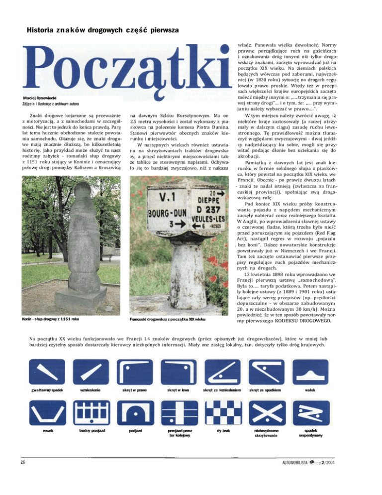 Historia znaków drogowych część pierwsza Maciej Rynowiecki Zdjęcia i ilustracje z archiwum autora Znaki drogowe kojarzone są przeważnie z motoryzacją, a z samochodami w szczegól ności. Nie jest to jednak do końca prawdą. Parę lat temu hucznie obchodzono stulecie powsta nia samochodu. Okazuje się, że znaki drogo we mają znacznie dłuższą, bo kilkusetletnią historię. Jako przykład może służyć tu nasz rodzimy zabytek - romański słup drogowy z 1151 roku stojący w Koninie i oznaczający połowę drogi pomiędzy Kaliszem a Kruszwicą Konin - słup drogowy z 1151 roku władz. Panowała wielka dowolność. Normy prawne porządkujące ruch na gościńcach i oznakowania dróg innymi niż tylko drogo wskazy znakami, zaczęto wprowadzać już na początku XIX wieku. Na ziemiach polskich będących wówczas pod zaborami, najwcześ niej (w 1820 roku) sytuację na drogach regu lowało prawo pruskie. Wtedy też w przepi sach większości krajów europejskich zaczęto mówić między innymi o: „... trzymaniu się pra wej strony drogi"... i o tym, że: „... przy wymi janiu należy wybaczać w prawo....". na dawnym Szlaku Bursztynowym. Ma on W tym miejscu należy zwrócić uwagę, iż 2,5 metra wysokości i został wykonany z pia niektóre kraje zastosowały (a raczej utrzy skowca na polecenie komesa Piotra Dunina. mały w dalszym ciągu) zasadę ruchu lewo Stanowi pierwowzór obecnych znaków kie stronnego. Tę prawidłowość można tłuma runku i miejscowości. czyć względami zwyczajowymi - dwaj jeźdź cy nadjeżdżający ku sobie, mogli się przy W następnych wiekach również ustawia witać podając dłonie bez uciekania się do no na skrzyżowaniach traktów drogowska akrobacji. zy, a przed niektórymi miejscowościami tak że tablice ze stosownymi napisami. Odbywa Pamiątką z dawnych lat jest znak kie ło się to bardziej zwyczajowo, niż z nakazu runku w formie solidnego słupa z piaskow ca, który powstał na początku XIX wieku we Francji. Obecnie - po prawie dwustu latach - znaki te nadal istnieją (zwłaszcza na fran cuskiej prowincji), spełniając swą drogowskazową rolę. Pod koniec XIX wieku próby konstruo wania pojazdu z napędem mechanicznym zaczęły nabierać coraz realniejszego kształtu. W Anglii, po wprowadzeniu sławnej ustawy o czerwonej fladze, którą trzeba było nieść przed poruszającym się pojazdem (Red Flag Act), nastąpił regres w rozwoju „pojazdu . bez koni". Dalsze nowatorskie konstrukcje powstawały już w Niemczech i we Francji. Tam też zaczęto ustanawiać pierwsze prze pisy regulujące ruch pojazdów mechanicz nych na drogach. 13 kwietnia 1898 roku wprowadzono we Francji pierwszą ustawę „samochodową". Była to.... taryfa podatkowa. Potem nastąpi ły kolejne ustawy (z 1889 i 1901 roku) usta lające cały szereg przepisów (np. prędkości dopuszczalne - w obszarze zabudowanym 20, a w niezabudowanym 30 km/h). Można powiedzieć, że w ten sposób powstawały nor Francuski drogowskaz z początku XIX wieku my pierwszego KODEKSU DROGOWEGO. Na początku XX wieku funkcjonowało we Francji 14 znaków drogowych (prócz opisanych już drogowskazów), które w mniej lub bardziej czytelny sposób dostarczały kierowcy niezbędnych informacji. Miały one zasięg lokalny, tzn. dotyczyły tylko dróg krajowych. gwałtowny spadek rowek 26 wzniesienie trudny przejazd skręt w prawo podjazd skręt w lewo przejazd przez tor kolejowy skręt ze wzniesieniem zły bruk skręt ze spadkiem niebezpieczne skrzyżowanie wałek spadek serpentynowy W roku 1909 z inicjatywy francuskiego ministerstwa robót publicznych zebrała się w Paryżu Międzynarodowa Komisja powołana w celu opracowania kodeksu drogowego. Oprócz wielu przepisów porządkujących wyposażenie techniczne samochodów (np. o oświetleniu pojazdu i o posiadaniu tablicy rejestracyjnej), ustanowiono pierwsze znaki drogowe. Było to cztery znaki w formie niebieskich okrą głych tarcz z białymi symbolami w środku. Stosowano także sporadycznie piąty znak oznaczający brak przejazdu. Ustalenia Komisji przyjęła większość krajów europejskich. wygórowane mostki niewidoczne i ostre zakręty zamykane przejazdy kolejowe skrzyżowanie dróg przerwa w komunikacji 26 września 1926 roku na zwołanej kolejnej Konwencji w Paryżu dokonano kilku zmian w przepisach. Między innymi zmieniono formę znaków (kształt trójkątny) i dodano dwa nowe symbole. wygórowane mostki niewidoczne i ostre zakręty zamykane przejazdy kolejowe skrzyżowanie dróg wszelkie inne niebezpieczeństwa niezamykane przejazdy kolejowe Po odzyskaniu niepodległości w roku 1919, Polska ratyfikowała ustalenia Komi sji z 1909 roku. Wtedy też nasze państwo otrzymało jako międzynarodowy znak roz poznawczy symbol „PL". Warszawa. Znak informujący o postoju dorożek samochodowych (dorożki konne mogą korzystać z postojów tylko na jezdniach niewyasfaltowanych) Znak na skrzyżowaniu w Paryżu, wyrażający apel do przechodniów, by udzielali pomocy niewidomym przy przechodzeniu przez jezdnię. Mając do dyspozycji zaledwie sześć sym boli, ówcześni organizatorzy ruchu drogo wego bardzo często stosowali znaki dodat kowe. Te dodatkowe znaki były opracowywane na aktual ne miejscowe zapotrze\ bowanie. Często posia dały odpowiedni pik togram. Zawsze jed nak zwierały sto sowny napis z infor macjami dla uczest ników ruchu drogo wego. Oto przykłady takich znaków z lat 20. ubiegłego wieku z ulic Warszawy i Paryża. OasignFofiHn.PL i 27
