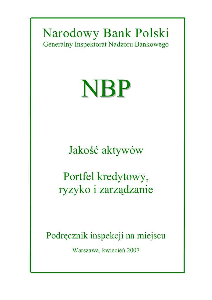 Narodowy Bank Polski Generalny Inspektorat Nadzoru Bankowego NBP Jakość aktywów Portfel kredytowy, ryzyko i zarządzanie Podręcznik inspekcji na miejscu Warszawa, kwiecień 2007 PORTFEL KREDYTOWY RYZYKO I ZARZĄDZANIE Narodowy Bank Polski Podręcznik inspekcji na miejscu SPIS TREŚCI: WSTĘP ............................................................................................................................................................ 2 POZIOM RYZYKA OBCIĄŻAJĄCEGO PORTFEL KREDYTYOWY................................................. 3 1. OCENA RYZYKA W PORTFELU KREDYTOWYM .......................................................................... 3 1.1. RYZYKO POJEDYNCZEGO KREDYTU ....................................................................................................... 4 1.2. RYZYKO PORTFELA KREDYTOWEGO .................................................................................................... 10 2. RODZAJE KREDYTÓW ........................................................................................................................ 14 2.1. KREDYTY DLA PODMIOTÓW GOSPODARCZYCH .................................................................................... 15 2.2. KREDYTY DLA OSÓB FIZYCZNYCH ....................................................................................................... 20 3. PRAWNE ZABEZPIECZENIE KREDYTÓW ..................................................................................... 21 3.1. PRZEZNACZENIE I CECHY PRAWNYCH ZABEZPIECZEŃ KREDYTU .......................................................... 21 3.2. ZASADY POLITYKI BANKU DOTYCZĄCE ZABEZPIECZEŃ........................................................................ 24 3.3. USTANOWIENIE I UDOKUMENTOWANIE ZABEZPIECZENIA .................................................................... 25 3.4. OBOWIĄZKI I UPRAWNIENIA BANKU ZWIĄZANE Z PRZYJĘCIEM PRAWNEGO ZABEZPIECZENIA. ............. 27 3.5. ZASPOKOJENIE ROSZCZEŃ BANKU Z PRZYJĘTYCH ZABEZPIECZEŃ. ....................................................... 28 3.6. WYGAŚNIĘCIE ZABEZPIECZENIA. ......................................................................................................... 28 3.7. USTALANIE WARTOŚCI PRZEPŁYWÓW PIENIĘŻNYCH Z ZABEZPIECZEŃ ZGODNIE Z MSR/MSSF ........... 30 3.8. RODZAJE PRAWNYCH ZABEZPIECZEŃ EKSPOZYCJI KREDYTOWYCH...................................................... 31 4. SEKURYTYZACJA................................................................................................................................. 50 ZARZĄDZANIE RYZYKIEM PORTFELA KREDYTOWEGO ........................................................... 58 5. ZASADY POLITYKI KREDYTOWEJ ................................................................................................. 58 6. PROCES KREDYTOWANIA................................................................................................................. 66 7. WEWNĘTRZNY SYSTEM PRZEGLĄDU NALEŻNOŚCI................................................................ 70 8. WYCENA EKSPOZYCJI KREDYTOWYCH...................................................................................... 75 8.1. SZACOWANIE UTRATY WARTOŚCI EKSPOZYCJI KREDYTOWYCH ZGODNIE Z MSR 39 ........................... 76 8.2. KLASYFIKACJA EKSPOZYCJI KREDYTOWYCH I TWORZENIE REZERW CELOWYCH ZGODNIE Z ROZPORZĄDZENIEM MINISTRA FINANSÓW Z DNIA 10 GRUDNIA 2003 R. W SPRAWIE ZASAD TWORZENIA REZERW NA RYZYKO ZWIĄZANE Z DZIAŁALNOŚCIĄ BANKÓW ..................................................................... 82 8.3. TWORZENIE INNYCH REZERW NA RYZYKO ZWIĄZANE Z DZIAŁALNOŚCIĄ BANKÓW ............................. 88 8.4. TESTY WARUNKÓW SKRAJNYCH .......................................................................................................... 89 9. SYSTEM KONTROLI WEWNĘTRZNEJ ............................................................................................ 90 9.1. ROLA RADY NADZORCZEJ, ZARZĄDU, WYSPECJALIZOWANYCH KOMITETÓW ...................................... 90 9.2. SYSTEM INFORMACJI ZARZĄDCZEJ ....................................................................................................... 91 9.3. KONTROLA WEWNĘTRZNA ................................................................................................................... 93 10. RESTRUKTURYZACJA I WINDYKACJA ....................................................................................... 95 11. CELE INSPEKCJI ................................................................................................................................. 98 12. PROCEDURY INSPEKCJI................................................................................................................... 99 1 PORTFEL KREDYTOWY RYZYKO I ZARZĄDZANIE Narodowy Bank Polski Podręcznik inspekcji na miejscu WSTĘP Niniejszy rozdział omawia działalność kredytową banku oraz przedstawia wytyczne odnośnie badania ryzyka obciążającego portfel kredytowy oraz jakości zarządzania tym ryzykiem. Działalność bankowa polega na podejmowaniu kontrolowanego ryzyka celem uzyskania określonych przychodów. Udzielanie kredytów, z natury rzeczy, należy do operacji bankowych obarczonych ryzykiem. Ryzyko pociąga za sobą pewne koszty, a przychody uzyskane z operacji muszą zapewnić zarówno pokrycie tych kosztów, rozwój banku, jak i generowanie zysków dla akcjonariuszy. System zarządzania ryzykiem w banku powinien zapewnić właściwe identyfikowanie, mierzenie, monitorowanie i kontrolowanie ryzyka w taki sposób, aby zapobiec przerodzeniu się potencjalnych problemów jakościowych w rzeczywiste problemy i wymierne straty. Banki muszą zatem identyfikować, mierzyć, kontrolować i monitorować podejmowane ryzyko, a także oceniać ryzyko wynikające z działalności planowanej na przyszłość. Ostrożnościowe podejmowanie ryzyka oznacza utrzymywanie zdrowej równowagi pomiędzy prowadzenie