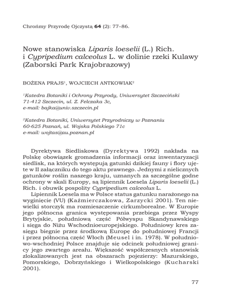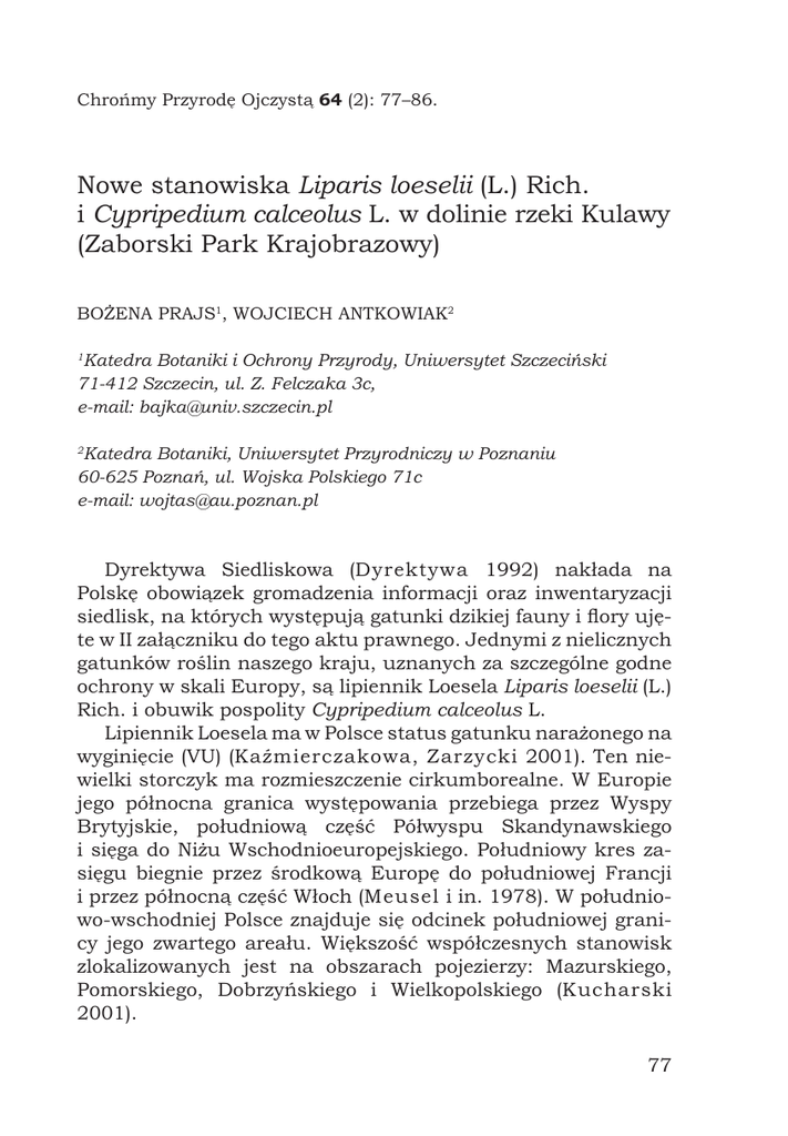 Chrońmy Przyrodę Ojczystą 64 (2): 77–86. Nowe stanowiska Liparis loeselii (L.) Rich. i Cypripedium calceolus L. w dolinie rzeki Kulawy (Zaborski Park Krajobrazowy) BOŻENA PRAJS1, WOJCIECH ANTKOWIAK2 Katedra Botaniki i Ochrony Przyrody, Uniwersytet Szczeciński 71-412 Szczecin, ul. Z. Felczaka 3c, e-mail: [email protected] 1 Katedra Botaniki, Uniwersytet Przyrodniczy w Poznaniu 60-625 Poznań, ul. Wojska Polskiego 71c e-mail: [email protected] 2 Dyrektywa Siedliskowa (Dyrektywa 1992) nakłada na Polskę obowiązek gromadzenia informacji oraz inwentaryzacji siedlisk, na których występują gatunki dzikiej fauny i flory ujęte w II załączniku do tego aktu prawnego. Jednymi z nielicznych gatunków roślin naszego kraju, uznanych za szczególne godne ochrony w skali Europy, są lipiennik Loesela Liparis loeselii (L.) Rich. i obuwik pospolity Cypripedium calceolus L. Lipiennik Loesela ma w Polsce status gatunku narażonego na wyginięcie (VU) (Kaźmierczakowa, Zarzycki 2001). Ten niewielki storczyk ma rozmieszczenie cirkumborealne. W Europie jego północna granica występowania przebiega przez Wyspy Brytyjskie, południową część Półwyspu Skandynawskiego i sięga do Niżu Wschodnioeuropejskiego. Południowy kres zasięgu biegnie przez środkową Europę do południowej Francji i przez północną część Włoch (Meusel i in. 1978). W południowo-wschodniej Polsce znajduje się odcinek południowej granicy jego zwartego areału. Większość współczesnych stanowisk zlokalizowanych jest na obszarach pojezierzy: Mazurskiego, Pomorskiego, Dobrzyńskiego i Wielkopolskiego (Kucharski 2001). 77 B. Prajs i W. Antkowiak Lipiennik osiąga wysokość 20 cm. Ma trójkątną na przekroju, nagą łodygę, na której osadzone są najczęściej dwa lub czasami trzy podługowato-eliptyczne lub lancetowate, wznoszące się ku górze liście. Grono buduje 1–18 zółtozielonkawych kwiatów (Szlachetko, Skakuj 1996). Gatunek ten, związany z siedliskami wilgotnych łąk i torfowisk, uważany jest za charakterystyczny dla zespołu Orchido-Schoenetum nigricantis Oberd. 1957 i związku Caricion davallianae Klika 1934 (Matuszkiewicz 2005). Obuwik pospolity jest w Polsce również gatunkiem narażonym na wyginięcie (VU) (Kaźmierczakowa, Zarzycki 2001). Jest rośliną należącą do elementu holarktycznego, rozmieszczoną w Europie od Półwyspu Bałkańskiego na południu, po Półwysep Skandynawski na północy, na wschodzie po południową część środkowej Rosji i środkową Europę na zachodzie (Meusel i in. 1978). W Polsce występuje na całym obszarze, choć zwarty areał tego gatunku obejmuje południowo-wschodnią i północno-wschodnią część kraju; największe zagęszczenie stanowisk znajduje się na Wyżynie Lubelskiej, Roztoczu oraz w południowej części Wyżyny Krakowsko-Częstochowskiej. Obuwik jest najbardziej dekoracyjnym storczykiem we florze Polski. Jego pędy osiągają wysokość do 50 cm i mają od dwóch do czterech żywozielonych, jajowatych lub jajowato-lancetowatych podłużnie fałdowanych liści. Kwiaty są duże, z jasnożółtą warżką w kształcie trzewika i skręconymi, lancetowatymi, czerwono-brązowymi okwiatolistkami. Rośnie na siedliskach zasobnych w węglan wapnia, w grądach, żyznych buczynach, dąbrowach, borach mieszanych i ciepłolubnych zaroślach oraz murawach kserotermicznych (Świeboda 1976). Nowe stanowiska lipiennika Loesela i obuwika pospolitego zlokalizowano w trakcie badań nad roślinnością w dolinie rzeki Kulawy (Antkowiak i in. 2006). Rzeka Kulawa, o długości około 7,5 km, płynie dnem głęboko wciętej doliny o południkowym przebiegu, w zachodniej części sandru Borów Tucholskich, w Zaborskim Parku Krajobrazowym. Jest to obszar Natura 2000 „PLB220001 Wielki Sandr Brdy”. Dolina rzeki, będąca dawnym jeziorem rynnowym wypełnionym kredą jeziorną (Prusinkiewicz, Noryśkiewicz 1975), jest bardzo urozmaicona pod względem geomorfologii, warunków wod78 Nowe stanowiska Liparis loeselii i Cypripedium calceolus nych i glebowych, co – przy stosunkowo niskiej antropopresji – znajduje odzwierciedlenie w dużej różnorodności szaty roślinnej. Zlokalizowane są w niej trzy przepływowe jeziora – Głuche Duże, Głuche Małe i Sieczonek oraz ekosystemy integralnie związane z doliną, m.in. lasy bagienne, torfowiska i łąki mszarne oraz obszary źródliskowe. Występują tu bardzo liczne stanowiska rzadkich gatunków roślin, np. Equisetum telmateia, Aquilegia vulgaris, Dactylorhiza incarnata, Epipactis palustris, Stellaria crassifolia i Viola epipsila (Boiński 1988, Antkowiak i in. 2006). Przy południowo-wschodnim brzegu jeziora Głuche Małe (53°57’45’’ N, 17°32’15’’ E) w niecce stanowiącej dawną zatokę jeziora, otoczonej z trzech stron – południowej, wschodniej i zachodniej wysokimi zboczami doliny, a od strony północnej graniczącej z olszyną porastającą brzeg jeziora, znajduje się torfowisko przejściowe o powierzchni 0,95 ha (oddział 179i, Nadleśnictwo Przymuszewo, Leśnictwo Laska, ryc. 1). Jest to część użytku ekologicznego „Dolina Mnichów”. Torfowisko charakteryzuje się około 70-centymetrową warstwą silnie uwodnionego złoża torfu pokrywającego gytię organiczną. Ma ono zróżnicowany typ zasilania – wodą opadową, wodami przesiąkającymi z jeziora oraz wodami spływającymi ze stromych zboczy, których gleby – rędziny pojezierne – są bardzo zasobne w węglan wapnia (Dysarz 2003). Wpływa to na odczyn wody w torfowisku – jego wartość mierzona w dwóch miejscach centralnej części wynosiła 7,14 i 8,6 pH. Obszar torfowiska porośnięty jest przez mozaikę mszarnych, mszarno-turzycowych i szuwarowych zbiorowisk roślinnych, m.in. Caricetum paniculatae, Caricetum lasiocarpae, Caricetum davallianae, zbiorowisko Carex flava-Valeriana dioica oraz Menyanthes trifoliata-Sphagnum teres. W płacie o powierzchni 3 m2 tego ostatniego zbiorowiska, stwierdzono 7 osobn
