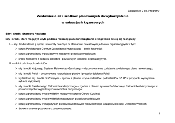 Załącznik nr 2 do „Programu” Zestawienie sił i środków planowanych do wykorzystania w sytuacjach kryzysowych Siły i środki Starosty Powiatu Siły i środki, które mogą być użyte podczas realizacji procedur zarządzania i reagowania dzielą się na 2 grupy: I. – siły i środki własne tj. sprzęt i materiały należące do starostwa i powiatowych jednostek organizacyjnych w tym: sprzęt Powiatowego Centrum Zarządzania Kryzysowego – środki łączności; sprzęt zgromadzony w powiatowym magazynie przeciwpowodziowym; środki finansowe z budżetu starostwa i powiatowych jednostek organizacyjnych. II. – siły i środki innych podmiotów: siły i środki Krajowego Systemu Ratowniczo-Gaśniczego – dysponowane na podstawie powiatowego planu ratowniczego; siły i środki Policji – dysponowane na podstawie planów i procedur działania Policji; wydzielone siły i środki Sił Zbrojnych – zgodnie z planem użycia oddziałów i pododdziałów SZ RP w przypadku wystąpienia sytuacji kryzysowej; siły i środki Państwowego Ratownictwa Medycznego – zgodnie z planem systemu Państwowego Ratownictwa Medycznego w postaci zespołów wyjazdowych ratownictwa medycznego; sprzęt zgromadzony w wojewódzkim magazynie sprzętu Obrony Cywilnej; sprzęt zgromadzony w wojewódzkich magazynach przeciwpowodziowych sprzęt zgromadzony w magazynach przeciwpowodziowych Wojewódzkiego Zarządu Melioracji i Urządzeń Wodnych; Środki finansowe pozyskane z budżetu państwa. 1 Jednostka ratowniczo-gaśnicza Krajowego Systemu RatowniczoGaśniczego Kompania wojewódzkiej brygady odwodowej Krajowego Systemu RatowniczoGaśniczego Kompania* wyznaczona do Centralnego Odwodu Operacyjnego Krajowego Systemu RatowniczoGaśniczego Specjalistyczna Grupa Ratownictwa Chemiczno Ekologicznego Kompania gaśnicza Specjalistyczna Grupa Ratownictwa WodnoNurkowego Specjalistyczna Grupa Ratownictwa Wysokościowego Grupa poszukiwawczoratownicza liczba jednostek liczba strażaków liczba kompanii liczba strażaków liczba kompanii liczba strażaków liczba kompanii liczba strażaków liczba grup liczba strażaków liczba grup liczba strażaków liczba grup liczba strażaków liczba grup liczba strażaków 2 125 0 0 0 0 0 0 1 12 1 10 1 10 0 0 RAZEM Wyszczególnienie Siły Państwowej Straży Pożarnej Liczba strażaków przeszkolonych do udzielania kwalifikowanej pierwszej pomocy 125 * kompanie (gaśnicza i specjalistyczna kompania powodziowa) PSP wchodzące w skład Wojewódzkiej Brygady Odwodowej są równocześnie siłami i środkami włączonymi do Centralnego Odwodu Operacyjnego RAZEM Wyszczególnienie Sprzęt Państwowej Straży Pożarnej Samochód ratownictwa Cysterna Sprzęt pływający gaśniczego technicznego chemicznego wodnego gaśnicza na paliwo na wodę pitną łódź ponton wieloosobowy Przenośne zapory przeciwpow odziowe (w metrach bieżących) 8 1 2 1 1 0 0 2 1 0 Namiot wieloosobowy Pompa o dużej wydajności Agregat* prądotwórczy 0 1 0 * agregaty prądotwórcze o mocy od 5 do 20 kW możliwe do użycia w sytuacjach kryzysowych, nie powodujące obniżenie gotowości operacyjnej jednostki ratowniczo-gaśniczej 2 Liczba policjantów nieetatowych pododdziałów prewencji Liczba policjantów ruchu drogowego Liczba policjantów przeszkolonych do działań minersko-pirotechnicznych Liczba policjantów przeszkolonych do udzielania pierwszej pomocy medycznej ciężarowy sanitarny osobowy /terenowy /furgon Wyszczególnienie Liczba policjantów oddziałów prewencji RAZEM 0 35 12 4 2 0 0 0 Śmigłowiec Agregat prądotwórczy Namiot wieloosobowy Kuchnia polowa 0 łodzie pontonowe Autobus łodzie Samochód na wodę pitną Wyszczególnienie Jednostki włączone do KSRG na paliwo RAZEM Siły i środki Ochotniczych i Zakładowych Straży Pożarnych (OSP, ZSP) Grupa ratownictwa chemicznego ZSP Samochody ratownictwa gaśniczego OSP i ZSP liczba jednostek OSP liczba jednostek ZSP łączna liczba strażaków liczba grup liczba strażaków lekkie średnie ciężkie 9 0 180 0 0 21 25 15 Cysterna Samochody ratownictwa chemicznego ZSP 0 Siły i środki Policji Sprzęt pływający 0 0 0 0 0 2 0 0 3 RAZEM 1 0 0 0 liczba izolatoriów liczba miejsc Dostępne łóżka w szpitalnych oddziałach chorób zakaźnych Planowane izolatoria 0 0 2 1 75 35 Łóżka w placówkach medycznych możliwe do uruchomienia w przypadku wystąpienia masowych zachorowań Komplety odzieży ochronnej 0 inne Laboratoria do badań wody żywności radiologicznych mikrobiologicznych Pracownicy medyczni Liczba stacji Sanitarno Epidemiologicznych Wyszczególnienie Siły i środki Państwowej Inspekcji Sanitarnej 4 Powiatowy Inspektorat Weterynarii w Kędzierzynie - Koźlu Wyszczególnienie Siły i środki Inspekcji Weterynaryjnej Komplety odzieży ochronnej Liczba placówek Inspekcji 1 Lekarze weterynarii 5 PIW 10 wolnej praktyki Przygotowane ekipy dezynfekcyjne Laboratoria L.p. Nazwa artykułu – sprzętu Liczba Zakłady przygotowane do utylizacji martwych zwierząt W posiadaniu PIW 0 1 1. Kombinezon KRUTEX 100 szt. ZHW w Opolu 2. Kombinezon Tychem-C 4szt. 3. Maska ochronna jednorazowa 50 szt. 4. Okulary ochronne 7 szt. 5. Rękawice jednorazowe 200 szt. 6. Worki sanitarne 100 szt. 7. Buty jednorazowe 500 szt. 8. Fartuch foliowy jednorazowy 450 szt. 500 szt. 9. Fartuch z flizeliny jednorazowy 10. Gogle ochronne 11. Kamizelka ostrzegawcza 12. Kombinezon jednorazowy z flizeliny 1600 szt. 13. Kombinezon TYVEK zmywalny 50 szt. 14. Mata dezynfekcyjna 100x60x2 1 szt. 15. Mata dezynfekcyjna 120x200 4 szt. 16. Obuwie kwaso-ługoodporne męskie 1 para 17. Obuwie kwaso-ługoodporne damskie 4 pary 18. Osłona obuwia TYVEK z podeszwą antypoślizgową 150 szt. 19. Półmaska z zaworem 100 szt. 20. Półmaska 3M+ pochłaniacz 21. Spodnie jednorazowe 22. Maska na twarz z pochłaniaczem 23. Czapka jednorazowa z flizeliny 24. Kombinezon ochronny z dł. rękawami i kapturem OP 1 Na terenie powiatu Brak. 7 szt. 9 szt. 1 kpl. 130 szt. 1 szt. 490 szt. 1 szt. 5 Siły i śr