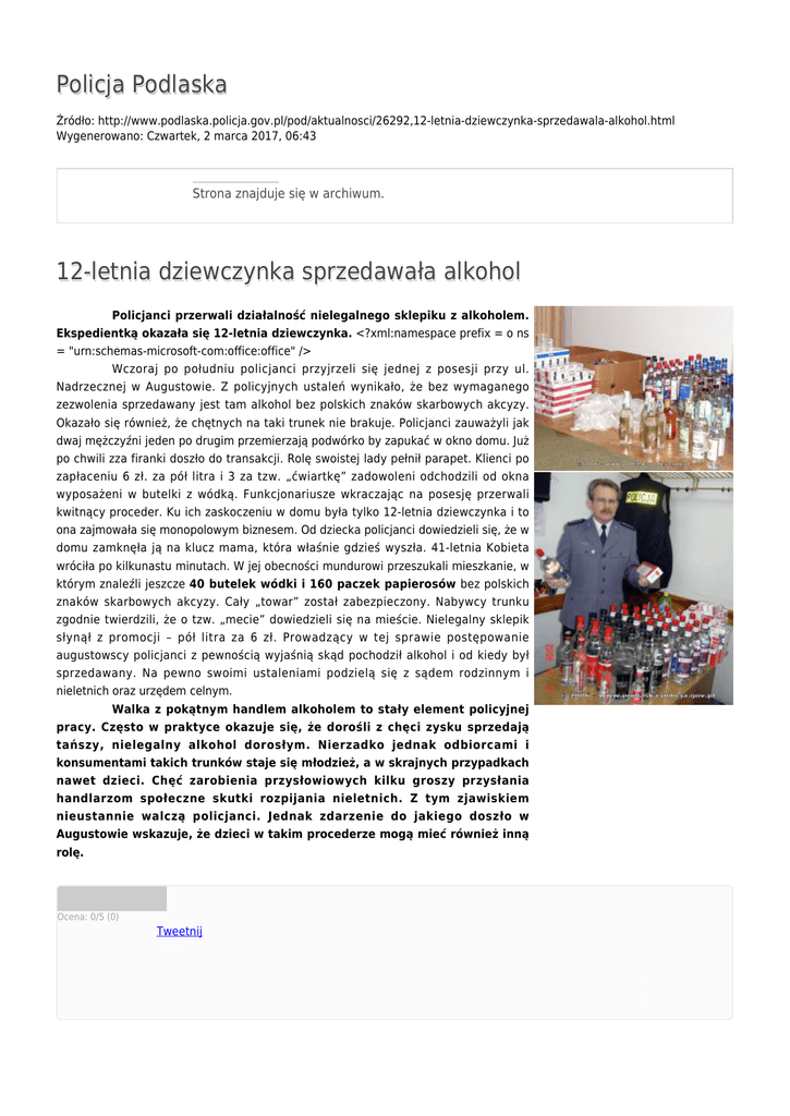 Policja Podlaska Źródło: http://www.podlaska.policja.gov.pl/pod/aktualnosci/26292,12-letnia-dziewczynka-sprzedawala-alkohol.html Wygenerowano: Czwartek, 2 marca 2017, 06:43 Strona znajduje się w archiwum. 12-letnia dziewczynka sprzedawała alkohol Policjanci przerwali działalność nielegalnego sklepiku z alkoholem. Ekspedientką okazała się 12-letnia dziewczynka. <?xml:namespace prefix = o ns = "urn:schemas-microsoft-com:office:office" /> Wczoraj po południu policjanci przyjrzeli się jednej z posesji przy ul. Nadrzecznej w Augustowie. Z policyjnych ustaleń wynikało, że bez wymaganego zezwolenia sprzedawany jest tam alkohol bez polskich znaków skarbowych akcyzy. Okazało się również, że chętnych na taki trunek nie brakuje. Policjanci zauważyli jak dwaj mężczyźni jeden po drugim przemierzają podwórko by zapukać w okno domu. Już po chwili zza firanki doszło do transakcji. Rolę swoistej lady pełnił parapet. Klienci po zapłaceniu 6 zł. za pół litra i 3 za tzw. „ćwiartkę” zadowoleni odchodzili od okna wyposażeni w butelki z wódką. Funkcjonariusze wkraczając na posesję przerwali kwitnący proceder. Ku ich zaskoczeniu w domu była tylko 12-letnia dziewczynka i to ona zajmowała się monopolowym biznesem. Od dziecka policjanci dowiedzieli się, że w domu zamknęła ją na klucz mama, która właśnie gdzieś wyszła. 41-letnia Kobieta wróciła po kilkunastu minutach. W jej obecności mundurowi przeszukali mieszkanie, w którym znaleźli jeszcze 40 butelek wódki i 160 paczek papierosów bez polskich znaków skarbowych akcyzy. Cały „towar” został zabezpieczony. Nabywcy trunku zgodnie twierdzili, że o tzw. „mecie” dowiedzieli się na mieście. Nielegalny sklepik słynął z promocji – pół litra za 6 zł. Prowadzący w tej sprawie postępowanie augustowscy policjanci z pewnością wyjaśnią skąd pochodził alkohol i od kiedy był sprzedawany. Na pewno swoimi ustaleniami podzielą się z sądem rodzinnym i nieletnich oraz urzędem celnym. Walka z pokątnym handlem alkoholem to stały element policyjnej pracy. Często w praktyce okazuje się, że dorośli z chęci zysku sprzedają tańszy, nielegalny alkohol dorosłym. Nierzadko jednak odbiorcami i konsumentami takich trunków staje się młodzież, a w skrajnych przypadkach nawet dzieci. Chęć zarobienia przysłowiowych kilku groszy przysłania handlarzom społeczne skutki rozpijania nieletnich. Z tym zjawiskiem nieustannie walczą policjanci. Jednak zdarzenie do jakiego doszło w Augustowie wskazuje, że dzieci w takim procederze mogą mieć również inną rolę. Ocena: 0/5 (0) Tweetnij