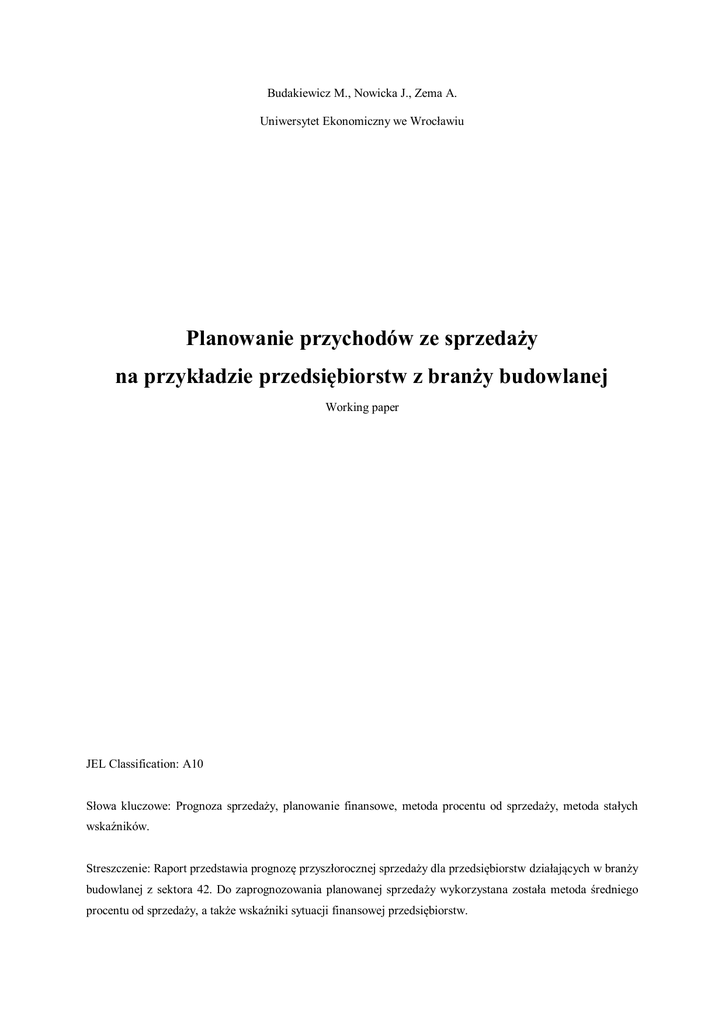 Budakiewicz M., Nowicka J., Zema A. Uniwersytet Ekonomiczny we Wrocławiu Planowanie przychodów ze sprzedaży na przykładzie przedsiębiorstw z branży budowlanej Working paper JEL Classification: A10 Słowa kluczowe: Prognoza sprzedaży, planowanie finansowe, metoda procentu od sprzedaży, metoda stałych wskaźników. Streszczenie: Raport przedstawia prognozę przyszłorocznej sprzedaży dla przedsiębiorstw działających w branży budowlanej z sektora 42. Do zaprognozowania planowanej sprzedaży wykorzystana została metoda średniego procentu od sprzedaży, a także wskaźniki sytuacji finansowej przedsiębiorstw. I. Wstęp Przedmiotem niniejszego raportu jest przedstawienie oraz uzasadnienie prognozy przyszłorocznej sprzedaży dla trzech przedsiębiorstw z sektora 42 tj. branży budowlanej. Pierwsze z analizowanych przedsiębiorstw powstało w wyniku przekształcenia państwowej firmy istniejącej od 1968r., natomiast sama spółka istnieje od 1988r. Przedmiotem działalności firmy jest realizacja bitumicznych robót drogowych. Kolejnym badanym przedsiębiorstwem jest firma, która istnieje na rynku od 1994r. Głównym profilem działalności spółki jest budowa oraz remonty dróg, ulic, placów i parkingów. Firma wykonuje prace w bardzo szerokim zakresie, począwszy od małych inwestycji, takich jak budowa i modernizacja dróg lokalnych i osiedlowych, do budowy nowych dróg o zróżnicowanej nawierzchni i rozbudowanej infrastrukturze. Ostatnim z analizowanych przedsiębiorstw jest firma, która również powstała w 1994r. Rodzaj działalności prowadzonej przez nią to szeroko rozumiane, kompleksowe wykonywanie usług w zakresie budowy, modernizacji i remontów nawierzchni drogowych , zaczynając od robót przygotowawczych, przez roboty rozbiórkowe, ziemne i podbudowy, a kończąc na robotach nawierzchniowych i wykończeniowych. Firma umocniła swoją pozycję na lokalnym rynku, stała się groźną konkurencją dla Państwowych przedsiębiorstw zajmujących się robotami utrzymaniowymi dróg i ulic. II. Opis teoretyczny metody Ważnym pojęciem wykorzystanym w raporcie jest planowanie finansowe. W większym znaczeniu, przez planowanie finansowe w skali przedsiębiorstwa rozumiemy zespół czynności zmierzających do określenia przyszłego, w ramach określonego horyzontu czasowego, stanu zasobów pieniężnych w przedsiębiorstwie umożliwiających realizację celów i potrzeb rozwojowych oraz jednocześnie zapewniających płynność finansową firmy. W szerokim sensie natomiast planowanie finansowe oznacza projekcję zjawisk ekonomicznych w ujęciu pieniężnym.1 Do zadań planowania finansowego zalicza się: wyznaczanie celów i zadań przedsiębiorstwa w ujęciu finansowym, wiązanie podejmowanych decyzji z wielkościami finansowymi dotyczącymi wartości przedsiębiorstwa, jego wyników finansowych, majątku i kapitałów, należności i zobowiązań, itp. projekcję wykorzystania alternatywnych źródeł finansowania, wykorzystanie planowania finansowego do oceny uzyskanych wyników. 2 Większość decyzji podejmowanych w przedsiębiorstwie dotyczą przyszłości. Dotyczą one głównie budżetów działów jednostki gospodarczej. Przedsiębiorstwo, aby mogło racjonalnie funkcjonować powinno stosować takie metody wspomagające proces zarządzania, które obarczone są najmniejszym błędem, czyli są najbardziej dokładne. Do narzędzi wspomagających proces zarządzania zalicza się między innymi prognozowanie.3 1 Komorowski J., Planowanie finansowe w przedsiębiorstwie, ODDK, Gdańsk 2001, s. 29. Cieślak M., Prognozowanie gospodarcze: metody i zastosowanie, PWN, Warszawa 2001, s. 252. 3 Gwiazda K., Wykorzystanie prognoz finansowych w planowaniu działalności przedsiębiorstw, Wrocław. 2 Prognoza sprzedaży jest to ustalenie oczekiwanych przyszłych przychodów ze sprzedaży. Zazwyczaj jest ona oparta na analizie trendów przychodów ze sprzedaży w poprzednich okresach działania przedsiębiorstwa. Na podstawie danych historycznych, wyznaczana jest linia regresji, charakteryzująca przeciętny poziom przychodów ze sprzedaży w przeszłości. Następnie na podstawie założenia, że przyszłe przychody ze sprzedaży nie powinny znacząco odbiegać od poziomu wyznaczonego przez linię regresji, wyznacza się prognozowany poziom przychodów ze sprzedaży. 4 Najprostszą i zarazem najczęściej wykorzystywaną metodą do konstrukcji prognozowanych sprawozdań finansowych jest metoda procentu od sprzedaży, inaczej metoda stałych wskaźników. Można zaliczyć ją do metod analitycznych, ponieważ na podstawie prognozy przychodów ze sprzedaży dokonujemy oszacowania składników sprawozdania finansowego. Zakłada ona, że wskaźniki charakteryzujące przedsiębiorstwo (takie jak wskaźniki zadłużenia, wskaźniki płynności), będą w okresie na który jest sporządzona prognoza, na tym samym poziomie, co w okresie poprzedzającym prognozę. Polega ona na założeniu, że większość elementów sprawozdania finansowego jest uzależniona od wielkości sprzedaży.5 III. Praktyczny przykład zastosowania z wykorzystaniem danych rzeczywistych pochodzących z bazy Monitor Polski B Podczas prognozowania przychodów ze sprzedaży metodą procentu od sprzedaży wykorzystano dane historyczne analizowanych przedsiębiorstw. Tabela 1. Dane historyczne analizowanych przedsiębiorstw Przedsiębiorstwo 1 Przedsiębiorstwo 2 Przedsiębiorstwo 3 CR (Przychody ze sprzedaży) 63 746 701 zł 41 994 597,24 zł 70 716 415 zł VC (zmienne koszty) 62 459 830 zł 34 590 377,70 zł 53 811 699 zł Dane przedsiębiorstwa w roku 2011: FC (koszty stałe) należności zapasy środki pieniężne zobowiązania bieżące NCE (koszty bezwydatkowe) AT (Aktywa Trwałe) g (stopa planowana ze sprzedaży) CE (koszty wydatkowe, tj. koszty stałe + koszty zmienne) 1 697 724 zł 6 040 063,91 zł 4 644 208 zł 11 638 373 zł 5 998 175,99 zł 18 926 718 zł 0,00 zł 182 323,45 zł 242 004 zł 22 3