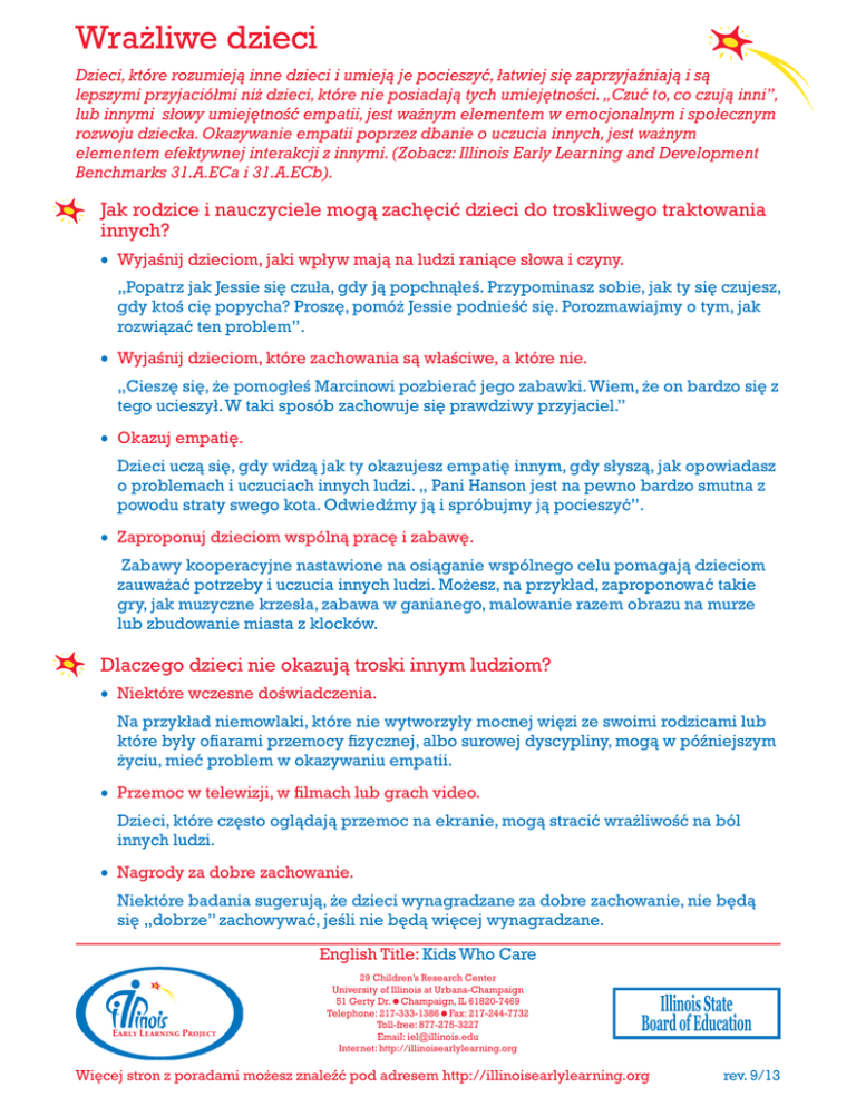 Wrażliwe dzieci Dzieci, które rozumieją inne dzieci i umieją je pocieszyć, łatwiej się zaprzyjaźniają i są lepszymi przyjaciółmi niż dzieci, które nie posiadają tych umiejętności. „Czuć to, co czują inni”, lub innymi słowy umiejętność empatii, jest ważnym elementem w emocjonalnym i społecznym rozwoju dziecka. Okazywanie empatii poprzez dbanie o uczucia innych, jest ważnym elementem efektywnej interakcji z innymi. (Zobacz: Illinois Early Learning and Development Benchmarks 31.A.ECa i 31.A.ECb). Jak rodzice i nauczyciele mogą zachęcić dzieci do troskliwego traktowania innych? Wyjaśnij dzieciom, jaki wpływ mają na ludzi raniące słowa i czyny. „Popatrz jak Jessie się czuła, gdy ją popchnąłeś. Przypominasz sobie, jak ty się czujesz, gdy ktoś cię popycha? Proszę, pomóż Jessie podnieść się. Porozmawiajmy o tym, jak rozwiązać ten problem”. Wyjaśnij dzieciom, które zachowania są właściwe, a które nie. „Cieszę się, że pomogłeś Marcinowi pozbierać jego zabawki. Wiem, że on bardzo się z tego ucieszył. W taki sposób zachowuje się prawdziwy przyjaciel.” Okazuj empatię. Dzieci uczą się, gdy widzą jak ty okazujesz empatię innym, gdy słyszą, jak opowiadasz o problemach i uczuciach innych ludzi. „ Pani Hanson jest na pewno bardzo smutna z powodu straty swego kota. Odwiedźmy ją i spróbujmy ją pocieszyć”. Zaproponuj dzieciom wspólną pracę i zabawę. Zabawy kooperacyjne nastawione na osiąganie wspólnego celu pomagają dzieciom zauważać potrzeby i uczucia innych ludzi. Możesz, na przykład, zaproponować takie gry, jak muzyczne krzesła, zabawa w ganianego, malowanie razem obrazu na murze lub zbudowanie miasta z klocków. Dlaczego dzieci nie okazują troski innym ludziom? Niektóre wczesne doświadczenia. Na przykład niemowlaki, które nie wytworzyły mocnej więzi ze swoimi rodzicami lub które były ofiarami przemocy fizycznej, albo surowej dyscypliny, mogą w późniejszym życiu, mieć problem w okazywaniu empatii. Przemoc w telewizji, w filmach lub grach video. Dzieci, które często oglądają przemoc na ekranie, mogą stracić wrażliwość na ból innych ludzi. Nagrody za dobre zachowanie. Niektóre badania sugerują, że dzieci wynagradzane za dobre zachowanie, nie będą się „dobrze” zachowywać, jeśli nie będą więcej wynagradzane. English Title: Kids Who Care Early Learning Project 29 Children’s Research Center University of Illinois at Urbana-Champaign 51 Gerty Dr.Champaign, IL 61820-7469 Telephone: 217-333-1386Fax: 217-244-7732 Toll-free: 877-275-3227 Email: [email protected] Internet: http://illinoisearlylearning.org Illinois State Board of Education Więcej stron z poradami możesz znaleźć pod adresem http://illinoisearlylearning.org rev. 9/13