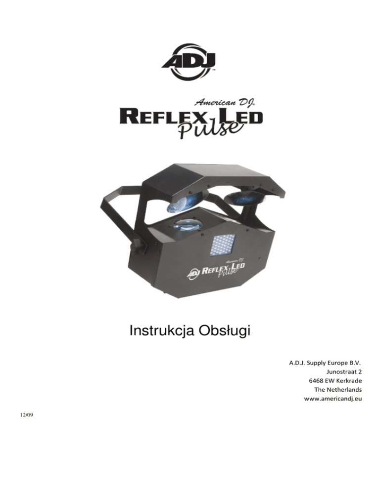 Instrukcja Obsługi A.D.J. Supply Europe B.V. Junostraat 2 6468 EW Kerkrade The Netherlands www.americandj.eu 12/09 Spis treści WSTĘP ..................................................................................................................................................................................... 3 CHARAKTERYSTYKA ................................................................................................................................................................. 3 ŚRODKI OSTROŻNOŚCI ............................................................................................................................................................ 3 INSTRUKCJE OGÓLNE .............................................................................................................................................................. 4 DZIAŁANIE ............................................................................................................................................................................... 4 WYMIANA BEZPIECZNIKA ....................................................................................................................................................... 5 CZYSZCZENIE ........................................................................................................................................................................... 5 USUWANIE USTEREK............................................................................................................................................................... 5 SPECYFIKACJA ......................................................................................................................................................................... 6 ROHS oraz WEEE ..................................................................................................................................................................... 7 A.D.J. Supply Europe B.V. – www.americandj.eu – Reflex Pulse LED Instrukcja Obsługi Str. 2 INTRODUZIONE WSTĘP Wypakowanie: Dziękujemy za zakup urządzenia świetlnego Reflex Pulse LED™ firmy American DJ®. KaŜdy egzemplarz urządzenia Reflex Pulse LED™ został gruntownie przetestowany, co jest gwarancją jego prawidłowego funkcjonowania. Przed rozpakowaniem naleŜy sprawdzić czy opakowanie nie uległo uszkodzeniu w czasie transportu. W razie stwierdzenia uszkodzenia opakowania, naleŜy dokładnie sprawdzić, czy nie nastąpiło uszkodzenie sprzętu oraz upewnić się, Ŝe wszystkie części konieczne do obsługi urządzenia przybyły w stanie nienaruszonym. W razie stwierdzenia usterek lub braku części, naleŜy skontaktować się z bezpłatnym biurem obsługi klienta w celu uzyskania dalszych instrukcji. Prosimy o taki kontakt przed podjęciem decyzji o zwrocie urządzenia do sprzedawcy. Wstęp: Reflex Pulse LED™ jest urządzeniem wytwarzającym unikalne efekty świetlne z wykorzystaniem podstawowych kolorów RGB (R = czerwony, G = zielony, B = niebieski). Urządzenie posiada dwie ruchome głowice, które pracują niezaleŜnie od siebie oraz posiada funkcję strobowania. Reflex Pulse LED™ pracuje jedynie w trybie reakcji na dźwięk (Sound Active). W celu osiągnięcia lepszych efektów poprzez poprawienie widoczności projektowanej wiązki światła, naleŜy uŜyć maszyny mgielnej lub dymu do efektów specjalnych. Obsługa klienta: W razie jakichkolwiek problemów, prosimy o kontakt z zaufanym punktem sprzedaŜy American Audio. Istnieje równieŜ moŜliwość bezpośredniego kontaktu z nami. MoŜna to zrobić poprzez naszą stronę internetową www.americandj.eu oraz pisząc na adres: [email protected]. OstrzeŜenie! Aby zapobiec lub zmniejszyć ryzyko poraŜenia prądem lub poŜaru, nie włączaj urządzenia w warunkach deszczowych lub przy podwyŜszonej wilgotności powietrza. Uwaga! Urządzenie nie zawiera Ŝadnych elementów przeznaczonych do serwisowania przez uŜytkownika. Gwarancja na urządzenie traci waŜność, jeśli uŜytkownik zdecyduje się na samowolną naprawę którejkolwiek części. JeŜeli jakaś część wymaga naprawy to naleŜy się skontaktować z American DJ®. PROSIMY o recycling opakowania, jeśli to moŜliwe. CHARAKTERYSTYKA • • • • • • • Dwie Poruszające Się NiezaleŜnie od Siebie Głowice. Kompaktowa Obudowa High-Tech Zamontowany na Stałe Uchwyt do Zawieszenia. Mikrofon Wewnętrzny. Reaguje na Dźwięk. Diody LED o Bardzo Długim Czasie śycia (100 000 roboczogodzin). UŜytkownik Wybiera Napięcie. ŚRODKI OSTROśNOŚCI Środki OstroŜności: • Aby zmniejszyć ryzyko poraŜenia prądem lub poŜaru, nie włączaj urządzenia w warunkach deszczowych lub przy podwyŜszonej wilgotności powietrza. • Trzymaj urządzenie z dala od wody lub innych płynów. • Nie uruchamiaj urządzenia, jeśli przewód zasilający jest uszkodzony. • Nie próbuj usunąć lub wyłamać bolca uziemienia z wtyczki. Jego zadaniem jest zabezpieczenie przed poraŜeniem prądem i poŜarem w wypadku zwarcia wewnątrz urządzenia. • Urządzenie jest przeznaczone tylko do uŜytku wewnątrz budynku. Gwarancja na urządzenie straci waŜność, jeśli zostanie ono uŜyte na dworze. A.D.J. Supply Europe B.V. – www.americandj.eu – Reflex Pulse LED Instrukcja Obsługi Str. 3 INSTRUKCJE OGÓLNE Aby w pełni wykorzystać moŜliwości urządzenia, prosimy o przeczytanie instrukcji obsługi i zapoznanie się z podstawowymi funkcjami urządzenia. Instrukcja zawiera waŜne informacje dotyczące bezpieczeństwa obsługi oraz sposobu konserwacji urządzenia. Prosimy o zachowanie instrukcji obsługi w celu ponownego uŜycia. DZIAŁANIE Wstęp: Urządzenie Reflex Pulse LED™ firmy American DJ® wytwarza podwójny efekt Moonflower (ruchome kolorowe drobne wzory świetlne). Jest ono lekkie, ma niewielkie rozmiary i jest łatwe w obsłudze. Urządzenie zostało zaprojektowane z myślą o DJach pracujących w kilku róŜnych miejscach, świ