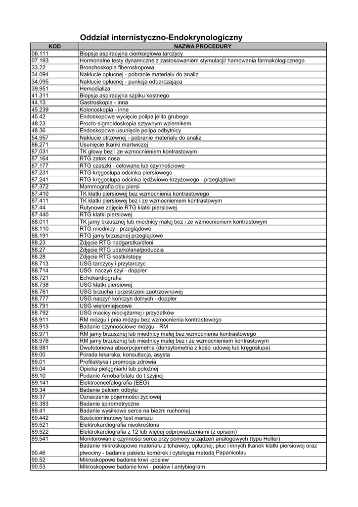 Oddział internistyczno-Endokrynologiczny KOD 06.111 07.193 33.22 34.094 34.095 39.951 41.311 44.13 45.239 45.42 48.23 48.36 54.957 86.271 87.031 87.164 87.177 87.231 87.241 87.372 87.410 87.411 87.44 87.440 88.011 88.110 88.191 88.23 88.27 88.28 88.713 88.714 88.721 88.738 88.761 88.777 88.791 88.792 88.911 88.913 88.971 88.976 88.981 89.00 89.01 89.04 89.10 89.141 89.34 89.37 89.383 89.41 89.442 89.521 89.522 89.541 90.46 90.52 90.53 NAZWA PROCEDURY Biopsja aspiracyjna cienkoigłowa tarczycy Hormonalne testy dynamiczne z zastosowaniem stymulacji/ hamowania farmakologicznego Bronchoskopia fiberoskopowa Nakłucie opłucnej - pobranie materiału do analiz Nakłucie opłucnej - punkcja odbarczająca Hemodializa Biopsja aspiracyjna szpiku kostnego Gastroskopia - inna Kolonoskopia - inne Endoskopowe wycięcie polipa jelita grubego Procto-sigmoidoskopia sztywnym wziernikem Endoskopowe usunięcie polipa odbytnicy Nakłucie otrzewnej - pobranie materiału do analiz Usunięcie tkanki martwiczej TK głowy bez i ze wzmocnieniem kontrastowym RTG zatok nosa RTG czaszki - celowane lub czynnościowe RTG kręgosłupa odcinka piersiowego RTG kręgosłupa odcinka lędźwiowo-krzyżowego - przeglądowe Mammografia obu piersi TK klatki piersiowej bez wzmocnienia kontrastowego TK klatki piersiowej bez i ze wzmocnieniem kontrastowym Rutynowe zdjęcie RTG klatki piersiowej RTG klatki piersiowej TK jamy brzusznej lub miednicy małej bez i ze wzmocnieniem kontrastowym RTG miednicy - przeglądowe RTG jamy brzusznej przeglądowe Zdjęcie RTG nadgarstka/dłoni Zdjęcie RTG uda/kolana/podudzia Zdjęcie RTG kostki/stopy USG tarczycy i przytarczyc USG naczyń szyi - doppler Echokardiografia USG klatki piersiowej USG brzucha i przestrzeni zaotrzewnowej USG naczyń kończyn dolnych - doppler USG wielomiejscowe USG macicy nieciężarnej i przydatków RM mózgu i pnia mózgu bez wzmocnienia kontrastowego Badanie czynnościowe mózgu - RM RM jamy brzusznej lub miednicy małej bez wzmocnienia kontrastowego RM jamy brzusznej lub miednicy małej bez i ze wzmocnieniem kontrastowym Dwufotonowa absorpcjometria (densytometria z kości udowej lub kręgosłupa) Porada lekarska, konsultacja, asysta Profilaktyka i promocja zdrowia Opieka pielęgniarki lub położnej Podanie Amobarbitalu do t.szyjnej Elektroencefalografia (EEG) Badanie palcem odbytu Oznaczenie pojemności życiowej Badanie spirometryczne Badanie wysiłkowe serca na bieżni ruchomej Sześciominutowy test marszu Elektrokardiografia nieokreślona Elektrokardiografia z 12 lub więcej odprowadzeniami (z opisem) Monitorowanie czynności serca przy pomocy urządzeń analogowych (typu Holter) Badanie mikroskopowe materiału z tchawicy, opłucnej, płuc i innych tkanek klatki piersiowej oraz plwociny - badanie pakietu komórek i cytologia metodą Papanicolau Mikroskopowe badanie krwi -posiew Mikroskopowe badanie krwi - posiew i antybiogram 91.447 93.1121 93.1131 93.1132 93.1139 93.1202 93.1804 93.1812 93.1813 93.1814 93.1902 93.1909 93.2202 93.2203 93.2204 93.2402 93.3606 93.932 93.94 93.964 98.01 98.04 99.04 99.05 99.07 99.17 99.18 99.19 99.219 99.239 99.87 I15 I31 I83 L63 M31 N66 Badanie mikroskopowe materiału biologicznego - badanie cytologiczne Ćwiczenia bierne wykonywane manualnie Ćwiczenia czynno-bierne Ćwiczenia wspomagane Inne ćwiczenia z udziałem fizjoterapeuty Ćwiczenia czynne wolne Usprawnianie układu oddechowego - oklepywanie Czynne ćwiczenia oddechowe Ćwiczenia oddechowe czynne z oporem Nauka kaszlu i odksztuszania Ćwiczenia rozluźniające i relaksujące Ćwiczenia ogólnousprawniające indywidualne Pionizacja czynna Przygotowanie do chodzenia Nauka czynności lokomocyjnych Nauka chodu o kulach i innym sprzęcie pomocniczym Inne ćwiczenia przywracające wydolność układu sercowo - naczyniowego Resuscytacja ręczna Nebulizacja Tlenoterapia Usunięcie ciała obcego ze światła jamy ustnej bez nacięcia Usunięcie ciała obcego ze światła jelita grubego bez nacięcia Przetoczenie koncentratu krwinek czerwonych Przetoczenie koncentratu płytkowego Przetoczenie osocza - inne Wstrzyknięcie insuliny Wstrzyknięcie/ infuzja elektrolitów Wstrzyknięcie antykoagulanta Wstrzyknięcie antybiotyku - inne Wstrzyknięcie innych sterydów Żywienie dojelitowe Aldosteron Androstendion Białko wiążące hormony płciowe (SHBP) Hormon adrenokortykotropowy (ACTH) Kortyzol Przeciwciała przeciw białkom bogatym w cytrulinę (CCP) Oddział Internistyczno-Kardiologiczny KOD 00.17 06.111 100.10 23.0402 33.22 33.239 34.094 34.095 37.268 39.951 41.311 43.11 44.13 45.239 45.253 48.23 54.956 54.957 57.94 81.92 87.030 87.031 87.164 87.221 87.231 87.241 87.411 87.415 87.431 87.44 87.440 88.011 88.012 88.111 88.23 88.26 88.27 88.28 88.299 88.384 88.713 88.714 88.721 88.738 88.761 88.763 88.777 88.792 88.793 88.797 88.798 88.932 88.976 88.981 89.00 89.01 NAZWA PROCEDURY Wlew czynnika wazopresyjnego Biopsja aspiracyjna cienkoigłowa tarczycy Znieczulenie całkowite dożylne (do 30 minut) Znieczulenie miejscowe nasiękowe Bronchoskopia fiberoskopowa Bronchoskopia - inna Nakłucie opłucnej - pobranie materiału do analiz Nakłucie opłucnej - punkcja odbarczająca Czasowa przezskórna elektrostymulacja serca Hemodializa Biopsja aspiracyjna szpiku kostnego Przezskórne endoskopowe wytworzenie przetoki żołądkowej [PEG] Gastroskopia - inna Kolonoskopia - inne Kolonoskopia z biopsją Procto-sigmoidoskopia sztywnym wziernikem Nakłucie otrzewnej - punkcja odbarczająca Nakłucie otrzewnej - pobranie materiału do analiz Wprowadzenie na stałe cewnika do pęcherza moczowego Wstrzyknięcie leku do stawu lub więzadeł TK głowy bez wzmocnienia kontrastowego TK głowy bez i ze wzmocnieniem kontrastowym RTG zatok nosa RTG kręgosłupa odcinka szyjnego - przeglądowe RTG kręgosłupa odcinka piersiowego RTG kręgosłupa odcinka lędźwiowo-krzyżowego - przeglądowe TK klatki piersiowej bez i ze wzmocnieniem kontrastowym TK tętnic klatki piersiowej (w tym aorta) RTG żeber Rutynowe