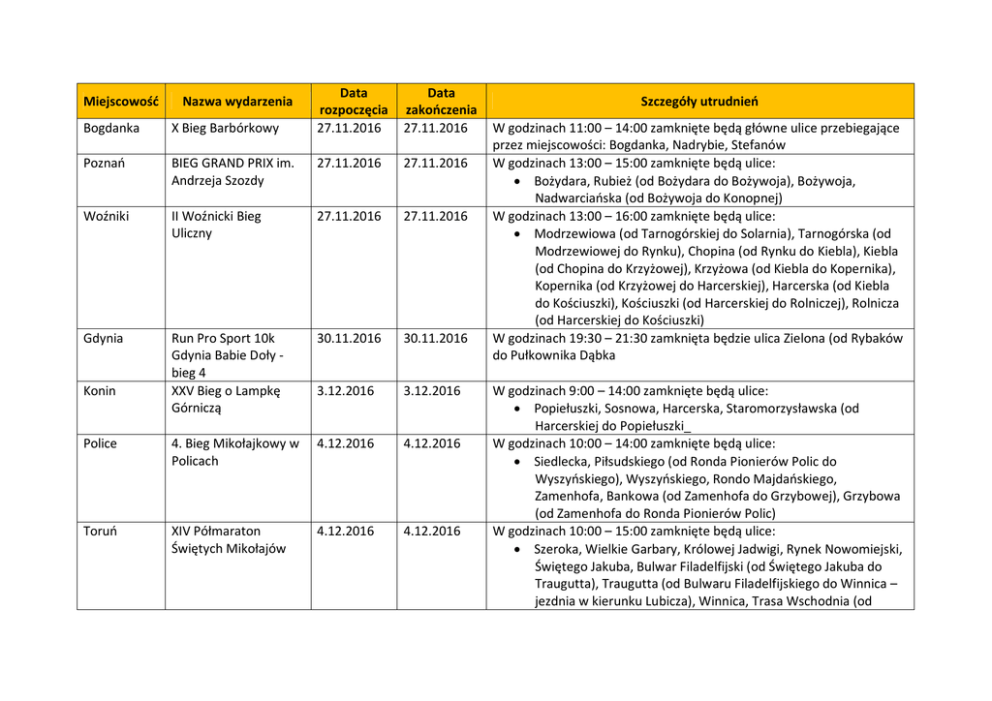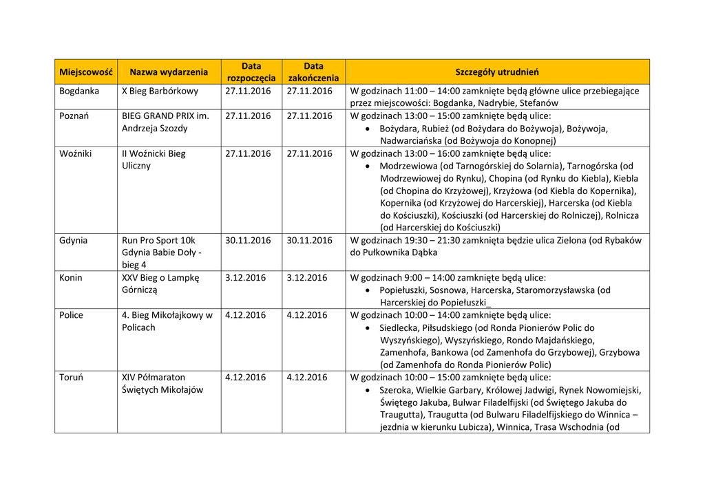 Miejscowość Nazwa wydarzenia Data rozpoczęcia 27.11.2016 Data zakończenia 27.11.2016 Bogdanka X Bieg Barbórkowy Poznań BIEG GRAND PRIX im. Andrzeja Szozdy 27.11.2016 27.11.2016 Woźniki II Woźnicki Bieg Uliczny 27.11.2016 27.11.2016 Gdynia Run Pro Sport 10k Gdynia Babie Doły bieg 4 XXV Bieg o Lampkę Górniczą 30.11.2016 30.11.2016 3.12.2016 3.12.2016 Police 4. Bieg Mikołajkowy w Policach 4.12.2016 4.12.2016 Toruń XIV Półmaraton Świętych Mikołajów 4.12.2016 4.12.2016 Konin Szczegóły utrudnień W godzinach 11:00 – 14:00 zamknięte będą główne ulice przebiegające przez miejscowości: Bogdanka, Nadrybie, Stefanów W godzinach 13:00 – 15:00 zamknięte będą ulice: Bożydara, Rubież (od Bożydara do Bożywoja), Bożywoja, Nadwarciańska (od Bożywoja do Konopnej) W godzinach 13:00 – 16:00 zamknięte będą ulice: Modrzewiowa (od Tarnogórskiej do Solarnia), Tarnogórska (od Modrzewiowej do Rynku), Chopina (od Rynku do Kiebla), Kiebla (od Chopina do Krzyżowej), Krzyżowa (od Kiebla do Kopernika), Kopernika (od Krzyżowej do Harcerskiej), Harcerska (od Kiebla do Kościuszki), Kościuszki (od Harcerskiej do Rolniczej), Rolnicza (od Harcerskiej do Kościuszki) W godzinach 19:30 – 21:30 zamknięta będzie ulica Zielona (od Rybaków do Pułkownika Dąbka W godzinach 9:00 – 14:00 zamknięte będą ulice: Popiełuszki, Sosnowa, Harcerska, Staromorzysławska (od Harcerskiej do Popiełuszki_ W godzinach 10:00 – 14:00 zamknięte będą ulice: Siedlecka, Piłsudskiego (od Ronda Pionierów Polic do Wyszyńskiego), Wyszyńskiego, Rondo Majdańskiego, Zamenhofa, Bankowa (od Zamenhofa do Grzybowej), Grzybowa (od Zamenhofa do Ronda Pionierów Polic) W godzinach 10:00 – 15:00 zamknięte będą ulice: Szeroka, Wielkie Garbary, Królowej Jadwigi, Rynek Nowomiejski, Świętego Jakuba, Bulwar Filadelfijski (od Świętego Jakuba do Traugutta), Traugutta (od Bulwaru Filadelfijskiego do Winnica – jezdnia w kierunku Lubicza), Winnica, Trasa Wschodnia (od Rybnik XII BIEGU BARBÓRKOWEGO RYBNIK 2016 4.12.2016 4.12.2016 Pruszków Pruszkowskie Biegi Mikołajkowe 4.12.2016 4.12.2016 Estakady Marka Sudaka do Rudackiej – jezdnia w kierunku na północ), Rudacka (od Mostu Zawackiej do Otłoczyńskiej), Otłoczyńska (od Rudackiej do Rypińskiej), Lipnowska, Rypińska, Podgórska (od Rypińskiej do Dybowskiej), Dybowska (od Podgórskiej do Mostu Józefa Piłsudskiego), Most Józefa Piłsudskiego, Aleja Jana Pawła II (od Bulwaru Filadelfijskiego do Kopernika), Kopernika (od Alei Jana Pawła II do Pod Krzywą Wieżą), Skwer Oficerskiej Szkoły Marynarki Wojennej, Bulwar Filadelfijski, Popiełuszki (od Rybaki do Stromej), Przybyszewskiego (na wysokości ulicy Przy Cegielni), Bydgoska (od Przybyszewskiego do Reja), Szosa Bydgoska, Szosa Okrężna (od Szosy Bydgoskiej do Gagarina), Gagarina (od Szosy Okrężnej do Olszewskiego), Olszewskiego, Św. Józefa (od Olszewskiego do Balonowej), Bema (na wysokości Hali Sportowo-widowiskowej – jezdnia w stronę Osiedla Kochanowskiego) W godzinach 12:00 – 15:00 zamknięte będą ulice: Raciborska (od Skłodowskiej-Curie do Zebrzydowckiej), Zebrzydowicka (od Św. Józefa do Granicznej), Krzywa (od Zebrzydowickiej do Łącznej), Łączna, Borki (od Łącznej do Św. Józefa), Św. Józefa, Wawelska (od Św. Józefa do Wierzbowej), Broniewskiego (od Wierzbowej do Budowlanych), Budowlanych (od Broniewskiego do Ronda Zebrzydowickiego), Osiedle Krakusa, Wawelska (od Osiedla Krakusa do Broniewskiego), Wierzbowa, Rudzka (od Wierzbowej do Skłodowskiej-Curie), Plac Kościelny W godzinach 11:00 – 14:00 zamknięte będą ulice: Andrzeja, Armii Krajowej (od Andrzeja do Prusa), Prusa (od Armii Krajowej do Cmentarnej), Gordziałkowskiego (od Cmentarnej do Komorowskiej), Komorowska (od Gordziałkowskiego do Ceramicznej), Ceramiczna (od Komorowskiej do Cegielnianej), Września II Bieg im. Bohaterów Powstania Wielkopolskiego 11.12.2016 11.12.2016 Cegielniana (od Ceramicznej do Lipowej), Lipowa (od Cegielnianej do Armii Krajowej) W godzinach 13:00 – 16:00 zamknięte będą ulice: Warszawska (od ronda Sienkiewicza do 3 Maja), Moniuszki, Harcerska (od Moniuszki do Opieszyn), Opieszyn (od Harcerskiej do Kościuszki), Kościuszki (od Legii Wrzesińskiej do Koszarowej), Koszarowa