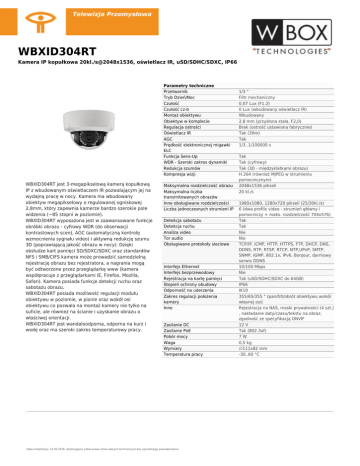 WBXID304RT Kamera IP kopułkowa 20kl./s@2048x1536, oświetlacz IR, uSD/SDHC/SDXC, IP66 Parametry techniczne Przetwornik Tryb Dzień/Noc Czułość Czułość cz-b Montaż obiektywu Obiektyw w komplecie Regulacja ostrości Oświetlacz IR AGC Prędkość elektronicznej migawki ELC Funkcja Sens-Up WDR - Szeroki zakres dynamiki Redukcja szumów Kompresja wizji WBXID304RT jest 3-megapikselową kamerą kopułkową IP z wbudowanym oświetlaczem IR pozwalającym jej na wydajną pracę w nocy. Kamera ma wbudowany obiektyw megapikselowy o regulowanej ogniskowej 2,8mm, który zapewnia kamerze bardzo szerokie pole widzenia (~85 stopni w poziomie). WBXID304RT wyposażona jest w zaawansowane funkcje obróbki obrazu - cyfrowy WDR (do obserwacji kontrastowych scen), AGC (automatyczną kontrolę wzmocnienia sygnału video) i aktywną redukcję szumu 3D (poprawiającą jakość obrazu w nocy). Dzięki obsłudze kart pamięci SD/SDXC/SDXC oraz standardów NFS i SMB/CIFS kamera może prowadzić samodzielną rejestrację obrazu bez rejestratora, a nagrania mogą być odtworzone przez przeglądarkę www (kamera współpracuje z przeglądarkami IE, Firefox, Mozilla, Safari). Kamera posiada funkcje detekcji ruchu oraz sabotażu obrazu. WBXID304RT posiada możliwość regulacji modułu obiektywu w poziomie, w pionie oraz wokół osi obiektywu co pozwala na montaż kamery nie tylko na suficie, ale również na ścianie i uzyskanie obrazu o właściwej orientacji. WBXID304RT jest wandaloodporna, odporna na kurz i wodę oraz ma szeroki zakres temperaturowy pracy. Maksymalna rozdzielczość obrazu Maksymalna liczba transmitowanych obrazów Inne obsługiwane rozdzielczości Liczba jednoczesnych strumieni IP Detekcja sabotażu Detekcja ruchu Analiza video Tor audio Obsługiwane protokoły sieciowe Interfejs Ethernet Interfejs bezprzewodowy Rejestracja na kartę pamięci Stopień ochrony obudowy Odporność na uderzenia Zakres regulacji położenia kamery Inne Zasilanie DC Zasilanie PoE Pobór mocy Waga Wymiary Temperatura pracy Data modyfikacji: 12.02.2016. Zastrzegamy sobie prawo zmian danych technicznych bez uprzedniego powiadomienia. 1/3 " Filtr mechaniczny 0,07 Lux (F1.2) 0 Lux (wbudowany oświetlacz IR) Wbudowany 2,8 mm (przysłona stała, F2,0) Brak (ostrość ustawiona fabrycznie) Tak (30m) Tak 1/3..1/100000 s Tak Tak (cyfrowy) Tak (3D - międzyklatkami obrazu) H.264 (również MJPEG w strumieniu pomocnicznym) 2048x1536 pikseli 20 kl./s 1980x1080, 1280x720 pikseli (25/30kl./s) 6 (dwa profile video - strumień główny i pomocniczy + maks. rozdzielczość 704x576) Tak Tak Nie Nie TCP/IP, ICMP, HTTP, HTTPS, FTP, DHCP, DNS, DDNS, RTP, RTSP, RTCP, NTP,UPnP, SMTP, SNMP, IGMP, 802.1x, IPv6, Bonjour, darmowy serwis DDNS 10/100 Mbps Nie Tak (uSD/SDHC/SDXC do 64GB) IP66 IK10 355/65/355 ° (pan/tilt/obrót obiektywu wokół własnej osi) Rejestracja na NAS, maski prywatności (4 szt.) , nakładanie daty/czasu/tekstu na obraz, zgodność ze specyfikacją ONVIF 12 V Tak (802.3af) 7W 0,5 kg ∅111x82 mm -30..60 °C