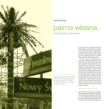 dominika dzido palma własna, czyli phoenix w warszawie W grudniu 2002 r. na warszawskim Rondzie de Gaulle’a leżącym na skrzyżowaniu Alej Jerozolimskich i Nowego Świata pojawiła się piętnastometrowa palma. Jej wysoki, solidny, nasączony ciepłym brązem pień wieńczył pióropusz gęstych, powiewających liści. Temperatura tego dnia nie pozwalała wytłumaczyć widoku zjawiskiem fatamorgany. Pomysł zrodził się z postawionego przez artystkę Joannę Rajkowską, żartobliwego początkowo pytania: co by się stało, gdyby jedną z głównych warszawskich ulic obsadzić szpalerem palm. „Pozdrowienia z Alej Jerozolimskich” – bo taki jest tytuł projektu – związane są ze wspomnieniami z podróży Rajkowskiej do Izraela. Powstały z potrzeby opowiedzenia końca tej podróży w Warszawie, w tym konkretnym, pełnym osobistych doświadczeń miejscu. Artystyczna realizacja połączyła dwa odległe konteksty: palma wyrwana z izraelskiego krajobrazu przenosi jego specyfikę do stolicy, nazwa ulicy – Aleje Jerozolimskie – zostaje dodatkowo skojarzona z Bliskim Wschodem. Rajkowska pokazała znaną wszystkim warszawiakom ulicę w niecodziennej odsłonie. Okolicznościowe kartki z palmą i angielską wersją nazwy projektu, fot.: Agencja Gazeta „Greetings from Jerusalem Avenue”, 36 dodatkowo poszerzyły pole znaczeniowych odwołań. Kolejną, głębszą warstwą projektu, jest odsłonięcie, jak w archeologicznych wykopaliskach, historii Alej. W r. 1774 na rogatkach ówczesnej Warszawy Józef Potocki i August Sułkowski założyli osady dla Żydów: Nowy Potok i Nową Jerozolimę. Ze względu na ro- fot.: Marek Szczepański snącą ekonomiczną konkurencję tej okolicy władze miejskie zdecydowały o likwidacji osad. Pozostała po nich droga prowadząca w stronę Wisły. Realizacja Rajkowskiej w ciekawy i niespodziewany sposób odwołuje się do tamtych wydarzeń, do śladów żydowskiej historii w mieście. Projekt był realizowany przez trzy osoby: autorkę, architekta Michała Rudnickiego i reprezentującą Fundację Instytut Promocji Sztuki Katarzynę Łyszkowicz. Palma miała stać na warszawskim rondzie przez rok, ale po tym okresie okazało się, że z powodów finansowych i organizacyjnych trzeba szukać innych rozwiązań niż likwidacja drzewa. Jednocześnie, ku zaskoczeniu autorki i Fundacji, za palmą ujęli się warszawiacy. Powstał Komitet Obrony Palmy, fot.: Agencja Gazeta który przy wsparciu Gazety Wyborczej podjął walkę o pozostawienie drzewa w miejscu, w którym zapuściło ono swoje sztuczne korzenie. Administracyjna droga do celu była równie trudna jak ta, która doprowadziła do zmiany miejskiego pejzażu. Palma stała się jednak na tyle ważnym i integralnym elementem przestrzeni, że ani jej twórcy, ani większość mieszkańców nie wyobraża już sobie pustego po niej miejsca. W rozmowie z Arturem Żmijewskim Rajkowska powiedziała, że chce, aby ludzie „byli koło siebie, pod palmą”. Pragnienie artystki spełniło się. Często można dziś usłyszeć, że ktoś umawia się z przyjaciółmi „pod palmą”, czyli w okolicy ronda. Pod samym drzewem stacjonują niekiedy policjanci z drogówki, 37 co zwłaszcza w letnie, słoneczne dni (kiedy policjanci noszą ciemne okulary) tworzy kadr jakby prosto wyjęty z rozgrywających się gdzieś w Kalifornii seriali amerykańskich. Ów humorystyczny obrazek uzupełnia całkiem realna historia powstania palmy. Została ona wykonana przez amerykańską firmę Soulutions.com, a konkretnie przez zatrudnionych w niej, meksykańskich robotników. Amerykański kontekst jest kolejnym elementem jakże barwnego kolażu kulturowego, którego centrum stanowi sztuczne drzewo stojące w jednym z głównych miejsc stolicy. Warszawska Phoenix Carariensis wykonana jest ze sztucznych tworzyw oraz materiałów naturalnych i zabezpieczona zarówno chuliganami i przestali wierzyć w słonie. Słoń, który lata, prowadzi na manowce, ale „palma własna” na rondzie środkowoeuropejskiego miasta potrafi uruchomić proces poznawania na nowo czegoś, co wydawało się już oswojone. Wielość skojarzeń, jakie przywołuje sztuczne drzewo – podróż artystki do Izraela, historia Żydów warszawskich, policjanci przypominający funkcjonariuszy z Los Angeles i meksykańscy robotnicy pieczołowicie wyrabiający pień – nasuwa sporo pytań. Każe zatrzymać się i zastanowić nad miejscem, w którym jesteśmy. Dzięki temu zachowuje świeży wygląd niezależnie od warunków pogodowych. Projekt sfinansowano z pieniędzy uzyskanych od firm-sponsorów. Praca nad tą wielką realizacją artystyczną umieszczoną w przestrzeni publicznej najeżona była rozlicznymi problemami technicznymi i administracyjnymi, natrafiła też na bariery mentalnych przyzwyczajeń. Palma wprawiała w zdziwienie, a nawet w osłupienie. Jednak okazało się, że przeobraża ona rzeczywistość w twórczy sposób. Można się zastanawiać, czy to dzięki niej fragment miasta zyskał nową tożsamość, czy też wprawiła ona jedynie w ruch wielość znaczeń drzemiących w okolicy Ronda de Gaulle’a. W jednym z opowiadań Mrożka kierownik ogrodu zoologicznego postanowił wzbogacić placówkę o „słonia własnego” – wykonanego z gumy i napełnianego powietrzem. Jednak gumowa powłoka została przez pomyłkę wypełniona gazem i kiedy rankiem przybyła pierwsza wycieczka szkolna, lekki podmuch wiatru uniósł słonia wysoko nad ogrodzenia. Uczniowie, którzy to widzieli, stali się 38 fot.: Agencja Gazeta przed deszczem, mrozem, jak i przed promieniowaniem UV. przemysław kondraciuk fot.: Marek Szczepański wywiad z joanną rajkowską dominika dzido – absolwentka Instytutu Etnologii i Antropologii Kulturowej Uniwersytetu Warszawskiego, obecnie doktorantka w Instytucie Stosowanych Nauk Społecznych UW; mieszka w Warszawie. Interesuje się przede wszystkim znaczeniami kulturowej tożsamości płci (gender), szczególnie tematyką zw