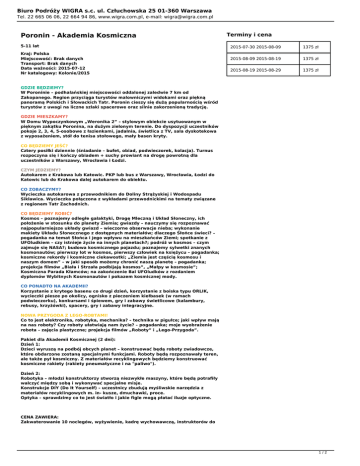 Biuro Podróży WIGRA s.c. ul. Człuchowska 25 01-360 Warszawa Tel. 22 665 06 06, 22 664 94 86, www.wigra.com.pl, e-mail: [email protected] Poronin - Akademia Kosmiczna 5-11 lat Kraj: Polska Miejscowość: Brak danych Transport: Brak danych Data ważności: 2015-07-12 Nr katalogowy: Kolonie/2015 Terminy i cena 2015-07-30 2015-08-09 1375 zł 2015-08-09 2015-08-19 1375 zł 2015-08-19 2015-08-29 1375 zł GDZIE BĘDZIEMY? W Poroninie – podhalańskiej miejscowości oddalonej zaledwie 7 km od Zakopanego. Region przyciąga turystów malowniczymi widokami oraz piękną panoramą Polskich i Słowackich Tatr. Poronin cieszy się dużą popularnością wśród turystów z uwagi na liczne szlaki spacerowe oraz silnie zakorzenioną tradycję. GDZIE MIESZKAMY? W Domu Wypoczynkowym „Weronika 2” – stylowym obiekcie usytuowanym w pięknym zakątku Poronina, na dużym zielonym terenie. Do dyspozycji uczestników pokoje 2, 3, 4, 5-osobowe z łazienkami, jadalnia, świetlica z TV, sala dyskotekowa z wyposażeniem, stół do tenisa stołowego, mały basen kryty. CO BĘDZIEMY JEŚĆ? Cztery posiłki dziennie (śniadanie – bufet, obiad, podwieczorek, kolacja). Turnus rozpoczyna się i kończy obiadem + suchy prowiant na drogę powrotną dla uczestników z Warszawy, Wrocławia i Łodzi. CZYM JEDZIEMY? Autokarem z Krakowa lub Katowic. PKP lub bus z Warszawy, Wrocławia, Łodzi do Katowic lub do Krakowa dalej autokarem do obiektu. CO ZOBACZYMY? Wycieczka autokarowa z przewodnikiem do Doliny Strążyskiej i Wodospadu Siklawica. Wycieczka połączona z wykładami przewodnickimi na tematy związane z regionem Tatr Zachodnich. CO BĘDZIEMY ROBIĆ? Kosmos – poznajemy odległe galaktyki, Drogę Mleczną i Układ Słoneczny, ich położenie w stosunku do planety Ziemia; gwiazdy – nauczymy się rozpoznawać najpopularniejsze układy gwiazd – wieczorne obserwacje nieba; wykonanie makiety Układu Słonecznego z dostępnych materiałów; dlaczego Słońce świeci? – pogadanka na temat Słońca i jego wpływu na mieszkańców Ziemi; spotkanie z UFOludkiem – czy istnieje życie na innych planetach?; podróż w kosmos – czym zajmuje się NASA?; budowa kosmicznego pojazdu; poznajemy sylwetki znanych kosmonautów; pierwszy lot w kosmos, pierwszy człowiek na księżycu – pogadanka; kosmiczne rekordy i kosmiczne ciekawostki; „Ziemia jest częścią kosmosu i naszym domem” – w jaki sposób możemy chronić naszą planetę – pogadanka; projekcja filmów „Biała i Strzała podbijają kosmos”, „Małpy w kosmosie”; Kosmiczna Parada Kłamców; na zakończenie Bal UFOludków z rozdaniem dyplomów Wybitnych Kosmonautów i pokazem kosmicznej mody. CO PONADTO NA AKADEMII? Korzystanie z krytego basenu co drugi dzień, korzystanie z boiska typu ORLIK, wycieczki piesze po okolicy, ognisko z pieczeniem kiełbasek (w ramach podwieczorku), konkursami i śpiewem, gry i zabawy świetlicowe (kalambury, rebusy, krzyżówki), spacery, gry i zabawy integracyjne. NOWA PRZYGODA Z LEGO-ROBTAMI! Co to jest elektronika, robotyka, mechanika? – technika w pigułce; jaki wpływ mają na nas roboty? Czy roboty ułatwiają nam życie? – pogadanka; moje wyobrażenie robota – zajęcia plastyczne; projekcja filmów „Roboty” i „Lego-Przygoda”. Pakiet dla Akademii Kosmicznej (2 dni): Dzień 1: Dzieci wyruszą na podbój obcych planet – konstruować będą roboty zwiadowcze, które obdarzone zostaną specjalnymi funkcjami. Roboty będą rozpoznawały teren, ale także pył kosmiczny. Z materiałów recyklingowych będziemy konstruować kosmiczne rakiety (rakiety pneumatyczne i na "paliwo"). Dzień 2: Robotyka – młodzi konstruktorzy stworzą niezwykłe maszyny, które będą potrafiły walczyć między sobą i wykonywać specjalne misje. Konstrukcje DIY (Do It Yourself) – uczestnicy zbudują myśliwskie narzędzia z materiałów recyklingowych m. in- kusze, dmuchawki, proce. Optyka – sprawdzimy co to jest światło i jakie figle mogą płatać iluzje optyczne. CENA ZAWIERA: Zakwaterowanie 10 noclegów, wyżywienie, kadrę wychowawczą, instruktorów do 1/2 Biuro Podróży WIGRA s.c. ul. Człuchowska 25 01-360 Warszawa Tel. 22 665 06 06, 22 664 94 86, www.wigra.com.pl, e-mail: [email protected] zajęć z robotyki, opiekę medyczną, transport, program, ubezpieczenie NNW Signal Iduna do kwoty 5.000 zł. 2/2 Powered by TCPDF (www.tcpdf.org)