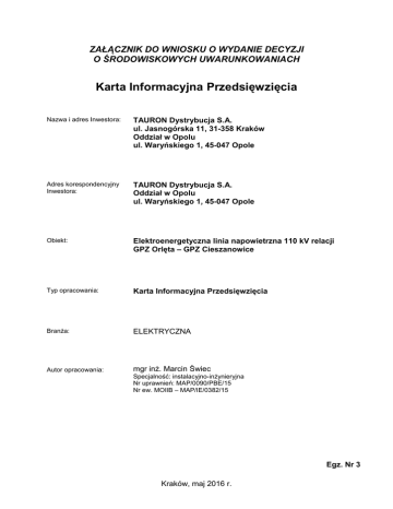 ZAŁĄCZNIK DO WNIOSKU O WYDANIE DECYZJI O ŚRODOWISKOWYCH UWARUNKOWANIACH Karta Informacyjna Przedsięwzięcia Nazwa i adres Inwestora: TAURON Dystrybucja S.A. ul. Jasnogórska 11, 31-358 Kraków Oddział w Opolu ul. Waryńskiego 1, 45-047 Opole Adres korespondencyjny Inwestora: TAURON Dystrybucja S.A. Oddział w Opolu ul. Waryńskiego 1, 45-047 Opole Obiekt: Elektroenergetyczna linia napowietrzna 110 kV relacji GPZ Orlęta – GPZ Cieszanowice Typ opracowania: Karta Informacyjna Przedsięwzięcia Branża: ELEKTRYCZNA Autor opracowania: mgr inż. Marcin Świec Specjalność: instalacyjno-inżynieryjna Nr uprawnień: MAP/0090/PBE/15 Nr ew. MOIIB – MAP/IE/0382/15 Egz. Nr 3 Kraków, maj 2016 r. Karta Informacyjna Przedsięwzięcia Przebudowa elektroenergetycznej linii napowietrznej 110 kV relacji Orlęta – Cieszanowice w odcinku od proj. słupa na działce nr 41/4 (obręb Słupice) do stacji Cieszanowice Spis zawartości opracowania 1. Karta informacyjna przedsięwzięcia 2. Trasa przebudowywanej linii 110 kV na mapie topograficznej w skali 1:10 000 3. Trasa przebudowywanej linii 110 kV na kopiach map ewidencyjnych w skali 1:2000 – część 1÷9. Strona: Karta Informacyjna Przedsięwzięcia 1/20 Przebudowa elektroenergetycznej linii napowietrznej 110 kV relacji Orlęta – Cieszanowice w odcinku od proj. słupa na działce nr 41/4 (obręb Słupice) do stacji Cieszanowice 1. RODZAJ, SKALA I USYTUOWANIE PRZEDSIĘWZIĘCIA Przedmiotem niniejszej Karty jest informacja dotycząca planowanej przebudowy elektroenergetycznej linii napowietrznej o napięciu znamionowym 110 kV relacji GPZ Orlęta – GPZ Cieszanowice w odcinku od słupa na działce nr 41/4 (obręb Słupice) do elektroenergetycznej stacji GPZ Cieszanowice. Inwestorem przedsięwzięcia jest: TAURON Dystrybucja S.A. ul. Jasnogórska 11, 31-358 Kraków Adres do korespondencji: TAURON Dystrybucja S.A. Oddział w Opolu ul. Ludwika Waryńskiego 1, 45-047 Opole Istniejąca linia 110 kV relacji Orlęta – Cieszanowice została wybudowana w latach 70- tych XX wieku. Ze względu na układ sieci dystrybucyjnej na tym terenie, stała się jedną z kluczowych linii energetycznych doprowadzających energię elektryczną dla mieszkańców powiatu nyskiego. W wyniku wydłużonego okresu eksploatacji, przedmiotowa linia 110 kV została przeznaczona do przebudowy polegającej na wymianie istniejących przewodów fazowych oraz odgromowych na nowe, a także zastąpieniu istniejących stanowisk słupowych nowymi konstrukcjami. Projektowane konstrukcje słupowe zostały zlokalizowane na nowych stanowiskach, zachowując swoją lokalizację w osi istniejącej linii 110 kV. Zmiana lokalizacji stanowisk słupowych wynika z zastosowania nowych technologii, przez co zmniejszy się liczba projektowanych słupów w stosunku do istniejących, a także ze względu na ograniczenie czasu wyłączeń linii 110 kV podczas jej modernizacji, co zapewni zmniejszenie uciążliwości linii. Zbyt długie wyłączenie, tak ważnej linii energetycznej z systemu dystrybucyjnego może doprowadzić do poważnych uciążliwości w dostarczaniu energii elektrycznej do odbiorców i braku zapewnienia bezpieczeństwa energetycznego regionu. Strona: Karta Informacyjna Przedsięwzięcia 2/20 Przebudowa elektroenergetycznej linii napowietrznej 110 kV relacji Orlęta – Cieszanowice w odcinku od proj. słupa na działce nr 41/4 (obręb Słupice) do stacji Cieszanowice Niniejsza Inwestycja realizowana jest w celu poprawy niezawodności sieci dystrybucyjnej, zwiększenia bezpieczeństwa eksploatacji, zmniejszenia strat wynikających z przesyłu energii elektrycznej, a także pokrycia zapotrzebowania na energię elektryczną mieszkańców w powiecie nyskim. Realizacja planowanej przebudowy jest niezbędna dla regionu nyskiego. Linia 110 kV dostarcza energię elektryczną do instytucji użyteczności publicznej, przedsiębiorstw, zakładów produkcyjnych oraz gospodarstw domowych. Zgodnie z rozporządzeniem Rady Ministrów z dnia 9 listopada 2010 r. w sprawie przedsięwzięć mogących znacząco oddziaływać na środowisko (Dz. U. 2010 r. Nr 213 poz. 1397 ze zm.) planowana inwestycja stanowić będzie w myśl §3 ust. 1 pkt 7 ww. rozporządzenia przedsięwzięcie mogące potencjalnie znacząco oddziaływać na środowisko. Jednak należy zaznaczyć, iż planowana inwestycja jest przebudową istniejącej linii 110 kV, która w całości przebiegać będzie po istniejącej trasie. Przebudowywany odcinek linii 110 kV zlokalizowany będzie na działkach ewidencyjnych nr: Gmina Pakosławice Obręb 0010 – Słupice 41/4, 38, 15, 10, 3, 2, 233, Gmina Kamiennik Obręb 0007 – Kłodobok 34, 33/3, 33/2, 33/1, 32, 31, 30/2, 87/2, 30/1, 87/1, 17/1, 13/1, 12/1, 11/4, 88, 63, 78, 428, 82, 426, 405/3, 405/2, 405/4, 92, 443, Obręb 0003 – Cieszanowice 136, 92/4, 92/3, 161, 92/1, 91/1, 90/1, 89/3, 89/2, 89/1, 88/4, 88/5, 87, 86, 129, 77/3, 77/1, 76, 73/2, 73/1, 72/2, 72/1, 134, 59/3, 133/2, 338/5, Obręb 0010 – Szklary 843, 846, 844/6, Obszar działek ewidencyjnych na terenie gminy Pakosławice, przez który przebiega przebudowywany odcinek linii 110 kV objęty jest obowiązującym Strona: Karta Informacyjna Przedsięwzięcia 3/20 Przebudowa elektroenergetycznej linii napowietrznej 110 kV relacji Orlęta – Cieszanowice w odcinku od proj. słupa na działce nr 41/4 (obręb Słupice) do stacji Cieszanowice miejscowym planem zagospodarowania przestrzennego (uchwała nr XXVII/100/05 Rady Gminy Pakosławice z dnia 22 czerwca 2005 r.). Na terenie gminy Kamiennik jedynie działki nr 844/6 i 843 (obręb 0010 Szklary) objęte są miejscowym planem zagospodarowania przestrzennego (uchwała nr XXX/169/04 Rady Gminy Kamiennik z dnia 15 grudnia 2004 r. w sprawie miejscowego planu zagospodarowania przestrzennego Gminy Kamiennik w części dotyczącej wsi Cieszanowice). Natomiast na pozostałym obszarze gminy Kamiennik, przez który przebiega przebudowywany odcinek linii 110 kV nie ma obowiązującego MPZP. 
