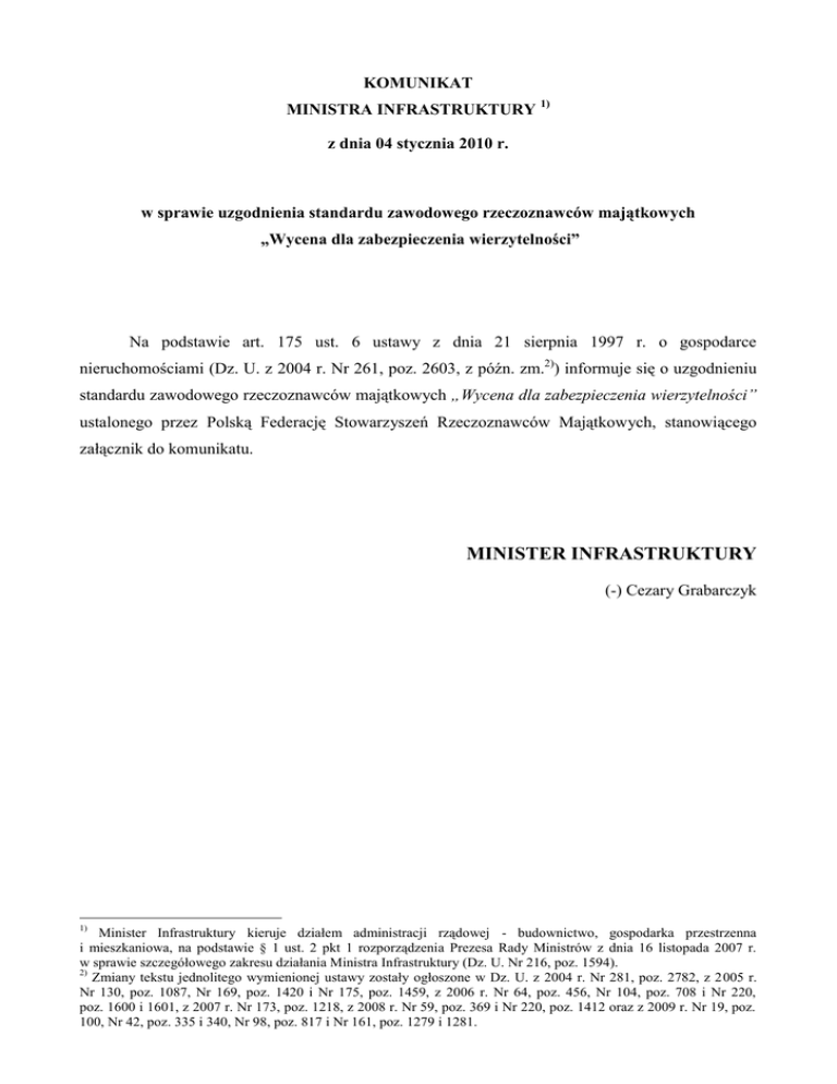 KOMUNIKAT MINISTRA INFRASTRUKTURY 1) z dnia 04 stycznia 2010 r. w sprawie uzgodnienia standardu zawodowego rzeczoznawców majątkowych „Wycena dla zabezpieczenia wierzytelności” Na podstawie art. 175 ust. 6 ustawy z dnia 21 sierpnia 1997 r. o gospodarce nieruchomościami (Dz. U. z 2004 r. Nr 261, poz. 2603, z późn. zm.2)) informuje się o uzgodnieniu standardu zawodowego rzeczoznawców majątkowych „Wycena dla zabezpieczenia wierzytelności” ustalonego przez Polską Federację Stowarzyszeń Rzeczoznawców Majątkowych, stanowiącego załącznik do komunikatu. MINISTER INFRASTRUKTURY (-) Cezary Grabarczyk 1) Minister Infrastruktury kieruje działem administracji rządowej - budownictwo, gospodarka przestrzenna i mieszkaniowa, na podstawie § 1 ust. 2 pkt 1 rozporządzenia Prezesa Rady Ministrów z dnia 16 listopada 2007 r. w sprawie szczegółowego zakresu działania Ministra Infrastruktury (Dz. U. Nr 216, poz. 1594). 2) Zmiany tekstu jednolitego wymienionej ustawy zostały ogłoszone w Dz. U. z 2004 r. Nr 281, poz. 2782, z 2005 r. Nr 130, poz. 1087, Nr 169, poz. 1420 i Nr 175, poz. 1459, z 2006 r. Nr 64, poz. 456, Nr 104, poz. 708 i Nr 220, poz. 1600 i 1601, z 2007 r. Nr 173, poz. 1218, z 2008 r. Nr 59, poz. 369 i Nr 220, poz. 1412 oraz z 2009 r. Nr 19, poz. 100, Nr 42, poz. 335 i 340, Nr 98, poz. 817 i Nr 161, poz. 1279 i 1281. Załącznik do Komunikatu Ministra Infrastruktury z dnia 04 stycznia 2010 r. STANDARD ZAWODOWY RZECZOZNAWCÓW MAJĄTKOWYCH WYCENA DLA ZABEZPIECZENIA WIERZYTELNOŚCI 1. Wprowadzenie 1.1. Standard stosuje się ilekroć nieruchomość została lub będzie obciążona ograniczonym prawem rzeczowym stanowiącym zabezpieczenie wierzytelności, w szczególności przy udzielaniu kredytu, pożyczki lub innego produktu przez banki, instytucje finansowe lub instytucje kredytowe. 1.2. Zasady niniejszego standardu mogą być stosowane odpowiednio również wówczas, gdy wycena nieruchomości wykonywana jest do celu zabezpieczenia jakiegokolwiek zobowiązania istniejącego lub mającego zaistnieć w przyszłości pomiędzy dowolnymi podmiotami. 1.3. Niniejszego standardu nie stosuje się przy sporządzaniu ekspertyzy bankowo-hipotecznej wartości nieruchomości. 1.4. Zasady przedstawione w niniejszym standardzie stosuje się odpowiednio do szacowania maszyn i urządzeń trwale związanych z nieruchomością. 2. Definicje i założenia 2.1. Ilekroć w niniejszym standardzie używa się w szczególności takich pojęć, jak: fizycznie możliwe, operat szacunkowy, rzeczoznawca majątkowy, określanie wartości nieruchomości, wartość rynkowa, wartość odtworzeniowa, należy przez to rozumieć pojęcia zdefiniowane w przepisach prawa oraz standardach zawodowych rzeczoznawców majątkowych. 2.2. Podstawę wyceny do celów określonych w niniejszym standardzie stanowi wartość rynkowa. Na zamówienie wierzyciela lub zamawiającego, oprócz wartości rynkowej przedmiotu wyceny, rzeczoznawca majątkowy może określić inne rodzaje wartości. 2.3. Rzeczoznawca majątkowy jednoznacznie wskazuje rodzaj określanej wartości tak, aby wartość inna niż wartość rynkowa nie była błędnie rozumiana jako wartość rynkowa. 3. Stosunek do standardów rachunkowości Ze względu na odmienne cele wyceny, operaty szacunkowe i inne opracowania sporządzane na potrzeby sprawozdań finansowych nie mogą być wykorzystywane dla zabezpieczenia wierzytelności. 4. Zastosowanie standardu 4.1. Przeprowadzając wycenę do celu zabezpieczenia wierzytelności, rzeczoznawca majątkowy powinien odnieść się do wymagań udostępnionych przez wierzycieli i w każdym przypadku, kiedy nie będą one uwzględnione, rzeczoznawca powinien zaznaczyć ten fakt w operacie szacunkowym. Nieuwzględnienie wymagań może być spowodowane m.in. brakiem możliwości uzyskania przez rzeczoznawcę majątkowego informacji dotyczących wymagań wierzyciela lub niezgodnością tych wymagań z przepisami prawa lub standardami zawodowymi rzeczoznawców majątkowych. 4.2. Uwzględniając wymogi stawiane rzeczoznawcy majątkowemu przy sporządzaniu operatu szacunkowego, należy w nim ujawnić poznane w trakcie szacowania nieruchomości okoliczności ograniczające jej przydatność dla zabezpieczenia wierzytelności. 4.3. Rzeczoznawca majątkowy ma również obowiązek, na podstawie dostępnych źródeł informacji i znajomości rynku, wskazać obszary ryzyka związanego z wycenianą nieruchomością, w tym z przewidywanymi zmianami na danym rynku nieruchomości oraz ryzykiem związanym z oceną danej nieruchomości przez inwestorów wraz z ogólną opinią na temat kierunku wpływu powyższego na poziom wartości wycenianej nieruchomości w przyszłości. Powyższe dodatkowe informacje przedstawia się w formie załącznika do operatu szacunkowego. 4.4. Określanie wartości należy odróżnić od szacowania ryzyka kredytowego. Szczegółowa interpretacja i analiza ryzyka, związanego z przedmiotem zabezpieczenia, o którym mowa w pkt. 4.3, może być dla rzeczoznawcy majątkowego dodatkową czynnością lub przedmiotem odrębnego opracowania, niestanowiącego operatu szacunkowego. Rzeczoznawca majątkowy może, na zamówienie wierzyciela lub zamawiającego, w miarę posiadanych kompetencji, w ramach dodatkowej usługi, wykonać analizę wrażliwości, która pozwoli na pełniejszą ocenę ryzyka przyjęcia konkretnej nieruchomości, jako zabezpieczenia wierzytelności. Analiza wrażliwości przedstawia wrażliwość wartości nieruchomości wycenianej na zmiany parametrów wejściowych, wpływających na tę wartość. Ostateczna ocena ryzyka, związanego z zabezpieczeniem wierzytelności na nieruchomości, należy w każdym przypadku do wierzyciela. 5. Wymagania szczegółowe 5.1. Nieruchomości wyceniane na potrzeby zabezpieczenia wierzytelności, mogą wymagać różnego potraktowania z punktu widzenia procesu i procedur wyceny. Wycenę można przeprowadzić z uwzględnieniem wewnętrznych uregulowań stoso