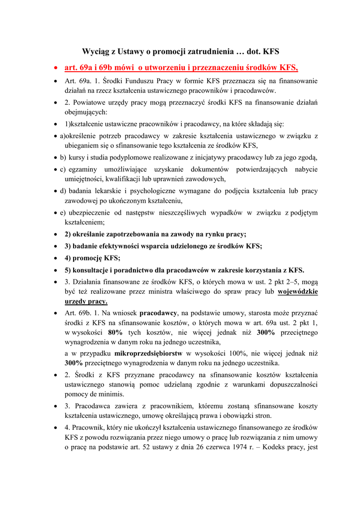 Wyciąg z Ustawy o promocji zatrudnienia … dot. KFS art. 69a i 69b mówi o utworzeniu i przeznaczeniu środków KFS, Art. 69a. 1. Środki Funduszu Pracy w formie KFS przeznacza się na finansowanie działań na rzecz kształcenia ustawicznego pracowników i pracodawców. 2. Powiatowe urzędy pracy mogą przeznaczyć środki KFS na finansowanie działań obejmujących: 1)kształcenie ustawiczne pracowników i pracodawcy, na które składają się: a)określenie potrzeb pracodawcy w zakresie kształcenia ustawicznego w związku z ubieganiem się o sfinansowanie tego kształcenia ze środków KFS, b) kursy i studia podyplomowe realizowane z inicjatywy pracodawcy lub za jego zgodą, c) egzaminy umożliwiające uzyskanie dokumentów umiejętności, kwalifikacji lub uprawnień zawodowych, potwierdzających nabycie d) badania lekarskie i psychologiczne wymagane do podjęcia kształcenia lub pracy zawodowej po ukończonym kształceniu, e) ubezpieczenie od następstw nieszczęśliwych wypadków w związku z podjętym kształceniem; 2) określanie zapotrzebowania na zawody na rynku pracy; 3) badanie efektywności wsparcia udzielonego ze środków KFS; 4) promocję KFS; 5) konsultacje i poradnictwo dla pracodawców w zakresie korzystania z KFS. 3. Działania finansowane ze środków KFS, o których mowa w ust. 2 pkt 2–5, mogą być też realizowane przez ministra właściwego do spraw pracy lub wojewódzkie urzędy pracy. Art. 69b. 1. Na wniosek pracodawcy, na podstawie umowy, starosta może przyznać środki z KFS na sfinansowanie kosztów, o których mowa w art. 69a ust. 2 pkt 1, w wysokości 80% tych kosztów, nie więcej jednak niż 300% przeciętnego wynagrodzenia w danym roku na jednego uczestnika, a w przypadku mikroprzedsiębiorstw w wysokości 100%, nie więcej jednak niż 300% przeciętnego wynagrodzenia w danym roku na jednego uczestnika. 2. Środki z KFS przyznane pracodawcy na sfinansowanie kosztów kształcenia ustawicznego stanowią pomoc udzielaną zgodnie z warunkami dopuszczalności pomocy de minimis. 3. Pracodawca zawiera z pracownikiem, któremu zostaną sfinansowane koszty kształcenia ustawicznego, umowę określającą prawa i obowiązki stron. 4. Pracownik, który nie ukończył kształcenia ustawicznego finansowanego ze środków KFS z powodu rozwiązania przez niego umowy o pracę lub rozwiązania z nim umowy o pracę na podstawie art. 52 ustawy z dnia 26 czerwca 1974 r. – Kodeks pracy, jest obowiązany do zwrotu pracodawcy poniesionych kosztów, na zasadach określonych w umowie z pracodawcą, o której mowa w ust. 3. 5. W przypadku, o którym mowa w ust. 4, pracodawca zwraca staroście środki KFS wydane na kształcenie ustawiczne pracownika, na zasadach określonych w umowie, o której mowa w ust. 1. 6. Starosta może przeprowadzać kontrolę u pracodawcy w zakresie przestrzegania postanowień umowy, o której mowa w ust. 1, wydatkowania środków KFS zgodnie z przeznaczeniem, właściwego dokumentowania oraz rozliczania otrzymanych i wydatkowanych środków i w tym celu może żądać danych, dokumentów i udzielania wyjaśnień w sprawach objętych zakresem kontroli. Do kontroli przeprowadzanej przez starostę przepisy art. 111 stosuje się odpowiednio. 7. Minister właściwy do spraw pracy określi, w drodze rozporządzenia, szczegółowy sposób i tryb przyznawania środków z KFS, w tym: 1) zakres informacji niezbędnych do sporządzenia wniosku o przyznanie środków z KFS, 2) elementy umowy, o której mowa w ust. 1 – mając na względzie prawidłowość wydatkowania środków, a także konieczność zapewnienia zgodności udzielanej pomocy z warunkami dopuszczalności pomocy de minimis.1) art. 109 ust. 2d-2n określa zasady podziału środków KFS, 2d. Środki Funduszu Pracy przeznaczone na finansowanie w danym roku budżetowym zadań realizowanych w ramach KFS, zwane dalej „środkami KFS”, są określane w planie Funduszu Pracy na ten rok, w kwocie odpowiadającej wysokości 2% przychodów Funduszu Pracy uzyskanych z obowiązkowych składek na Fundusz Pracy w roku przed rokiem poprzedzającym rok, dla którego jest sporządzany plan finansowy Funduszu Pracy. 2e. Kwoty środków Funduszu Pracy, jakie mogą być wydatkowane w roku budżetowym na finansowanie w województwie zadań realizowanych przez powiatowe urzędy pracy w ramach środków KFS, o których mowa w art. 69a ust. 2, z wyłączeniem kwot środków na finansowanie zadań realizowanych przez ministra właściwego do spraw pracy oraz wojewódzkie urzędy pracy, a następnie pomniejszone o 20% rezerwę, są określane przez ministra właściwego do spraw pracy corocznie na podstawie wzoru podziału środków ustalonego przez ministra właściwego do spraw pracy w porozumieniu z Radą Rynku Pracy. 2f. Minister właściwy do spraw pracy publikuje corocznie na stronie internetowej urzędu obsługującego ministra informację o priorytetach, wzorze podziału i planie wydatkowania 1) Dodany przez art. 1 pkt 59 ustawy z dnia 14 marca 2014 r. o zmianie ustawy o promocji zatrudnienia i instytucjach rynku pracy oraz niektórych innych ustaw (Dz. U. poz. ….) środków KFS w danym roku budżetowym, w tym o dodatkowych priorytetach wydatkowania lub przeznaczeniu środków rezerwy KFS, o których mowa w ust. 2e. 2g. Minister właściwy do spraw pracy określa w planie wydatkowania środków KFS wysokość środków na finansowanie zadań, o których mowa w art. 69a ust. 2 pkt 2–5, realizowanych przez ministra właściwego do spraw pracy i wojewódzkie urzędy pracy. 2h. Środki, o których mowa w ust. 2g, przeznaczane są w równej wysokości na realizację działań finansowanych w ramach środków KFS przez urząd obsługujący ministra właściwego do spraw pracy i każdy wojewódzki urząd pracy. 2i. Minister właściwy do spraw pracy przekazuje na wniosek marszałka województwa środki, o których mowa w ust. 2g, na realizację działań finansowanych w ramach KFS przez wojewódzki urząd pracy