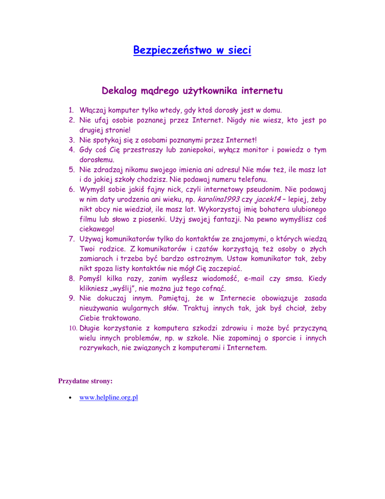 Bezpieczeństwo w sieci Dekalog mądrego uŜytkownika internetu 1. Włączaj komputer tylko wtedy, gdy ktoś dorosły jest w domu. 2. Nie ufaj osobie poznanej przez Internet. Nigdy nie wiesz, kto jest po drugiej stronie! 3. Nie spotykaj się z osobami poznanymi przez Internet! 4. Gdy coś Cię przestraszy lub zaniepokoi, wyłącz monitor i powiedz o tym dorosłemu. 5. Nie zdradzaj nikomu swojego imienia ani adresu! Nie mów teŜ, ile masz lat i do jakiej szkoły chodzisz. Nie podawaj numeru telefonu. 6. Wymyśl sobie jakiś fajny nick, czyli internetowy pseudonim. Nie podawaj w nim daty urodzenia ani wieku, np. karolina1993 czy jacek14 – lepiej, Ŝeby nikt obcy nie wiedział, ile masz lat. Wykorzystaj imię bohatera ulubionego filmu lub słowo z piosenki. UŜyj swojej fantazji. Na pewno wymyślisz coś ciekawego! 7. UŜywaj komunikatorów tylko do kontaktów ze znajomymi, o których wiedzą Twoi rodzice. Z komunikatorów i czatów korzystają teŜ osoby o złych zamiarach i trzeba być bardzo ostroŜnym. Ustaw komunikator tak, Ŝeby nikt spoza listy kontaktów nie mógł Cię zaczepiać. 8. Pomyśl kilka razy, zanim wyślesz wiadomość, e-mail czy smsa. Kiedy klikniesz „wyślij”, nie moŜna juŜ tego cofnąć. 9. Nie dokuczaj innym. Pamiętaj, Ŝe w Internecie obowiązuje zasada nieuŜywania wulgarnych słów. Traktuj innych tak, jak byś chciał, Ŝeby Ciebie traktowano. 10. Długie korzystanie z komputera szkodzi zdrowiu i moŜe być przyczyną wielu innych problemów, np. w szkole. Nie zapominaj o sporcie i innych rozrywkach, nie związanych z komputerami i Internetem. Przydatne strony: • www.helpline.org.pl