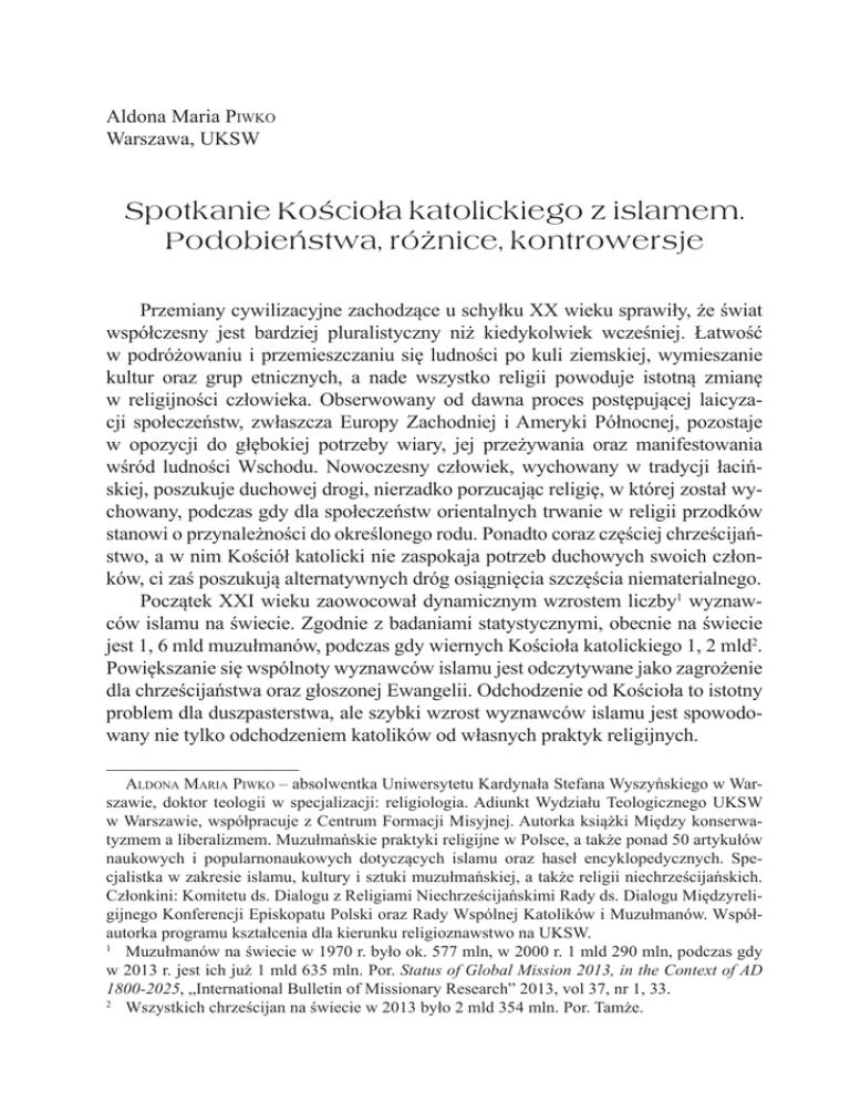 Aldona Maria Piwko Warszawa, UKSW Spotkanie Kościoła katolickiego z islamem. Podobieństwa, różnice, kontrowersje Przemiany cywilizacyjne zachodzące u schyłku XX wieku sprawiły, że świat współczesny jest bardziej pluralistyczny niż kiedykolwiek wcześniej. Łatwość w podróżowaniu i przemieszczaniu się ludności po kuli ziemskiej, wymieszanie kultur oraz grup etnicznych, a nade wszystko religii powoduje istotną zmianę w religijności człowieka. Obserwowany od dawna proces postępującej laicyzacji społeczeństw, zwłaszcza Europy Zachodniej i Ameryki Północnej, pozostaje w opozycji do głębokiej potrzeby wiary, jej przeżywania oraz manifestowania wśród ludności Wschodu. Nowoczesny człowiek, wychowany w tradycji łacińskiej, poszukuje duchowej drogi, nierzadko porzucając religię, w której został wychowany, podczas gdy dla społeczeństw orientalnych trwanie w religii przodków stanowi o przynależności do określonego rodu. Ponadto coraz częściej chrześcijaństwo, a w nim Kościół katolicki nie zaspokaja potrzeb duchowych swoich członków, ci zaś poszukują alternatywnych dróg osiągnięcia szczęścia niematerialnego. Początek XXI wieku zaowocował dynamicznym wzrostem liczby1 wyznawców islamu na świecie. Zgodnie z badaniami statystycznymi, obecnie na świecie jest 1, 6 mld muzułmanów, podczas gdy wiernych Kościoła katolickiego 1, 2 mld2. Powiększanie się wspólnoty wyznawców islamu jest odczytywane jako zagrożenie dla chrześcijaństwa oraz głoszonej Ewangelii. Odchodzenie od Kościoła to istotny problem dla duszpasterstwa, ale szybki wzrost wyznawców islamu jest spowodowany nie tylko odchodzeniem katolików od własnych praktyk religijnych. Aldona Maria Piwko – absolwentka Uniwersytetu Kardynała Stefana Wyszyńskiego w Warszawie, doktor teologii w specjalizacji: religiologia. Adiunkt Wydziału Teologicznego UKSW w Warszawie, współpracuje z Centrum Formacji Misyjnej. Autorka książki Między konserwatyzmem a liberalizmem. Muzułmańskie praktyki religijne w Polsce, a także ponad 50 artykułów naukowych i popularnonaukowych dotyczących islamu oraz haseł encyklopedycznych. Specjalistka w zakresie islamu, kultury i sztuki muzułmańskiej, a także religii niechrześcijańskich. Członkini: Komitetu ds. Dialogu z Religiami Niechrześcijańskimi Rady ds. Dialogu Międzyreligijnego Konferencji Episkopatu Polski oraz Rady Wspólnej Katolików i Muzułmanów. Współautorka programu kształcenia dla kierunku religioznawstwo na UKSW. 1 Muzułmanów na świecie w 1970 r. było ok. 577 mln, w 2000 r. 1 mld 290 mln, podczas gdy w 2013 r. jest ich już 1 mld 635 mln. Por. Status of Global Mission 2013, in the Context of AD 1800-2025, „International Bulletin of Missionary Research” 2013, vol 37, nr 1, 33. 2 Wszystkich chrześcijan na świecie w 2013 było 2 mld 354 mln. Por. Tamże. 250 A. Piwko Celem niniejszego artykułu jest podjęcie próby analizy głównych zasad islamu w ujęciu doktryny Kościoła katolickiego. Zarówno katolicyzm, jak i islam są religiami monoteistycznymi, obie posiadają charyzmatycznych przewodników duchowych, wreszcie obie mają na celu dobro człowieka i jego życie wieczne. Zatem rodzą się pytania: co różni i dzieli dwie największe religie na świecie oraz czy są możliwe płaszczyzny wzajemnego porozumienia, a także współpracy na rzecz ludzkości między Kościołem katolickim a islamem? W artykule zostanie zastosowana metoda analizy historyczno-porównawczej w celu właściwego omówienia problemu. W naukach religiologicznych i religioznawczych3 właśnie ta metoda wydaje się być najbardziej odpowiednia ze względu na możliwości całościowej analizy podjętych zagadnień. Proponowana analiza zostanie przeprowadzona w następujących ujęciach: podobieństwa obu religii, osoba Mahometa, możliwości dialogu z islamem. 1. Wspólny fundament wiary Islam obok judaizmu i chrześcijaństwa należy do trzech wielkich religii monoteistycznych. Jego nauka czerpie z doświadczenia zawartego w Biblii, zarówno Starego, jak również Nowego Testamentu. Obie religie posiadają wspólny fundament, którym jest wiara w jednego Boga. W tym miejscu należy postawić pytanie: czy jest to ten sam Bóg? Czy Bóg – Ojciec chrześcijan jest tym samym Bogiem, co Allah dla muzułmanów? Na tak postawione pytanie można krótko odpowiedzieć: tak, to ten sam Bóg. Pewność dotyczącą osoby tego samego Boga posiadamy z samej nauki islamu, która podkreśla istotną funkcję Abrahama, ojca wiary, w kształtowaniu się doktryny muzułmańskiej: „My wierzymy w Boga i w to, co nam zostało zesłane, i w to, co zostało zesłane Abrahamowi, Isma’ilowi i Izaakowi, Jakubowi i pokoleniom; i w to, co zostało dane prorokom od ich Pana. My nie robimy żadnej różnicy między nimi i poddajemy się Jemu całkowicie” (2, 136)4. Zatem skoro Abraham jest osobą, do której przemówił Bóg przed wiekami oraz z którą zawarł przymierze, a on sam stał się posłuszny Stwórcy, wiemy że chrześcijanie i muzułmanie wierzą w tego samego Boga. Abraham jest także wzorem zawierzenia i posłuszeństwa wobec Boga. Jego gotowość na poświęcenie ukochanego syna – Izmaela5, stanowi o wielkiej wierze 3 Należy pamiętać, że religiologia i religioznawstwo istotnie różnią się między sobą. Owszem, obie nauki opisują zjawisko religii w świecie oraz życiu człowieka, ale religioznawstwo ogranicza się jedynie do jej wymiaru empirycznego, postrzeganego w świetle konkretnych założeń filozoficznych. Religiologia jest natomiast nauką poszerzoną, oprócz zagadnień religioznawczych zajmuje się również teologią i filozofią danej religii. Por. A. Bronk, Podstawy nauk o religii, Lublin 2003, 33; Tenże, Nauki o religii, w: Religia w świecie współczesnym, red. H. Zimoń, Lublin 2000, 29. 4 W artykule wszystkie odwołania do Koranu pochodzą z wydania: Koran z języka arabskiego przełożył i komentarzem