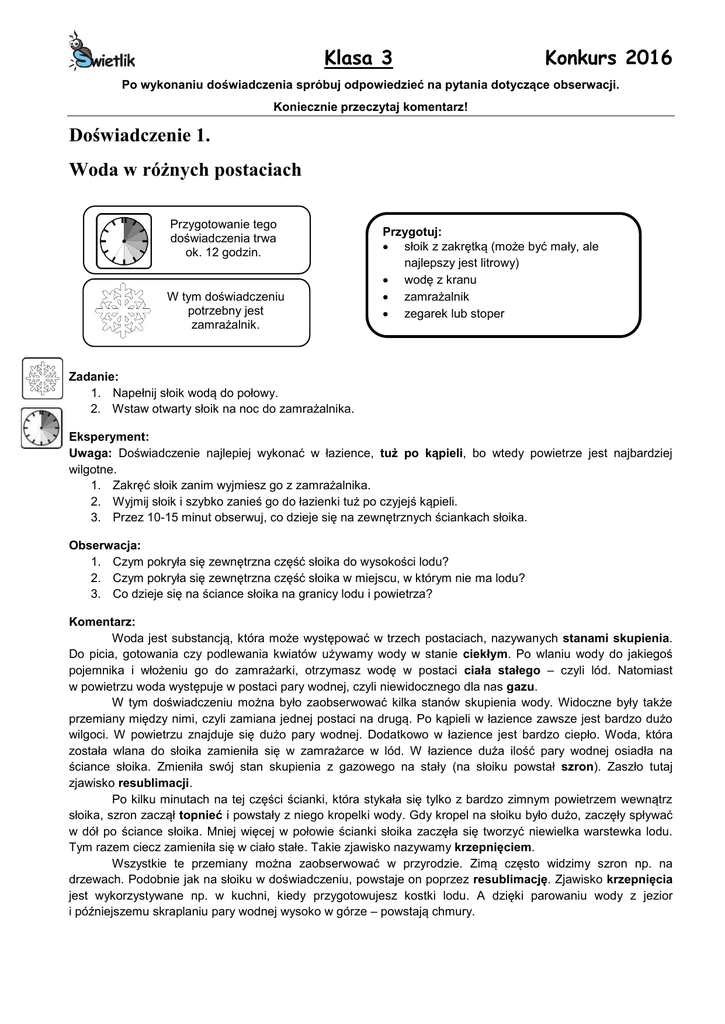 Klasa 3 Konkurs 2016 Po wykonaniu doświadczenia spróbuj odpowiedzieć na pytania dotyczące obserwacji. Koniecznie przeczytaj komentarz! Doświadczenie 1. Woda w różnych postaciach Przygotowanie tego doświadczenia trwa ok. 12 godzin. W tym doświadczeniu potrzebny jest zamrażalnik. Przygotuj: słoik z zakrętką (może być mały, ale najlepszy jest litrowy) wodę z kranu zamrażalnik zegarek lub stoper Zadanie: 1. Napełnij słoik wodą do połowy. 2. Wstaw otwarty słoik na noc do zamrażalnika. Eksperyment: Uwaga: Doświadczenie najlepiej wykonać w łazience, tuż po kąpieli, bo wtedy powietrze jest najbardziej wilgotne. 1. Zakręć słoik zanim wyjmiesz go z zamrażalnika. 2. Wyjmij słoik i szybko zanieś go do łazienki tuż po czyjejś kąpieli. 3. Przez 10-15 minut obserwuj, co dzieje się na zewnętrznych ściankach słoika. Obserwacja: 1. Czym pokryła się zewnętrzna część słoika do wysokości lodu? 2. Czym pokryła się zewnętrzna część słoika w miejscu, w którym nie ma lodu? 3. Co dzieje się na ściance słoika na granicy lodu i powietrza? Komentarz: Woda jest substancją, która może występować w trzech postaciach, nazywanych stanami skupienia. Do picia, gotowania czy podlewania kwiatów używamy wody w stanie ciekłym. Po wlaniu wody do jakiegoś pojemnika i włożeniu go do zamrażarki, otrzymasz wodę w postaci ciała stałego – czyli lód. Natomiast w powietrzu woda występuje w postaci pary wodnej, czyli niewidocznego dla nas gazu. W tym doświadczeniu można było zaobserwować kilka stanów skupienia wody. Widoczne były także przemiany między nimi, czyli zamiana jednej postaci na drugą. Po kąpieli w łazience zawsze jest bardzo dużo wilgoci. W powietrzu znajduje się dużo pary wodnej. Dodatkowo w łazience jest bardzo ciepło. Woda, która została wlana do słoika zamieniła się w zamrażarce w lód. W łazience duża ilość pary wodnej osiadła na ściance słoika. Zmieniła swój stan skupienia z gazowego na stały (na słoiku powstał szron). Zaszło tutaj zjawisko resublimacji. Po kilku minutach na tej części ścianki, która stykała się tylko z bardzo zimnym powietrzem wewnątrz słoika, szron zaczął topnieć i powstały z niego kropelki wody. Gdy kropel na słoiku było dużo, zaczęły spływać w dół po ściance słoika. Mniej więcej w połowie ścianki słoika zaczęła się tworzyć niewielka warstewka lodu. Tym razem ciecz zamieniła się w ciało stałe. Takie zjawisko nazywamy krzepnięciem. Wszystkie te przemiany można zaobserwować w przyrodzie. Zimą często widzimy szron np. na drzewach. Podobnie jak na słoiku w doświadczeniu, powstaje on poprzez resublimację. Zjawisko krzepnięcia jest wykorzystywane np. w kuchni, kiedy przygotowujesz kostki lodu. A dzięki parowaniu wody z jezior i późniejszemu skraplaniu pary wodnej wysoko w górze – powstają chmury. Klasa 3 Konkurs 2016 Po wykonaniu doświadczenia spróbuj odpowiedzieć na pytania dotyczące obserwacji. Koniecznie przeczytaj komentarz! Doświadczenie 2. Solarka Przygotowanie tego doświadczenia trwa ok. 30 minut. W tym doświadczeniu potrzebny jest zamrażalnik. Przygotuj: cztery jednakowe pokrywki od słoików twist lub małe, płaskie talerzyki pół łyżeczki soli pół łyżeczki cukru pół łyżeczki mąki pół łyżeczki piasku wodę z kranu łyżkę zegarek Zadanie: 1. Odmierz i wlej do każdej pokrywki po jednej łyżce wody tak, aby zajmowała ona jak największą powierzchnię. 2. Włóż pokrywki do zamrażalnika. Uważaj, aby nie rozlać wody! 3. Odczekaj 30 minut. Eksperyment: 1. Wyciągnij na raz wszystkie pokrywki z zamrażalnika i połóż je na płaskim blacie. 2. Na powierzchnię lodu w pierwszej pokrywce wsyp pół łyżeczki soli. 3. Na powierzchnię lodu w drugiej pokrywce wsyp pół łyżeczki cukru. 4. Na powierzchnię lodu w trzeciej pokrywce wsyp pół łyżeczki mąki. 5. Na powierzchnię lodu w czwartej pokrywce wsyp pół łyżeczki piasku. 6. Obserwuj, co się dzieje z lodem we wszystkich pokrywkach. Obserwacja: 1. W której pokrywce lód roztopił się najszybciej? Komentarz: Czysta woda zamarza w temperaturze . Dlatego, aby otrzymać lód, wodę należy umieścić w zamrażalce, gdzie temperatura jest ujemna. W lodówce temperatura jest wyższa niż i woda nie zamarza. Woda z rozpuszczonymi w niej innymi substancjami np. solą zamarza w niższej temperaturze niż . Gdy na lód wysypiemy sól, zaczyna się ona łączyć z lodem i powstaje mieszanina, która nie jest lodem, a cieczą (musielibyśmy ją umieścić w bardzo niskiej temperaturze, żeby zamarzła ponownie). Ciecz nie tworzy się na powierzchni lodu, gdy wysypiemy na nią cukier, mąkę lub piasek. Gdy przy mokrej jezdni temperatura spadnie nieco poniżej zera, na drodze tworzy się cienka warstwa lodu, na której pojazdy łatwo mogą wpaść w poślizg. Wówczas na trasę wyjeżdżają solarki, które posypują jezdnię solą, dzięki czemu zmniejsza się ryzyko poślizgu dla aut, bo lód topnieje. Czasem w zimie na lód powstały na chodnikach zamiast soli wysypuje się piasek. Nie powoduje on jednak roztopienia lodu, a tylko pokrycie go chropowatą warstwą, dzięki czemu trudniej jest się na nim poślizgnąć. Klasa 3 Konkurs 2016 Po wykonaniu doświadczenia spróbuj odpowiedzieć na pytania dotyczące obserwacji. Koniecznie przeczytaj komentarz! Doświadczenie 3. Dlaczego Ziemia jest spłaszczona? Przygotuj: kartkę papieru formatu A4 ołówek z gumką do mazania nożyczki pinezkę Zadanie: 1. Wydrukuj tę stronę opisu eksperymentu. 2. Wzdłuż linii zaznaczonych po prawej stronie symbolem nożyczek wytnij pasek papieru. 3. W zaznaczonym miejscu paska wytnij otwór. 4. Pasek papieru zwiń w okrąg tak, aby końce paska nachodziły na siebie. 5. Pinezką przebij złożone końce paska. Pinezkę zostaw wpiętą w pasek. 6. Przez otwór w pasku przełóż ołówek, tak jak na rysunku. Uwaga: otwór musi być większy od ołówka. Jeśli jest za ma