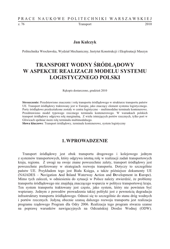PRACE NAUKOWE POLITECHNIKI WARSZAWSKIEJ z. 76 Transport 2010 Jan Kulczyk Politechnika Wrocawska, Wydzia Mechaniczny, Instytut Konstrukcji i Eksploatacji Maszyn TRANSPORT WODNY RÓDLDOWY W ASPEKCIE REALIZACJI MODELU SYSTEMU LOGISTYCZNEGO POLSKI Rkopis dostarczono, grudzie 2010 Streszczenie: Przedstawiono znaczenie i rol transportu ródldowego w strukturze transportu pastw UE. Transport ródldowy traktowany jest w Europie, jako znaczcy element systemu logistycznego. Porty ródldowe przeksztacone zostay w centra logistyczne – multimodalne terminale kontenerowe. Przedstawiono model typowego rzecznego terminalu kontenerowego. W warunkach polskich transport ródldowy odgrywa rol marginaln. Z wielu istniejcych portów rzecznych, tylko port w Gliwicach spenia moe rol terminalu multimodalnego. Sowa kluczowe: Transport ródldowy, terminale kontenerowe, system logistyczny 1. WPROWADZENIE Transport ródldowy jest obok transportu drogowego i kolejowego jednym z systemów transportowych, który odgrywa istotn rol w realizacji zada transportowych kraju, regionu. Z uwagi na swoje znane powszechnie zalety, transport ródldowy jest powszechnie preferowany w strategiach rozwoju transportu. Dotyczy to szczególnie pastw UE. Przykadem tego jest Biaa Ksiga, a take póniejsze dokumenty UE (NAIADES – Navigation And Inland Waterway Action and Development in Europe). Mimo tych zalece, w odniesieniu do sytuacji w Polsce naley stwierdzi , e problemy transportu ródldowego nie znajduj znaczcego wsparcia w polityce transportowej kraju. Ten system transportu traktowany jest czsto, jako system, który nie powinien by wspierany. Jednym z powodów prowadzenia takiej polityki jest z pewnoci degradacja infrastruktury transportu ródldowego. Odnosi si to szczególnie do stanu dróg wodnych i portów rzecznych. Jedyn obecnie szans dalszego rozwoju transportu jest realizacja programu rzdowego Program dla Odry 2006. Realizacja tego program stwarza szanse na popraw warunków nawigacyjnych na Odrzaskiej Drodze Wodnej (ODW). 66 Jan Kulczyk 2. TRANSPORT W KRAJACH UNII EUROPEJSKIEJ W krajach UE, w których wystpuj naturalne warunki do uprawiania eglugi ródldowej obserwuje si stabilizacj udziau transportu ródldowego w caoci pracy transportowej. Gówne kierunki, korytarze transportu ródldowego w Europie to[9]: Korytarz Reski na który przypada 2/3 transportu w krajach Europy Zachodniej (200,5 mln ton adunku), o dunajska wraz z kanaem Ren-Men-Dunaj (50,4 mln ton adunku), o pónoc poudnie – Francja, Belgia, Holandia (72,8 mln ton), o wschód zachód – poczenie midzy Holandi, Niemcami, Polsk i Czechami (27,5 mln ton). Wyszczególnione tu wielkoci przewozów na poszczególnych kierunkach nie mog by sumowane do okrelenia globalnej iloci transportu adunku na drogach wodnych Europy. Ten sam adunek moe by transportowany i wliczany do kilku kierunków. W tabl. 1 przedstawiono wielko transportu ródldowego w wybranych krajach Europy. Tabl. 2 przedstawia struktur transportu na Renie. Tablica 1 Transport ródldowy w wybranych krajach europejskich Przewozy adunków w tonach tys. ton Praca przewozowa mln tkm Pastwo Austria 2004 9074 2005 9338 2006 10191 2007 12107 2004 1747 2005 17 53 2006 1837 2007 2597 Belgia 147765 148400 137849 139273 8392 8566 8908 9000 1172 1613 1141 1141 48 64 44 36 328170 324281 317785 324141 43092 42225 42310 42500 Czechy Holandia Francja 68955 70063 71432 76004 8420 8905 9005 9208 Niemcy 235862 236766 243376 248974 63668 64095 63975 64716 Sowacja 2606 2184 6066 8013 91 88 106 1004 Wgry 4209 5012 7326 8410 1904 2110 1913 2212 ródlo: Opracowanie wasne na podst [2][9] Udzia transportu ródldowego w caoci pracy przewozowej pastw UE waha si od 3,3 do 3,9%. Jeli pomin transport morski to ten udzia wzrasta do ok. 6%. Naley tu jednak podkreli , e w szeregu pastw UE z uwagi na warunki geograficzne transport ródldowy nie jest uprawiany (pastwa skandynawskie, Hiszpania, Portugalia, Irlandia, Wochy, Grecja). Cakowita praca przewozowa wzrosa w roku 2006 w stosunku do roku 1995 o 35,3%. W tym samym okresie wzrost transportu ródldowego wyniós 17,2%. Transport wodny ródldowy w aspekcie realizacji modelu systemu … 67 Tablica 2 Struktura transportu na Renie Rok 2006 Rok 2007 Rodzaj adunku 1000 t mln tkm 1000 t mln tkm 0 Produkty rolnicze i lene 7619 2275 7903 2240 1 Artykuy spoywcze i pasze 11213 2484 11805 2607 2 Wgiel 28343 5559 29208 5610 3 Ropa naftowa, produkty przerobu ropy 32569 8386 29185 7138 4 Ruda, zom metalowy 33693 4135 34311 4231 5 Stal i metale kolorowe 12376 2376 14319 2765 6 Kruszywa, materiay budowlane 41337 7574 42504 7897 7 Nawozy sztuczne 4198 1182 4299 1225 8 Wyroby chemiczne 16513 3694 18195 3851 9 Pojazdy, maszyny, pófabrykaty i inne 18799 5762 20167 6130 Razem 206660 43357 211896 43694 ródo: Zentral Kommision fur Rheinschifffahrt,[4],[5] 1000 t 7292 Rok 2008 mln tkm 2059 11934 2839 2617 5486 30390 33788 12984 7713 4285 2615 42878 4212 17474 8151 1206 3806 19059 208320 5751 43690 Na Renie w roku 2007 nastpi dalszy wzrost transportu. W tonach adunku wzrost ten wyniós ok. 2,5%, a w pracy przewozowej 0,8%. Dodatni wzrost nastpi we wszystkich rodzajach adunku poza rop naftow i produktami przerobu ropy (spadek o ok. 10,4%). Najwyszy wzrost zanotowano w transporcie wyrobów stalowych i metale kolorowe (15,7%), wyrobów chemicznych (10,2%) i w grupie pojazdy, maszyny pófabrykaty (7,5%). W roku 2008 w stosunku do roku 2007 nastpi spadek liczc w tonach adunku o ok. 1,7% przy w zasadzie nie zmienionej pracy przewozowej. Notowany spadek ma cisy zwizek z kryzysem w roku 2008. W strukturze transportu na Renie w dalszym cigu dominuj adunki masowe. Ponad 50% adunków to kruszywa i materiay budowlane, wgiel oraz ropa naftowa i produkty przerobu ropy. Rozwój nowych energooszczdnych gazi przemysu, ograniczy zapotrzebowanie na transport adunków masowych. Mona zaoy , e udzia tych adunków ustabilizowa si i nie bdzie wykazywa tendencji wzrostowej. Od wielu lat w caoci pracy przewozowej wzrasta udzia transportu t