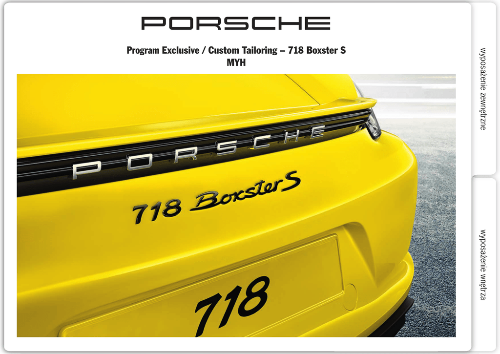 wyposażenie zewnętrzne Program Exclusive / Custom Tailoring – 718 Boxster S MYH wyposażenie wnętrza Cena PLN Nadwozie CGU Osłony układu mycia reflektorów lakierowane na kontrastowy kolor nadwozia. Wykończenie w kontrastowym kolorze nadwozia: osłony układu mycia reflektorów CAS Oznaczenie modelu na drzwiach w kolorze czarnym. Oznaczenie modelu „718 Boxster S” na drzwiach w kolorze czarnym CAT Oznaczenie modelu na drzwiach w kolorze srebrnym. Oznaczenie modelu „718 Boxster S” na drzwiach w kolorze srebrnym CAC Lakierowane boczne kratki wlotów powietrza z tyłu. Lakierowane w kolorze nadwozia. Możliwość wyboru innego lakieru w momencie składania zamówienia • 1041 • 1070 • 1070 • 2387 CKX Lakierowane kratki wlotów powietrza z przodu • 2509 CNG Lakierowany tylny zderzak • 2387 wyposażenie zewnętrzne 718 Boxster S Program Exclusive / Custom Tailoring – 718 Boxster S MYH Kod wyposażenie wnętrza –1– Cena PLN Wyposażenie wnętrza Lakierowane prowadnice pasów bezpieczeństwa sportowych foteli kubełkowych. Lakier w kolorze nadwozia: prowadnice pasów bezpieczeństwa sportowych foteli CMT kubełkowych Uwaga: lakier w kontrastowym kolorze nadwozia dostępny na życzenie • 2327 Lakierowany kluczyk i skórzane etui. Lakier w kolorze nadwozia: obie strony kluczyka (kluczyk główny i zapasowy). Wykończenie gładką skórą w kolorze wnętrza DFS z wytłoczonym herbem Porsche i dekoracyjnymi przeszyciami: etui na kluczyk. Dowolnie wybrany kolor spośród wszystkich kolorów standardowych i naturalnej skóry. Ze skórzaną tapicerką w dwóch kolorach, zatrzask (bez przycisku), obie boczne krawędzie i przeszycia będą wykonane w jaśniejszym kolorze • 1867 Wnętrze wykończone skórą CXM Pakiet osłon drzwi wykończonych skórą. Wykończenie gładką skórą w kolorze wnętrza: osłony przednich drzwi, osłony lusterek i osłony końcowe drzwi Uwaga: W połączeniu z asystentem zmiany pasa ruchu wykończenie skórą bez osłony lusterek • 2449 CDT Zamki pasów bezpieczeństwa wykończone skórą. Wykończenie gładką skórą w kolorze wnętrza. Uwaga: Nie w połączeniu z czerwoną skórą • 2265 CUJ Pokrywa skrzynki bezpieczników wykończona skórą. Wykończenie gładką skórą w kolorze wnętrza z dekoracyjnymi przeszyciami. • 1348 Spersonalizowane dywaniki ze skórzanym obramowaniem. Zestaw dwóch dywaników. Dywaniki w kolorach: Black, Agate Grey, Luxor Beige, Saddle Brown, Graphite Blue, Bordeaux Red, Espresso. Z obramowaniem z gładkiej skóry i podwójnym dekoracyjnym przeszyciem. Ze skórzanymi aplikacjami z wytłoczonym logo „PORSCHE” CFX i dekoracyjnym przeszyciem. Wybrany kolor dywaników, skórzanego obramowania, aplikacji i przeszyć dekoracyjnych spośród wszystkich kolorów standardowych, specjalnych i kolorów naturalnej skóry. Inne kolory dostępne na życzenie. • 1623 Pakiet osłon deski rozdzielczej wykończonych skórą. Wykończenie gładką skórą w kolorze wnętrza, częściowo z dekoracyjnymi przeszyciami: górna osłona końcowa deski rozdzielczej, dolna osłona końcowa deski rozdzielczej, panel rozmrażania przedniej szyby i osłona głośnika w środkowej części deski rozdzielczej • 5693 • 3366 Spersonalizowane dywaniki z włókna węglowego ze skórzanym obramowaniem. Zestaw dwóch dywaników wykonanych z włókna węglowego ze skórzanym obramowaniem CHN i przeszyciami w wybranym kolorze (wszystkie kolory standardowe, specjalne i kolory naturalnej skóry). Kolor skórzanego obramowania, kolor przeszyć. Uwaga: Skóra i przeszycia są dostępne na życzenie w innych kolorach • 3366 Spersonalizowane nakładki progów wykończone włóknem węglowym, podświetlane. Zewnętrzne nakładki progów wykończone włóknem węglowym, ze spersonalizowanym CXE logo, podświetlane na biało. Uwaga: Składając zamówienie, proszę przekazać Porsche Centrum szablon swojego spersonalizowanego logo • 5509 Spersonalizowane nakładki progów wykonane z aluminium, podświetlane. Zewnętrzne nakładki progów wykończone aluminium, ze spersonalizowanym logo, podświetlane na CXC biało. Specjalny formularz zamówienia zewnętrznych nakładek progów ze spersonalizowanym logo • Uwaga: Składając zamówienie, proszę przekazać Porsche Centrum szablon swojego spersonalizowanego logo 3979 CZW wyposażenie zewnętrzne 718 Boxster S Program Exclusive / Custom Tailoring – 718 Boxster S MYH Kod Wnętrze wykończone włóknem węglowym Dywaniki z włókna węglowego ze skórzanym obramowaniem. Zestaw dwóch dywaników wykonanych z włókna węglowego ze skórzanym obramowaniem i przeszyciami w kolorze czarnym Wnętrze wykończone aluminium Różne CXX Indywidualna opcja CT. Indywidualna opcja CT (tylko po uzgodnieniu) • –2– wyposażenie wnętrza CHM