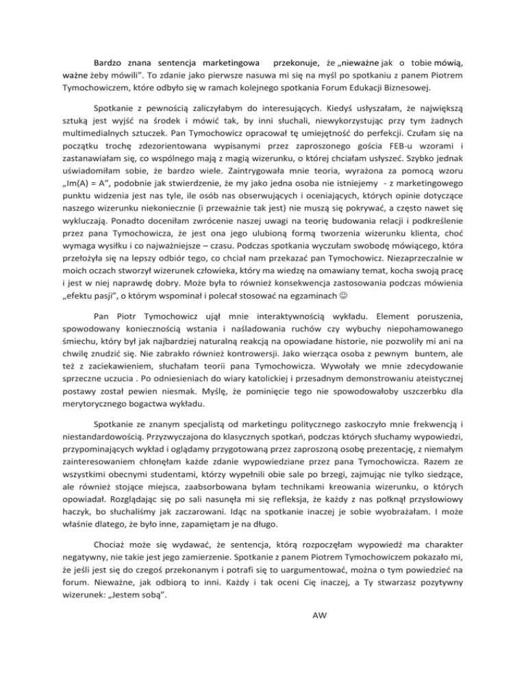 Bardzo znana sentencja marketingowa przekonuje, że „nieważne jak o tobie mówią, ważne żeby mówili”. To zdanie jako pierwsze nasuwa mi się na myśl po spotkaniu z panem Piotrem Tymochowiczem, które odbyło się w ramach kolejnego spotkania Forum Edukacji Biznesowej. Spotkanie z pewnością zaliczyłabym do interesujących. Kiedyś usłyszałam, że największą sztuką jest wyjśd na środek i mówid tak, by inni słuchali, niewykorzystując przy tym żadnych multimedialnych sztuczek. Pan Tymochowicz opracował tę umiejętnośd do perfekcji. Czułam się na początku trochę zdezorientowana wypisanymi przez zaproszonego gościa FEB-u wzorami i zastanawiałam się, co wspólnego mają z magią wizerunku, o której chciałam usłyszed. Szybko jednak uświadomiłam sobie, że bardzo wiele. Zaintrygowała mnie teoria, wyrażona za pomocą wzoru „Im(A) = A”, podobnie jak stwierdzenie, że my jako jedna osoba nie istniejemy - z marketingowego punktu widzenia jest nas tyle, ile osób nas obserwujących i oceniających, których opinie dotyczące naszego wizerunku niekoniecznie (i przeważnie tak jest) nie muszą się pokrywad, a często nawet się wykluczają. Ponadto doceniłam zwrócenie naszej uwagi na teorię budowania relacji i podkreślenie przez pana Tymochowicza, że jest ona jego ulubioną formą tworzenia wizerunku klienta, chod wymaga wysiłku i co najważniejsze – czasu. Podczas spotkania wyczułam swobodę mówiącego, która przełożyła się na lepszy odbiór tego, co chciał nam przekazad pan Tymochowicz. Niezaprzeczalnie w moich oczach stworzył wizerunek człowieka, który ma wiedzę na omawiany temat, kocha swoją pracę i jest w niej naprawdę dobry. Może była to również konsekwencja zastosowania podczas mówienia „efektu pasji”, o którym wspominał i polecał stosowad na egzaminach Pan Piotr Tymochowicz ujął mnie interaktywnością wykładu. Element poruszenia, spowodowany koniecznością wstania i naśladowania ruchów czy wybuchy niepohamowanego śmiechu, który był jak najbardziej naturalną reakcją na opowiadane historie, nie pozwoliły mi ani na chwilę znudzid się. Nie zabrakło również kontrowersji. Jako wierząca osoba z pewnym buntem, ale też z zaciekawieniem, słuchałam teorii pana Tymochowicza. Wywołały we mnie zdecydowanie sprzeczne uczucia . Po odniesieniach do wiary katolickiej i przesadnym demonstrowaniu ateistycznej postawy został pewien niesmak. Myślę, że pominięcie tego nie spowodowałoby uszczerbku dla merytorycznego bogactwa wykładu. Spotkanie ze znanym specjalistą od marketingu politycznego zaskoczyło mnie frekwencją i niestandardowością. Przyzwyczajona do klasycznych spotkao, podczas których słuchamy wypowiedzi, przypominających wykład i oglądamy przygotowaną przez zaproszoną osobę prezentację, z niemałym zainteresowaniem chłonęłam każde zdanie wypowiedziane przez pana Tymochowicza. Razem ze wszystkimi obecnymi studentami, którzy wypełnili obie sale po brzegi, zajmując nie tylko siedzące, ale również stojące miejsca, zaabsorbowana byłam technikami kreowania wizerunku, o których opowiadał. Rozglądając się po sali nasunęła mi się refleksja, że każdy z nas połknął przysłowiowy haczyk, bo słuchaliśmy jak zaczarowani. Idąc na spotkanie inaczej je sobie wyobrażałam. I może właśnie dlatego, że było inne, zapamiętam je na długo. Chociaż może się wydawad, że sentencja, którą rozpoczęłam wypowiedź ma charakter negatywny, nie takie jest jego zamierzenie. Spotkanie z panem Piotrem Tymochowiczem pokazało mi, że jeśli jest się do czegoś przekonanym i potrafi się to uargumentowad, można o tym powiedzied na forum. Nieważne, jak odbiorą to inni. Każdy i tak oceni Cię inaczej, a Ty stwarzasz pozytywny wizerunek: „Jestem sobą”. AW