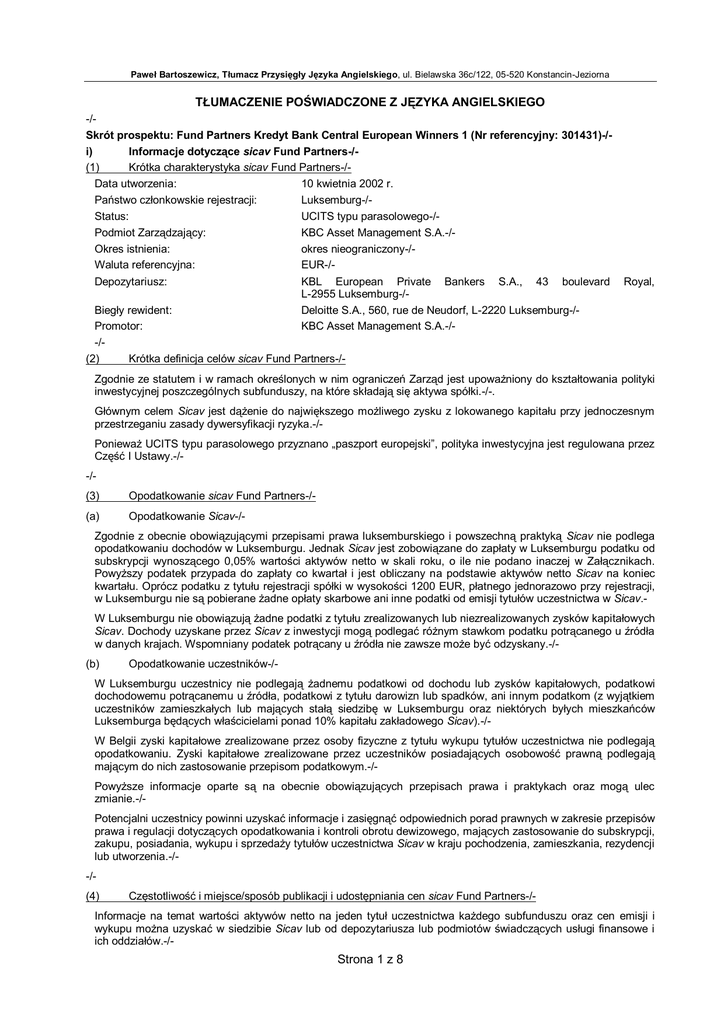 Paweł Bartoszewicz, Tłumacz Przysięgły Języka Angielskiego, ul. Bielawska 36c/122, 05-520 Konstancin-Jeziorna TŁUMACZENIE POŚWIADCZONE Z JĘZYKA ANGIELSKIEGO -/Skrót prospektu: Fund Partners Kredyt Bank Central European Winners 1 (Nr referencyjny: 301431)-/i) Informacje dotyczące sicav Fund Partners-/(1) Krótka charakterystyka sicav Fund Partners-/Data utworzenia: 10 kwietnia 2002 r. Państwo członkowskie rejestracji: Luksemburg-/Status: UCITS typu parasolowego-/Podmiot Zarządzający: KBC Asset Management S.A.-/Okres istnienia: okres nieograniczony-/Waluta referencyjna: EUR-/Depozytariusz: KBL European Private Bankers S.A., 43 boulevard L-2955 Luksemburg-/Biegły rewident: Deloitte S.A., 560, rue de Neudorf, L-2220 Luksemburg-/Promotor: KBC Asset Management S.A.-/-/(2) Krótka definicja celów sicav Fund Partners-/- Royal, Zgodnie ze statutem i w ramach określonych w nim ograniczeń Zarząd jest upoważniony do kształtowania polityki inwestycyjnej poszczególnych subfunduszy, na które składają się aktywa spółki.-/-. Głównym celem Sicav jest dążenie do największego możliwego zysku z lokowanego kapitału przy jednoczesnym przestrzeganiu zasady dywersyfikacji ryzyka.-/Ponieważ UCITS typu parasolowego przyznano „paszport europejski”, polityka inwestycyjna jest regulowana przez Część I Ustawy.-/-/(3) Opodatkowanie sicav Fund Partners-/- (a) Opodatkowanie Sicav-/- Zgodnie z obecnie obowiązującymi przepisami prawa luksemburskiego i powszechną praktyką Sicav nie podlega opodatkowaniu dochodów w Luksemburgu. Jednak Sicav jest zobowiązane do zapłaty w Luksemburgu podatku od subskrypcji wynoszącego 0,05% wartości aktywów netto w skali roku, o ile nie podano inaczej w Załącznikach. Powyższy podatek przypada do zapłaty co kwartał i jest obliczany na podstawie aktywów netto Sicav na koniec kwartału. Oprócz podatku z tytułu rejestracji spółki w wysokości 1200 EUR, płatnego jednorazowo przy rejestracji, w Luksemburgu nie są pobierane żadne opłaty skarbowe ani inne podatki od emisji tytułów uczestnictwa w Sicav.W Luksemburgu nie obowiązują żadne podatki z tytułu zrealizowanych lub niezrealizowanych zysków kapitałowych Sicav. Dochody uzyskane przez Sicav z inwestycji mogą podlegać różnym stawkom podatku potrącanego u źródła w danych krajach. Wspomniany podatek potrącany u źródła nie zawsze może być odzyskany.-/(b) Opodatkowanie uczestników-/- W Luksemburgu uczestnicy nie podlegają żadnemu podatkowi od dochodu lub zysków kapitałowych, podatkowi dochodowemu potrącanemu u źródła, podatkowi z tytułu darowizn lub spadków, ani innym podatkom (z wyjątkiem uczestników zamieszkałych lub mających stałą siedzibę w Luksemburgu oraz niektórych byłych mieszkańców Luksemburga będących właścicielami ponad 10% kapitału zakładowego Sicav).-/W Belgii zyski kapitałowe zrealizowane przez osoby fizyczne z tytułu wykupu tytułów uczestnictwa nie podlegają opodatkowaniu. Zyski kapitałowe zrealizowane przez uczestników posiadających osobowość prawną podlegają mającym do nich zastosowanie przepisom podatkowym.-/Powyższe informacje oparte są na obecnie obowiązujących przepisach prawa i praktykach oraz mogą ulec zmianie.-/Potencjalni uczestnicy powinni uzyskać informacje i zasięgnąć odpowiednich porad prawnych w zakresie przepisów prawa i regulacji dotyczących opodatkowania i kontroli obrotu dewizowego, mających zastosowanie do subskrypcji, zakupu, posiadania, wykupu i sprzedaży tytułów uczestnictwa Sicav w kraju pochodzenia, zamieszkania, rezydencji lub utworzenia.-/-/(4) Częstotliwość i miejsce/sposób publikacji i udostępniania cen sicav Fund Partners-/- Informacje na temat wartości aktywów netto na jeden tytuł uczestnictwa każdego subfunduszu oraz cen emisji i wykupu można uzyskać w siedzibie Sicav lub od depozytariusza lub podmiotów świadczących usługi finansowe i ich oddziałów.-/- Strona 1 z 8 (5) Koszty lub prowizje opłacane przez sicav Fund Partners-/- Sicav będzie ponosić wszelkie koszty przypadające do zapłaty przez Sicav, w tym między innymi koszt zmiany statutu oraz koszty operacyjne obejmujące między innymi:-/(a) Koszty dystrybucji-/- Sicav może wypłacać prowizje od sprzedaży dystrybutorom wprowadzającym do obrotu tytuły uczestnictwa subfunduszy. W takim przypadku sposób naliczania i wysokość procentowa prowizji zostaną wskazane w opisie danego subfunduszu.-/(b) Pozostałe koszty-/ wynagrodzenie i określone koszty Zarządu;-/- prowizja dla Podmiotu Zarządzającego;-/- prowizja dla depozytariusza i ewentualnie jego banków-korespondentów (wyliczana na podstawie zwyczajowych opłat bankowych z tytułu deponowania aktywów i przechowywania papierów wartościowych, płatna co kwartał jako kwota procentowa aktywów netto);-/- wynagrodzenie dla biegłych rewidentów;-/- wynagrodzenie za usługi prawnicze;-/- wydatki na publikację prospektu oraz rocznych i półrocznych sprawozdań Sicav oraz pozostałych informacji dla uczestników, a także opłaty i podatki, prowizje dla pośredników i opłaty rejestracyjne, opłaty za druk papierów wartościowych i wszelkie kwoty należne organom nadzorczym krajów, w których tytuły uczestnictwa są oferowane w sprzedaży;-/- wydatki związane z rejestracją spółki, szacowane na 12 500 EUR, które będą amortyzowane przez okres pięciu lat od pierwszego dnia następującego po zakończeniu okresu pierwotnej subskrypcji;-/- prowizje dla pośredników;-/- podatki płatne przez Sicav;-/- opłaty z tytułu rejestracji Sicav i utrzymania wpisu rejestracyjnego przez organy rządowe.-/- W odniesieniu do inwestorów każdy subfundusz jest traktowany jako odrębny podmiot.-/Prawa wierzycieli w stosunku do subfunduszu lub związane z utworzeniem, funkcjonowaniem lub likwidacją subfunduszu są ograniczone do aktywów subfunduszu. Aktywa subfunduszu będą wykorzystywane wyłącznie na rzecz wierzycieli, których prawa 