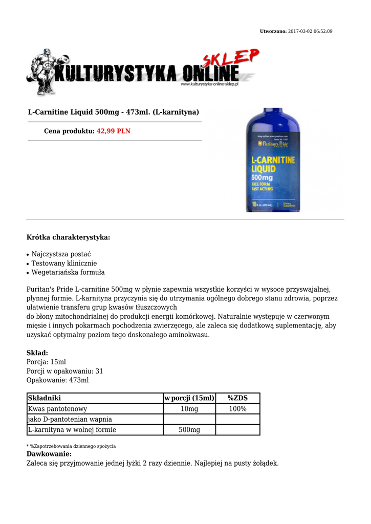 Utworzono: 2017-03-02 06:52:09 L-Carnitine Liquid 500mg - 473ml. (L-karnityna) Cena produktu: 42,99 PLN Krótka charakterystyka: ● ● ● Najczystsza postać Testowany klinicznie Wegetariańska formuła Puritan's Pride L-carnitine 500mg w płynie zapewnia wszystkie korzyści w wysoce przyswajalnej, płynnej formie. L-karnityna przyczynia się do utrzymania ogólnego dobrego stanu zdrowia, poprzez ułatwienie transferu grup kwasów tłuszczowych do błony mitochondrialnej do produkcji energii komórkowej. Naturalnie występuje w czerwonym mięsie i innych pokarmach pochodzenia zwierzęcego, ale zaleca się dodatkową suplementację, aby uzyskać optymalny poziom tego doskonałego aminokwasu. Skład: Porcja: 15ml Porcji w opakowaniu: 31 Opakowanie: 473ml Składniki Kwas pantotenowy w porcji (15ml) %ZDS 10mg 100% jako D-pantotenian wapnia L-karnityna w wolnej formie 500mg * %Zapotrzebowania dziennego spożycia Dawkowanie: Zaleca się przyjmowanie jednej łyżki 2 razy dziennie. Najlepiej na pusty żołądek. Adres: http://www.ko.sklep.pl/ Telefon: kom. 782 010 880 Email: [email protected]