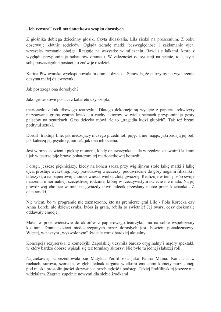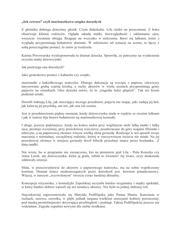 „Ich czworo” czyli marionetkowa szopka dorosłych Z głośnika dobiega dziecinny głosik. Czyta didaskalia. Lila siedzi na proscenium. Z boku obserwuje kłótnie rodziców. Ogląda zdradę matki, bezwzględność i zakłamanie ojca, wreszcie- rozstanie obojga. Reaguje na wszystko w milczeniu. Bawi się lalkami, które z wyglądu przypominają bohaterów dramatu. W zależności od sytuacji na scenie, to łączy z sobą poszczególne postaci, to znów je rozdziela. Karina Piwowarska wyeksponowała tu dramat dziecka. Sprawiła, że patrzymy na wydarzenia oczyma małej dziewczynki. Jak postrzega ona dorosłych? Jako groteskowe postaci z kabaretu czy szopki, marionetki z kukiełkowego teatrzyku. Dlatego dekoracje są wycięte z papieru, rekwizyty narysowane grubą czarną kreską, a ruchy aktorów w wielu scenach przypominają gesty pajaców na sznurkach. Głos dziecka mówi, że to „tragedia ludzi głupich”. Tak też brzmi podtytuł sztuki. Dorośli traktują Lilę, jak nieczujący niczego przedmiot; pojęcia nie mając, jaki zadają jej ból, jak kaleczą jej psychikę, ani też, jak ona ich ocenia. Jest w przedstawieniu piękny moment, kiedy dziewczynka siada w rzędzie ze swoimi lalkami i jak w teatrze bije brawo bohaterom tej marionetkowej komedii. I drugi, jeszcze piękniejszy, kiedy na końcu sadza przy wigilijnym stole lalkę matki i lalkę ojca, prostuje wcześniej, przy prawdziwej wieczerzy, poodwracane do góry nogami filiżanki i talerzyki, a na papierowej choince wiesza wielką złotą gwiazdę. Realizuje w ten sposób swoje marzenia o normalnej, szczęśliwej rodzinie, której w rzeczywistym świecie nie miała. Na jej prawdziwej choince w miejscu gwiazdy tkwił bilecik przesłany matce przez kochanka…Z datą randki. Nie wiem, bo w programie nie zaznaczono, kto na premierze grał Lilę - Pola Korecka czy Anna Lorek, ale dziewczynka, która ją grała, robiła to świetnie! Jej twarz, oczy doskonale oddawały emocje. Mała, w przeciwieństwie do aktorów z papierowego teatrzyku, ma na sobie współczesny kostium. Dramat dzieci niedostrzeganych przez dorosłych jest bowiem ponadczasowy. Więcej, w naszym „wyzwolonym” świecie coraz bardziej aktualny. Koncepcja reżyserska, z komedyjki Zapolskiej uczyniła bardzo oryginalny i mądry spektakl, w który bardzo dobrze wpisali się też toruńscy aktorzy. Nie było tu jednej słabszej roli. Najciekawiej zaprezentowała się Matylda Podfilipska jako Panna Mania. Kanciasta w ruchach, surowa, szorstka, w głębi jednak targana wielkimi emocjami kobiety porzuconej; pod maską prostolinijności skrywająca przebiegłość i podstęp. Takiej Podfilipskiej jeszcze nie widziałam. Zagrała zupełnie nowymi dla siebie środkami. Zachwyciła mnie też wielkim urokiem i komediowym wdziękiem Wanda Ślęzak w roli zakochanej Wdowy. Wspaniale w postać uwodziciela bez zobowiązań, Fedyckiego, wcielił się Michał Marek Ubysz. Szeroką gamę środków komediowych zaprezentowała tu też Maria Kierzkowska jako Żona. Zabawnie w śmiertelnej powadze Męża-rogacza, mieszczańskiego kołtuna, przedstawił się Marek Milczarczyk. Największe brawa po Karinie Piwowarskiej należą się tu jednak Katarzynie Paciorek za oryginalną scenografię i bardzo gustowne kostiumy! Choć „Ich czworo” to, co prawda, nie „Dulska”, ale w takiej postaci ten dramat warto było pokazać. Anita Nowak (Recenzja wyemitowana 8 maja 2011 w „Śniadaniu z Muzami” na antenie Radia PiK)