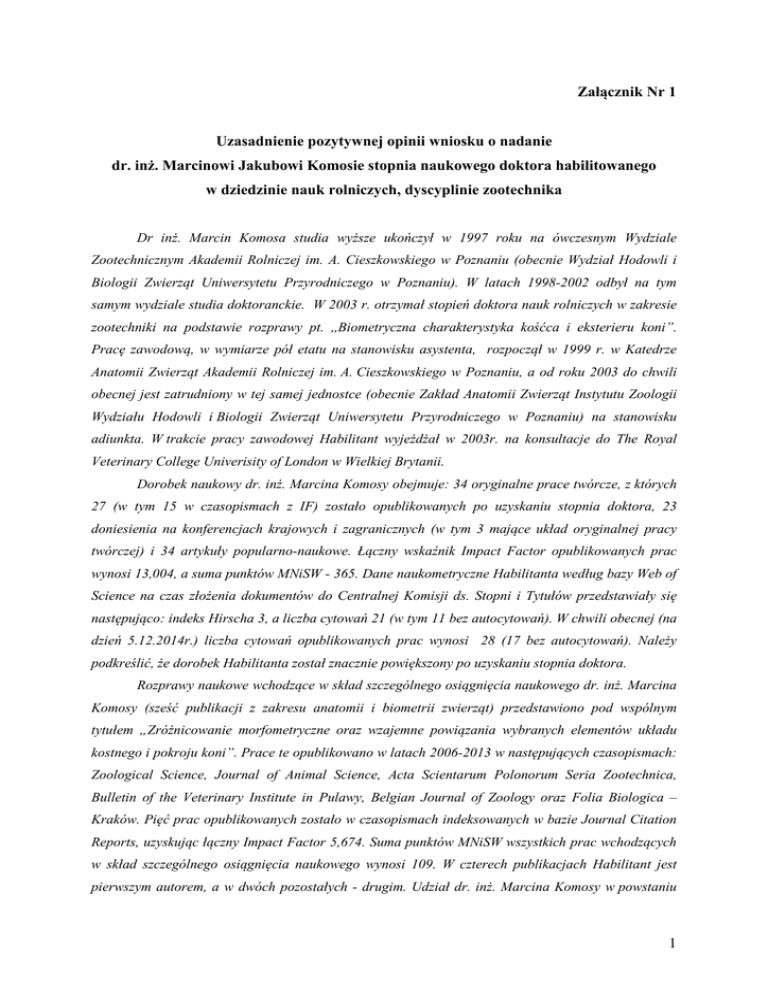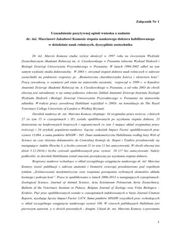Załącznik Nr 1 Uzasadnienie pozytywnej opinii wniosku o nadanie dr. inż. Marcinowi Jakubowi Komosie stopnia naukowego doktora habilitowanego w dziedzinie nauk rolniczych, dyscyplinie zootechnika Dr inż. Marcin Komosa studia wyższe ukończył w 1997 roku na ówczesnym Wydziale Zootechnicznym Akademii Rolniczej im. A. Cieszkowskiego w Poznaniu (obecnie Wydział Hodowli i Biologii Zwierząt Uniwersytetu Przyrodniczego w Poznaniu). W latach 1998-2002 odbył na tym samym wydziale studia doktoranckie. W 2003 r. otrzymał stopień doktora nauk rolniczych w zakresie zootechniki na podstawie rozprawy pt. ,,Biometryczna charakterystyka kośćca i eksterieru koni”. Pracę zawodową, w wymiarze pół etatu na stanowisku asystenta, rozpoczął w 1999 r. w Katedrze Anatomii Zwierząt Akademii Rolniczej im. A. Cieszkowskiego w Poznaniu, a od roku 2003 do chwili obecnej jest zatrudniony w tej samej jednostce (obecnie Zakład Anatomii Zwierząt Instytutu Zoologii Wydziału Hodowli i Biologii Zwierząt Uniwersytetu Przyrodniczego w Poznaniu) na stanowisku adiunkta. W trakcie pracy zawodowej Habilitant wyjeżdżał w 2003r. na konsultacje do The Royal Veterinary College Univerisity of London w Wielkiej Brytanii. Dorobek naukowy dr. inż. Marcina Komosy obejmuje: 34 oryginalne prace twórcze, z których 27 (w tym 15 w czasopismach z IF) zostało opublikowanych po uzyskaniu stopnia doktora, 23 doniesienia na konferencjach krajowych i zagranicznych (w tym 3 mające układ oryginalnej pracy twórczej) i 34 artykuły popularno-naukowe. Łączny wskaźnik Impact Factor opublikowanych prac wynosi 13,004, a suma punktów MNiSW - 365. Dane naukometryczne Habilitanta według bazy Web of Science na czas złożenia dokumentów do Centralnej Komisji ds. Stopni i Tytułów przedstawiały się następująco: indeks Hirscha 3, a liczba cytowań 21 (w tym 11 bez autocytowań). W chwili obecnej (na dzień 5.12.2014r.) liczba cytowań opublikowanych prac wynosi 28 (17 bez autocytowań). Należy podkreślić, że dorobek Habilitanta został znacznie powiększony po uzyskaniu stopnia doktora. Rozprawy naukowe wchodzące w skład szczególnego osiągnięcia naukowego dr. inż. Marcina Komosy (sześć publikacji z zakresu anatomii i biometrii zwierząt) przedstawiono pod wspólnym tytułem „Zróżnicowanie morfometryczne oraz wzajemne powiązania wybranych elementów układu kostnego i pokroju koni”. Prace te opublikowano w latach 2006-2013 w następujących czasopismach: Zoological Science, Journal of Animal Science, Acta Scientarum Polonorum Seria Zootechnica, Bulletin of the Veterinary Institute in Pulawy, Belgian Journal of Zoology oraz Folia Biologica – Kraków. Pięć prac opublikowanych zostało w czasopismach indeksowanych w bazie Journal Citation Reports, uzyskując łączny Impact Factor 5,674. Suma punktów MNiSW wszystkich prac wchodzących w skład szczególnego osiągnięcia naukowego wynosi 109. W czterech publikacjach Habilitant jest pierwszym autorem, a w dwóch pozostałych - drugim. Udział dr. inż. Marcina Komosy w powstaniu 1 tych prac był znaczący (od 50 do 95%) i polegał zazwyczaj na zaplanowaniu doświadczeń, opracowaniu metodyki, przeprowadzeniu pomiarów, wykonaniu analiz statystycznych, interpretacji wyników oraz przygotowaniu całości lub fragmentów manuskryptu. W 4 pracach jest autorem korespondencyjnym. Recenzenci, w osobach prof. dr. hab. Kazimierza Kosiniaka-Kamysza, prof. dr. hab. Jerzego Kaleczyca oraz prof. dr. hab. Jędrzeja Jaśkowskego, wysoko ocenili wartość naukową rozpraw przedstawionych jako cykl publikacji. Podkreślili oryginalność, kompleksowość, wieloaspektowość oraz nowatorskie podejście do badań. Za szczególnie istotne uznali opisanie nowych, nieznanych dotąd zależności między elementami układu kostnego a pokrojem koni różnych ras i typów użytkowych oraz wskazanie konkretnych cech morfometrycznych pełniących znaczącą rolę w opisie zmienności zwierząt. Poza wysoką oceną wartości poznawczej tych publikacji, wyrazili również przekonanie o dużym znaczeniu przeprowadzonych badań dla praktyki hodowlanej i weterynaryjnej. Podsumowując ocenę sześciu oryginalnych prac naukowych pod wspólnym tytułem „Zróżnicowanie morfometryczne oraz wzajemne powiązania wybranych elementów układu kostnego i pokroju koni”, Recenzenci jednomyślnie stwierdzają, że stanowią one wartościowe osiągnięcie naukowe spełniające wymagania, o którym mowa w art. 16 Ustawy o stopniach naukowych i tytule naukowym oraz stopniach i tytule w zakresie sztuki z dnia 14 marca 2003r. (Dz. U. nr 65, poz. 595 ze zm.) oraz w Rozporządzeniu Ministra Nauki i Szkolnictwa Wyższego z dnia 1 września 2011r. w sprawie kryteriów oceny osiągnięć osoby ubiegającej się o nadanie stopnia doktora habilitowanego (Dz. U. nr 196, poz. 1165). Dorobek publikacyjny dr. inż. Marcina Komosy, poza pracami stanowiącymi szczególne osiągnięcie naukowe, obejmuje 28 oryginalnych prac twórczych, w tym 10 opublikowanych w czasopismach uwzględnionych w bazie Journal Citation Reports posiadających wskaźnik IF w zakresie od 0,30 do 2,093 (w roku publikacji). Na uwagę zasługuje, że w większości prac oryginalnych Habilitant jest pierwszym i korespondencyjnym autorem. Jak podkreślają Recenzenci, o wartości naukowej publikacji dr. inż. Marcina Komosy świadczą m.in. prace opublikowane w prestiżowych, wysoko punktowanych czasopismach, w tym Journal of Animal Science (IF = 2,093), Zoomorphology (IF = 1,133), Folia Biologica (IF = 0,889) czy Polish Journal of Environmental Studies (IF = 0,630). Pracę pt. „Differences in exterior conformation between primitive, Half-bred, and Thoroughbred horsrs: Anatomic-breeding approach”, która ukazała się w Journal of Animal Science, międzynarodowe forum naukowe High Beam Research oraz organizacja Performance Genetics uznały za jedną z najbardziej interesujących prac w ostatnim czasie. W dorobku Habilitanta znajdują