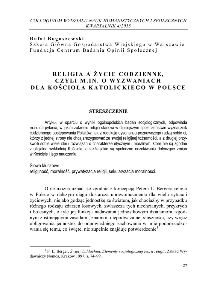 COLLOQUIUM WYDZIAŁU NAUK HUMANISTYCZNYCH I SPOŁECZNYCH KWARTALNIK 4/2015 Rafał Boguszewski S zk o ła G łó w n a Go sp o d ar st wa W ie js k ieg o w War sz aw ie Fu n d ac ja C e nt r u m Bad a n ia O p in i i S p o łe cz n e j RELIGIA A ŻYCIE CODZIENNE, CZYLI M.IN. O WYZWANIACH DLA KOŚCIOŁA KATOLICKIEGO W POLSCE STRESZCZENIE Artykuł, w oparciu o wyniki ogólnopolskich badań socjologicznych, odpowiada m.in. na pytania, w jakim zakresie religia stanowi w dzisiejszym społeczeństwie wyznacznik codziennego postępowania Polaków, jak z redukcją dysonansu poznawczego radzą sobie ci, którzy z jednej strony nie chcą zrezygnować ze swojej religijnej tożsamości, a z drugiej przyswoili sobie wiele idei i rozwiązań o charakterze etycznym i moralnym, które nie są zgodne z oficjalną wykładnią Kościoła, a także jakie są społeczne oczekiwania dotyczące zmian w Kościele i jego nauczaniu. Słowa kluczowe: religijność, moralność, prywatyzacja religii, sekularyzacja moralności. O ile można uznać, że zgodnie z koncepcją Petera L. Bergera religia w Polsce w dalszym ciągu dostarcza uprawomocnienia dla wielu sytuacji życiowych, niejako godząc jednostkę ze światem, jak chociażby w przypadku różnego rodzaju zdarzeń losowych, zwłaszcza tych niechcianych, przykrych i bolesnych, o tyle jej funkcja nadawania jednostkowym działaniom, zgodnym z istniejącymi zasadami, znamion niepodważalnej słuszności, czy wręcz obligowania jednostek do odpowiedniego zachowania w imię podporządkowania się temu, co święte, nie zupełnie znajduje potwierdzenie 1. 1 P. L. Berger, Święty baldachim. Elementy socjologicznej teorii religii, Zakład Wydawniczy Nomos, Kraków 1997, s. 74–99. 27 Rafał Boguszewski Coraz wyraźniej uwidaczniają się symptomy „sekularyzacji moralności”, która wyraża się w tym, że Polacy w coraz mniejszym stopniu odczuwają potrzebę religijnego uzasadniania własnych zasad moralnych i w wielu kwestiach deklarują poglądy moralne niezgodne z wyznawaną przez siebie religią. Nierzadko dotyczy to osób określających się jako wierzące (a nawet głęboko wierzące) oraz regularnie praktykujące religijnie. Przypisywanie sobie wysokiej religijności, a – tym bardziej – ponadprzeciętnej moralności bardzo często wiąże się z jednoczesnym przyzwoleniem na stosowanie środków antykoncepcyjnych, seks przedmałżeński, rozwody itp. W swoim tekście, w oparciu o wyniki ogólnopolskich badań socjologicznych, staram się dokonać pewnej społecznej diagnozy sytuacji Kościoła i religii w Polsce oraz wyzwań z jakimi Kościół katolicki musi się zmierzyć w zmieniającym się społeczeństwie – dziesięć lat po śmierci duchowego lidera jakim dla wielu Polaków był Jan Paweł II. W tym kontekście staram się znaleźć odpowiedź m.in. na pytania, w jakim zakresie religia stanowi w dzisiejszym społeczeństwie wyznacznik codziennego postępowania, jak z redukcją dysonansu poznawczego radzą sobie ci, którzy z jednej strony nie chcą zrezygnować ze swojej religijnej tożsamości, a z drugiej przyswoili sobie wiele idei i rozwiązań o charakterze etycznym i moralnym, które nie są zgodne z oficjalną wykładnią Kościoła, a także jakie są społeczne oczekiwania dotyczące zmian w Kościele i jego nauczaniu. Sformułowanie religia a życie codzienne zakłada przeciwstawność tych dwóch wymiarów, co jest oczywiście trochę mylące, ponieważ w dalszym ciągu występuje istotna statystycznie korelacja pomiędzy, opartymi na autodeklaracjach, wskaźnikami religijności i moralności, choć współczynnik tej korelacji jest coraz niższy (2009: r Pearsona = 0,48; p<0,001; 2013: r Pearsona = 0,33; p<0,001)2. To, że religia traci znaczenie w codziennym życiu Polaków jest niemal powszechnie w społeczeństwie odczuwane, na co wskazują oceny zmian w różnych wymiarach, które nastąpiły w Polsce po 1989 roku. Spośród dwudziestu wybranych do badania dziedzin to religijność jest wskazywana jako ta, która w ostatnim dwudziestopięcioleciu straciła na znaczeniu najbardziej. W czerwcu 2014 roku dwie trzecie ankietowanych przez CBOS uznało, że od końca lat osiemdziesiątych religijność Polaków się zmniejszyła (67% wskazań), jedynie co dziesiąty odnotował w tym czasie jej wzrost (10%), a co dziewiąty uznał, że jej poziom się nie zmienił (11%). Inne dziedziny, które 2 R. Boguszewski, Religijność a zasady moralne, komunikat z badań CBOS nr 14/2014, s. 5. 28 COLLOQUIUM WNHiS RELIGIA A ŻYCIE CODZIENNE, CZYLI M.IN. O WYZWANIACH DLA KOŚCIOŁA … – poza religijnością – postrzegane są jako tracące na znaczeniu lub których poziom się zmniejsza, to przede wszystkim opieka zdrowotna (62% wskazań), życzliwość ludzi wobec siebie (61%), intensywność kontaktów towarzyskich (57%), siła więzi rodzinnych (54%) oraz uczciwość Polaków (47%)3. Oczywiście deklaracje w zakresie religijności nie zmieniają się aż tak dramatycznie jak mogłyby to wynikać ze społecznych odczuć, ale pewne trendy spadkowe niewątpliwie się zarysowują, przy czym uwidaczniają się one dopiero po roku 2005, wcześniej deklaracje dotyczące różnych wymiarów autoreligijności były dość stabilne. W latach 2005–2014 odsetek dorosłych Polaków określających się jako głęboko wierzący zmniejszył się z 12% do 8%, w tym samym czasie podwoiła się liczba niewierzących (z 4% do 8%). Podobnie jest jeżeli chodzi o deklaracje praktyk religijnych. Jak wynika z deklaracji, w ciągu dziewięciu lat o 8 punktów procentowych zmniejszył się odsetek praktykujących regularnie – przynajmniej raz w tygodniu (z 58% w 2005 roku do 50% w 2014 roku), przybyło natomiast praktykujących nieregularnie (z 33% do 37%) oraz niepraktykujących (z 9% do 13%). Z połączenia deklaracji wiary i praktyk religijnych wynika, że od 2005 roku odsetek osób wierzących i regularnie praktykujących zmniejszył się w Polsce z 58% 