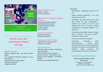 Teatralne podróże po naturze „Śmiecio – sztuka” „Co w trawie piszczy?” Oferujemy: doświadczenie - występujemy dla dzieci od 16 lat, bogatą tematykę przedstawień, w tym roku Bajka jest dobra na wszystko – spektakle edukacyjne „Witaminki księżniczki Ewelinki” „Niedźwiadek Łakomczuszek” „Przygody Małego Pingwinka” „O Lisku Urwisku” „Słoń Trąbaliński” ________________________ NASZĄ MISJĄ JEST WYCHOWANIE PRZEZ SZTUKĘ. ________________________________________________________ Spektakle sezonowe „Zapasy wiewiórki Basi, czyli pierwszy dzień jesieni” „Jak wyobraźnia Mariuszka sprawiła, że zima śnieżna była?” „Wróbelek Felek na tropie wiosny” „Śmingusek Dyngusek” „Śniegowy Bałwan” Coś nowego klasycznego „Siedmiomilowe buty” „Dorotka w Krainie Oz” Egzotyczne spotkania z bajką „Japońska baśń o dobrym sercu” „Opowieści z Bombaju” Zabawy okazjonalne „Mikołajki z bajki” ( zabawa z Mikołajem) „Disco walizeczka” „Dzień Dziecka w Fabryce Lizaków” „Szalona rodzinka” - Dzień Mamy i Taty „Podwieczorek u dziadków” - Dzień Babci i Dziadka Pasowanie na przedszkolaka/ucznia proponujemy 16 tytułów, interaktywne bajki dostosowane są do wieku dzieci wersje dla dzieci przedszkolnych i szkolnych (czas trwania ok. 45 min) oraz żłobkowych (ok. 30 min. -od 2010 r. graliśmy przedstawienia we wszystkich żłobkach m.st. Warszawy), różnorodną formę spektakli, połączenie żywego planu (2 aktorów) z grą lalką ( jawajki niespotykane, kukły, pacynki), kolorową i rozbudowaną scenografię, elastyczność programów zabaw okolicznościowych jesteśmy gotowi poprowadzić na Państwa życzenie każdą zabawę poczynając od pasowania na przedszkolaka, balu Halloween, zabawy choinkowej, balu karnawałowego, Dnia Rodziny, Dnia Dziecka) Zapraszamy do kontaktu: Fundacja Wspierania Kultury i Sztuki Teatr Narwal ul. Wesoła 17/1, 15-306 Białystok 537004381, 505129281 [email protected] Spektakle sezonowe „Śniegowy Bałwan” „Wróbelek Felek na tropie wiosny” „Zapasy wiewiórki Basi, czyli pierwszy dzień Gdy przyroda budzi się z zimowego snu, słoneczko śmielej wygląda zza chmur, topnieją ostatnie śniegi, jesieni” Wróbelek Felek wraz ze swoją przyjaciółką wroną „Zapasy wiewiórki Basi, czyli pierwszy dzień jesieni” to postanawiają wyruszyć na wiosenną wyprawę. Całkiem bajka o wesołej wiewiórce, która uwielbiała zabawy, przypadkiem spotykają sójkę, która przygotowuje się do płatała innym psikusy, ciągle żartowała i wszystkich do dalekiej wyprawy i prosi towarzyszy o pomoc. Czy zabawy namawiała. Nie przejmowała się nadchodzącą wróbelek jesienią i zamiast tak jak wszyscy gromadzić na zimę wiosennego świata i przekona do zmiany planów? zapasy, wciąż oddawała się zabawie. Tematy edukacyjne: To spektakl, który wprowadza w Tematy edukacyjne: odpowiedzialności i Spektakl, pokazuje, że który jest czas uczy na pomoże sójce, czy pokaże jej piękno wiosenny klimat. Bajka pełna ptasich bohaterów i ich Klasyczna bajka napisana przez znanego wszystkim dzieciom autora - Hansa Christiana Andersena. Opowiada o losach bałwanka, który stracił serce dla Panny Piecyk mieszkającej domu naprzeciwko. Rozmarzony Bałwanek chce ją poznać, czy mu się uda? Hmm… w bajkach wszystko jest możliwe. Tematy edukacyjne: o miłości i oddaniu. Teatralne podróże po naturze pogodnych piosenek. „Śmiecio – sztuka” przyjemności i czas na obowiązki, a to co robimy ma konsekwencje w przyszłości. Jednocześnie to spektakl o w „Śmingusek Dyngusek” pięknie jesieni. Bajka ekologiczna ukazująca losy misia Kubusia, który po wielu latach trafia na strych. Jako porzucona przytulanka Historia małego króliczka, który urodził się błękitny. Inne zaprzyjaźnia się z innymi porzuconymi i starymi zwierzęta z farmy wciąż pytały go, dlaczego tak dziwnie przedmiotami. Stary mop i miotła marzą by znów czuć się wygląda. I kury, i gęsi, a nawet Koń Zenon wyśmiewały użyteczni, więc postanawiają nocą wymknąć się przez W bajkach może zdarzyć się wszystko. Również zima bez się z niego. Tylko krowa Mela, która przeżyła niejedną komin. Czy miś wyruszy z nimi? A może postanowi zrobić ani jednego płatka śniegu. W bajce można też znaleźć wiosnę wiedziała, że króliczek błękitek jest wyjątkowy. coś, by zwrócić na siebie uwagę właściciela, za którym tak klucz do Krainy Wyobraźni. Co to za miejsce, jak do niego Wkrótce się okazało, że był Wielkanocnym Króliczkiem i bardzo tęskni? trafić? - dowiemy się poznając zimowe przygody razem z właścicielką wesołej farmy przygotowywali Tematy edukacyjne: ekologia, segregacja śmieci, dlaczego Mariuszka. tegoroczne święta. Bajka w wesoły sposób pokazuje życie warto dbać o rzeczy? W tym spektaklu pokażemy jak wielką siłę może mieć na wsi ale przede wszystkim opowiada o polskiej tradycji nasza wyobraźnia i pokażemy kilka prostych sposobów na obchodzenia świąt Wielkiej Nocy. uporanie się z lenistwem i nudą. Tematy edukacyjne: tradycja Świąt Wielkanocnych. „Jak wyobraźnia Mariuszka sprawiła, że zima śnieżna była?” „Co w trawie piszczy?” „Niedźwiadek Łakomczuszek” opowiadały mu zwierzęta i dotrzeć do krainy wiecznego lodu, która tak bardzo go ciekawi. Czy mu się to uda? Bajka ekologiczna przedstawiająca wesołe losy owadów na łące i leśnej polanie. Śmieszna pszczoła Malina wraz z Niedźwiadek mieszkańcem Odpowiedzi na te pytania można odnaleźć w bajce, która motylem Emanuelem, pokażą dzieciom najskrytsze kolorowego lasu. To lubiany, uczynny, choć troszkę nie tylko bawi, ale i pokazuje ile siły i wiary drzemie w zakątki łąki, w którym nie zabraknie pająka, mrówki, a niezdarny każdym z nas. nawet skocznego konika polnego, których największym przewodnicząca problemem jest to, że są deptan