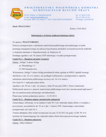SwIĘToKRZYSKA woJEw DDZKA KoM El\DA HUFCOW PRACY OCHOTNICZYCH 25-507Kielce,ul.Sienkiewicza 36 tel. 41 343-13-54 p.pl e-mail:swietokrzvska@oh fax 41 343-13-55 Nr konta:NBP O/O Kielce77 1UA 12380838722230000000 Nr Regon:001036796 Znak: POA/23/2012 Kielce, 19.03.2012 Informaci a o rwborze nai korzvstniei szei oferty Nr sprawy:PO N27 ll08l20t2 Dotyczy postępowaniao udzieleniezamówieniapublicznegoprowadzonegow Ębie przetargunieograniczonegona sukcesywnądostawęartykułówżywnościolvych do stołówki w budynkuinternatuw Starachowicach, ul. Hutnicza 10. DziaŁajączgodniez art.92 ustawyPZP informujęo wyniku postępowania: CześóNr 1 _ Dostawa owoców i warzrrw oferta: ,,Seliga''Łvkasz Seliga ul. Piłsudskiego 11 27-200Starachowice Wykonawca,,Seliga''Łukasz SeligaprzedstawiłofertęzgodnązeSIWZ, spełnił wymogi określone w art.22 wlw ustawy,nie podlegałwykluczeniuz postępowaniaw sprawie udzieleniazamówieniapublicznegona mocy art.24 w/w ustawy. jedna oferta. Na CzęśóNr 1 wpłynęła Zgodnie z art.94 ust. 2 pkt. 1a) ustawy z dtia 29 stycznia2004 r. Prawo Zalnóweil Publicznychumowaw sprawiezamówieniapublicznegomożebyć zawartaprzedupĘwem5 dni od zarrieszczenianiniejszegozawiadomienia. Planowanyterminpodpisaniaumowy- 21.03.2012. CzęśóNr 2 _ Dostawa miesa i przetworów miesnvch Zamawiającyinformuje,Żena zadanieCzęść Nr 2 nie wpłynęłaŻadnaoferta,w zwiryku z powyższym,na podstawięart.93 us.l pkt. 1 ustawyPZP, Zamaitający uniewaznia postępowaniena CzęśóNr 2. Termin składaniaofertzostałWznaczorLyluaczas15.03.20|2do godz.:|2:00.W ilw terminie do Zatnavnającego nie wpłynęŁażzadna oferta dotyczącapowyższego zadaria. CześćNr 3 _ Dostawa pieczvwa oferta:,,MłynMalinie'' Dziewit Sp. J. Malinie 375, 39-33l Chorzelów Uzasadnienie wyboru: Wykonawca ,,Młyn Malinie'' przedstawiłofertę zgodnąze SIWZ, spełniłwymogi określonew art. 22 wlw ustawy, nie podlegałwykluczeniu z postępowania w sprawie udzielenia zamówięnia publicznego na mocy art.f4 w/w ustawy otazzaproponował najkorzystniejsza cenę. Wykonawca uzyskał w postępowaniu 100 punktów. Jedynym kryterium oceny ofert była cena. Stosownie do regulacji ari.92 ust. 1 pkt. l ustawy PZP Zamawiający zawiadania,iiw niniej szym postępowaniu ofertę złoiył również: Nr oferty Nazrva firmy oraz adres 1 ZPAS,,Mister" 26-006Nowa Słupia,Jeziorko99 C Liczb.uryskanychpunktów 93,45 Zgodniezart.92 ust. 1pkt. 4wzwiązkuzart.94 ust. 1pkt.2 ustawyzdniaL9 sĘcznia2004 r. Prawo Zamówien Publicznych umowa w sprawie zamówienia publicznego może być zaulartapo upływie 5 dni od przesłanianiniejszego zawiadomienia. Planowany termin podpisaniaumowy - 26.03.f0I2. CześćNr 4 _ Dostawa mrożonek Zanawiający informuje , ze na zadanle CzęśóNr 4 nie wpłynęłaŻadnaoferta, w zwięku z povtyŻszym.na podstawie art. 93 us.1 pkt. 1 ustawy PZP, Zamawiający unieważnia postępowaniena CzęśóNr 4. Termin składaniaofert zostałwznaczony naczas |5.03.2012do godz.:If:0O.W w/w terminie do Zamaviającego nie wpłynęłaiadna oferta dotyczącapovlyższego zadania. CzęśćNr 5 _ Dostawa artvkułów spożYwczvch Oferta: P.W. ,,MAT" Marzena Tkaczuk uI.Zgodna 4B 27-200 Starachowice Wykonawca P.W. ,,MAT'' Marzena Tkaczuk przedstawiłofenę zgodnąze SIWZ, spełnił wymogi określonew art. 22 wlw ustawy' nie podlegałwykluczeniu z postępowania w sprawie udzielenia zamówięnia publicznego na mocy art.24 w/w ustawy. Na CzęśćNr 5 wpłynęłajedna oferta. Zgodnie z art. 94 ust. 2 pkt. 1a) ustawy z dnia f9 sĘcznla 2004 r, Prawo Zamówien Publicznych umowa w sprawie zamówienia publicznego moze być zawartaptzed upływem 5 dni od zatnieszczenia nini ejszego zawiadomieni a. Planowany termin podpisaniaumowy - 2I.03.f0I2. CześćNr 6 _ Dostawa produktów mleczarskich Oferta: F.H. ,,STARMLECZ" Tkaczuk Adam uI. Zgodna 4B 27-200 Starachowice Wykonawca F.H. ,,STARMLECZ" Tkaczuk Adam przedstawiłofertę zgodnązeSIWZ, spełniłwymogi określonew art. 22 wlw ustawy, nie podlegałwykluczeniu z postępowania w sprawie udzielenia zamówienia publicznego na mocy art.24 w/w ustawy. Na CzęśóNr 6 wpłynęłajedna oferta. Zgodniezart.94 ust.2 pkt. la) ustawy zdniaŻ9 sĘcznia2004r. Prawo Zanówień Publicznych umowa w sprawie zamówienia publicznego może byi zawartaprzed upĘwem 5 dni od zarieszczenia niniej szego zawiadomienia. Planowany termin podpisaniaumowy -21.03.fllf . CzęśćNr 7 - Jaia kurze Oferta: F.H. ,,STARMLECZ" Tkaczuk Adam ul.Zgodna4B 27-200 Starachowice Wykonawca F.H. ,,STARMLECZ" Tkaczuk Adam przedstawiłofertę zgodnąze SIWZ, spełniłwymogi określonew art. 22wlw ustawy, nie podlegałwykluczeniu z postępowania w sprawie udzielenia zamówienia publicznego na mocy afi.24 w/w ustawy. Na CzęśóNr 7 wpłynęłajedna ofeńa. Zgodniezart.94 ust.2 pkt. la) ustawy zdniaZ9 stycznia}}D4t. Prawo Zamówieft Publicznych umowa w sprawie zamówienia publicznego możebyć,zawartaprzed upĘwem 5 dni od zarie szczeni a nini ejszego zawiadomienia. Planowany termin podpisania umowy - 2I .03.2012. Zanawiający informuj e iż: - w postępowaniu nie odrzucono Żadnejoferty - z postępowania nie wykluczono Żadnejoferty. SporządziŁ: X^f,b- otrąrmuią: 1. ,,MłY[Malinie'' Dziewit Sp. J 39-33t Chorzelów, Malinie 375 2. ZakładProdukcji AĘkułów SpoĄnvczych o,Mister'' Karol Binkowski, Ryszard Binkowski SpółkaJawnaZPC 26-006Nowa Słupia,Jeziorko99 C 3. P.W. ,,MAT" MarzeraTkaczuk ul. Zgodna4 B 27-200Starachowice 4. Firma Handlowa,,Starmlecz"Tkaczuk Adam uI.Zgodna4B 27-200 Starachowice 5. ,,Seliga''Łukasz Seliga ul. Piłsudskiego 1l 27-200Starachowice Informacja zostałazanieszczona na stronie internetowej Zamawtającego i na tablicy ogłoszeń,w siedzibie Zamawiającego, Po otrzymaniu ilw informacji proszę o zwrobre potwierdzenie ohzymania tej informacji na nasz faks: 4ll 343 13 55 lub mail: [email protected]