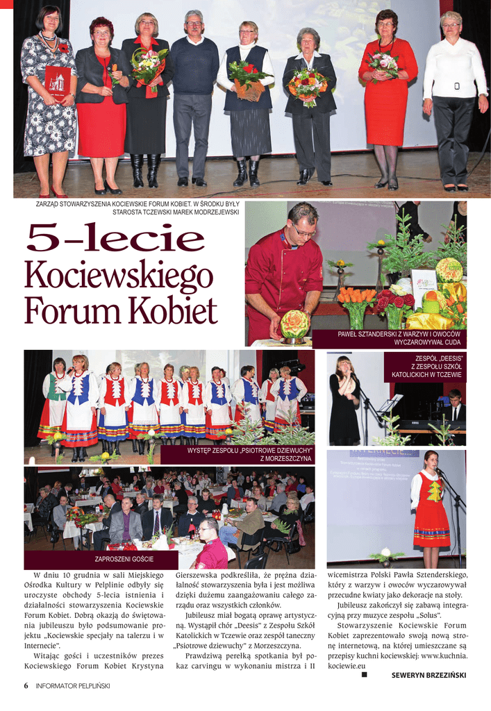 zarząd StowarzySzenia kociewSkie Forum kobiet. w środku były starosta tczewski Marek Modrzejewski 5-lecie Kociewskiego Forum Kobiet Paweł SztanderSki z warzyw i owoców wyczarowywał cuda zeSPół „deeSiS” z zeSPołu Szkół katolickich w tczewie wyStęP zeSPołu „PSiotrowe dziewuchy” z Morzeszczyna zaProSzeni goście W dniu 10 grudnia w sali Miejskiego Gierszewska podkreśliła, że prężna dziaOśrodka Kultury w Pelplinie odbyły się łalność stowarzyszenia była i jest możliwa uroczyste obchody 5-lecia istnienia i dzięki dużemu zaangażowaniu całego zadziałalności stowarzyszenia Kociewskie rządu oraz wszystkich członków. Forum Kobiet. Dobrą okazją do świętowaJubileusz miał bogatą oprawę artystycznia jubileuszu było podsumowanie pro- ną. Wystąpił chór „Deesis” z Zespołu Szkół jektu „Kociewskie specjały na talerzu i w Katolickich w Tczewie oraz zespół taneczny Internecie”. „Psiotrowe dziewuchy” z Morzeszczyna. Witając gości i uczestników prezes Prawdziwą perełką spotkania był poKociewskiego Forum Kobiet Krystyna kaz carvingu w wykonaniu mistrza i II 6 INFORMATOR PELPLIŃSKI wicemistrza Polski Pawła Sztenderskiego, który z warzyw i owoców wyczarowywał przecudne kwiaty jako dekoracje na stoły. Jubileusz zakończył się zabawą integracyjną przy muzyce zespołu „Solus”. Stowarzyszenie Kociewskie Forum Kobiet zaprezentowało swoją nową stronę internetową, na której umieszczane są przepisy kuchni kociewskiej: www.kuchnia. kociewie.eu Seweryn BrzezińSki