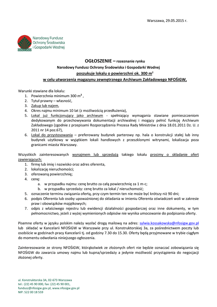 Warszawa, 29.05.2015 r. OGŁOSZENIE – rozeznanie rynku Narodowy Fundusz Ochrony Środowiska i Gospodarki Wodnej poszukuje lokalu o powierzchni ok. 300 m2 w celu utworzenia magazynu zewnętrznego Archiwum Zakładowego NFOŚiGW, Warunki stawiane dla lokalu: 1. Powierzchnia minimum 300 m2 , 2. Tytuł prawny – własność, 3. Zakup lub najem, 4. Okres najmu minimum 10 lat (z możliwością przedłużenia), 5. Lokal już funkcjonujący jako archiwum - spełniający wymagania stawiane pomieszczeniom dedykowanym do przechowywania dokumentacji archiwalnej i mogący pełnić funkcję Archiwum Zakładowego (zgodnie z przepisami Rozporządzenia Prezesa Rady Ministrów z dnia 18.01.2011 Dz. U. z 2011 nr 14 poz.67), 6. Lokal do przystosowania – preferowany budynek parterowy np. hala o konstrukcji stałej lub inny budynek użytkowy w wyjątkiem lokali handlowych z przeszklonymi witrynami, lokalizacja poza granicami miasta Warszawy. Wszystkich zainteresowanych wynajmem lub sprzedażą takiego lokalu prosimy o składanie ofert zawierających: 1. firmę lub imię i nazwisko oraz adres oferenta, 2. lokalizację nieruchomości; 3. oferowaną powierzchnię; 4. cenę: a. w przypadku najmu: cenę brutto za całą powierzchnię za 1 m-c; b. w przypadku sprzedaży: cenę brutto za lokal / nieruchomość; 5. oznaczenie terminu związania ofertą, przy czym termin ten nie może być krótszy niż 90 dni; 6. podpis Oferenta lub osoby upoważnionej do składania w imieniu Oferenta oświadczeń woli w zakresie praw i obowiązków majątkowych; 7. odpis z właściwego rejestru lub ewidencji działalności gospodarczej oraz inne dokumenty, w tym pełnomocnictwo, jeżeli z wyżej wymienionych odpisów nie wynika umocowanie do podpisania oferty. Pisemne oferty w języku polskim należy wysłać drogą mailową na adres: [email protected] lub składać w Kancelarii NFOŚiGW w Warszawie przy ul. Konstruktorskiej 3a, za pośrednictwem poczty lub osobiście w godzinach pracy Kancelarii tj. od godziny 7.30 do 15.30. Oferty będą przyjmowane w trybie ciągłym do momentu odwołania niniejszego ogłoszenia. Zainteresowanie ze strony NFOŚiGW, którąkolwiek ze złożonych ofert nie będzie oznaczać zobowiązania się NFOŚiGW do zawarcia umowy najmu lub kupna/sprzedaży a jedynie możliwość przystąpienia do negocjacji złożonej oferty. ul. Konstruktorska 3A, 02-673 Warszawa tel.: (22) 45 90 000, fax: (22) 45 90 001, [email protected], www.nfosigw.gov.pl NIP: 522 00 18 559