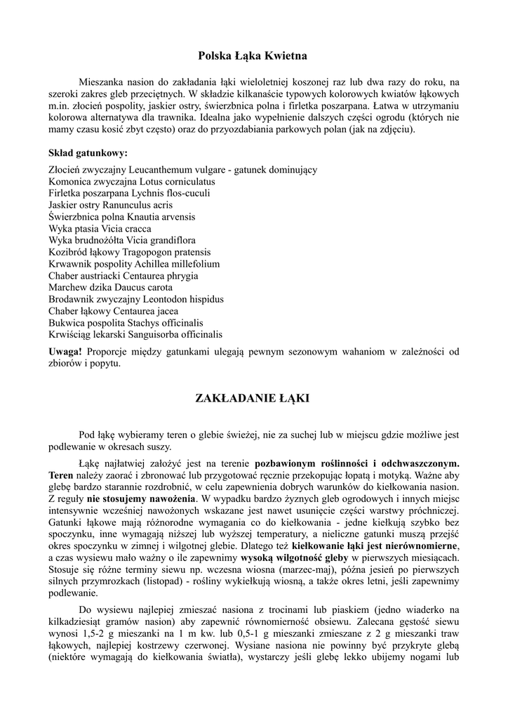 Polska Łąka Kwietna Mieszanka nasion do zakładania łąki wieloletniej koszonej raz lub dwa razy do roku, na szeroki zakres gleb przeciętnych. W składzie kilkanaście typowych kolorowych kwiatów łąkowych m.in. złocień pospolity, jaskier ostry, świerzbnica polna i firletka poszarpana. Łatwa w utrzymaniu kolorowa alternatywa dla trawnika. Idealna jako wypełnienie dalszych części ogrodu (których nie mamy czasu kosić zbyt często) oraz do przyozdabiania parkowych polan (jak na zdjęciu). Skład gatunkowy: Złocień zwyczajny Leucanthemum vulgare - gatunek dominujący Komonica zwyczajna Lotus corniculatus Firletka poszarpana Lychnis flos-cuculi Jaskier ostry Ranunculus acris Świerzbnica polna Knautia arvensis Wyka ptasia Vicia cracca Wyka brudnożółta Vicia grandiflora Kozibród łąkowy Tragopogon pratensis Krwawnik pospolity Achillea millefolium Chaber austriacki Centaurea phrygia Marchew dzika Daucus carota Brodawnik zwyczajny Leontodon hispidus Chaber łąkowy Centaurea jacea Bukwica pospolita Stachys officinalis Krwiściąg lekarski Sanguisorba officinalis Uwaga! Proporcje między gatunkami ulegają pewnym sezonowym wahaniom w zależności od zbiorów i popytu. ZAKŁADANIE ŁĄKI Pod łąkę wybieramy teren o glebie świeżej, nie za suchej lub w miejscu gdzie możliwe jest podlewanie w okresach suszy. Łąkę najłatwiej założyć jest na terenie pozbawionym roślinności i odchwaszczonym. Teren należy zaorać i zbronować lub przygotować ręcznie przekopując łopatą i motyką. Ważne aby glebę bardzo starannie rozdrobnić, w celu zapewnienia dobrych warunków do kiełkowania nasion. Z reguły nie stosujemy nawożenia. W wypadku bardzo żyznych gleb ogrodowych i innych miejsc intensywnie wcześniej nawożonych wskazane jest nawet usunięcie części warstwy próchniczej. Gatunki łąkowe mają różnorodne wymagania co do kiełkowania - jedne kiełkują szybko bez spoczynku, inne wymagają niższej lub wyższej temperatury, a nieliczne gatunki muszą przejść okres spoczynku w zimnej i wilgotnej glebie. Dlatego też kiełkowanie łąki jest nierównomierne, a czas wysiewu mało ważny o ile zapewnimy wysoką wilgotność gleby w pierwszych miesiącach. Stosuje się różne terminy siewu np. wczesna wiosna (marzec-maj), późna jesień po pierwszych silnych przymrozkach (listopad) - rośliny wykiełkują wiosną, a także okres letni, jeśli zapewnimy podlewanie. Do wysiewu najlepiej zmieszać nasiona z trocinami lub piaskiem (jedno wiaderko na kilkadziesiąt gramów nasion) aby zapewnić równomierność obsiewu. Zalecana gęstość siewu wynosi 1,5-2 g mieszanki na 1 m kw. lub 0,5-1 g mieszanki zmieszane z 2 g mieszanki traw łąkowych, najlepiej kostrzewy czerwonej. Wysiane nasiona nie powinny być przykryte glebą (niektóre wymagają do kiełkowania światła), wystarczy jeśli glebę lekko ubijemy nogami lub mechanicznie, aby nasiona miały kontakt z wilgotną glebą. Jakie są zagrożenia dla nowo założonej łąki? Po pierwsze to możliwość obumarcia młodziutkich siewek wskutek suszy lub nagłych mrozów. Po drugie pojawienie się chwastów, które zagłuszą rośliny łąkowe, dlatego tak istotne jest zupełne odchwaszczenie gleby - pielić możemy tylko kiedy jesteśmy pewni, że usuwamy chwasty, a nie wysiane rośliny. Wiele chwastów rośnie szybko, ale są wrażliwe na koszenie, dlatego możemy je wyniszczyć kosząc teren kosiarką ustawioną w najwyższym położeniu (wysokość koszenia 10-15 cm). Właściwe rośliny łąkowe będą jeszcze niższe albo łatwo zregenerują przycięte pędy. UŻYTKOWANIE ŁĄKI Aby zapobiec inwazji roślinności leśnej i zaroślowej łąka musi być koszona. Poszczególne gatunki łąkowe różnie reagują na koszenie. Tradycyjnie użytkowane łąki kośne zwykle koszone są dwa razy do roku, czasem trzy razy lub raz w roku lub tylko raz na dwa lata. Dla zapewnienia obfitego kwitnienia jak największej ilości gatunków najlepsze efekty daje koszenie raz w roku na początku lata (czerwiec - lipiec). Częstsze koszenie ułatwia chodzenie po łące ale ogranicza ilość gatunków kwitnących latem. Z reguły większe gatunki łąkowe (chaber łąkowy i austriacki, świerzbnica polna, kozibród, przytulia właściwa i biała itp.) rozwijają się lepiej przy rzadkim koszeniu (raz w roku lub raz na kilka lat), a niższe gatunki lepiej rosną na łąkach kilka razy w roku. Nigdy nie kosimy łąki wcześniej niż w czerwcu, ponieważ istnieje duża grupa bardzo ozdobnych gatunków kwitnących w maju i czerwcu, które wyginęłyby stopniowo jeśli zostaną skoszone za wcześnie. Jeśli zależy nam jedynie na tych wcześnie kwitnących gatunkach (firletka, złocień, brodawnik, mniszek, jaskry) to od czerwca, po ustaniu ich kwitnienia, łąkę kosić można nawet co trzy tygodnie. Ograniczy to jedynie prawie zupełnie kwitnienie późno-letnich gatunków. Zainteresowani eksperymentowaniem mogą spróbować zróżnicować częstość koszenia w różnych częściach łąki, np. kosząc część łąki raz na dwa lata, a część kilka razy w roku. Bardzo ważne jest aby zostawić skoszoną trawę na łące, żeby mogły wyschnąć i wysypać się nasiona zawiązane przez rośliny. Po kilku dniach siano usuwamy lub palimy na miejscu. Większość gatunków łąkowych jest wieloletnia. Niektóre z gatunków kwitną już w pierwszym roku, inne po 2-3 latach. NAJCZĘŚCIEJ ZADAWANE PYTANIA Czy mogę wsiać mieszankę nasion w istniejący trawnik? Niestety jest to mało efektowna metoda, choć daje pewne rezultaty, ponieważ niektóre gatunki dobrze kiełkują nawet w trawie. Najlepiej jednak łąkę założyć od nowa albo wycinać w darni kółka o średnicy 1-2 m i wsiewać mieszankę w takie kółka. W ten sposób możemy też wzbogacić istniejącą łąkę o nowe gatunki. Czy łąkę kosimy kosiarką jak trawnik? Łąkę kosimy rzadziej niż trawnik, nie ważne czy kosiarką, czy kosą. Jak nawozić łąkę? W więk