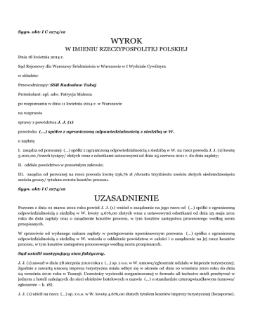 Sygn. akt: I C 1274/12 WYROK W IMIENIU RZECZYPOSPOLITEJ POLSKIEJ Dnia 18 kwietnia 2014 r. Sąd Rejonowy dla Warszawy Śródmieścia w Warszawie w I Wydziale Cywilnym w składzie: Przewodniczący: SSR Radosław Tukaj Protokolant: apl. adw. Patrycja Malesza po rozpoznaniu w dnia 11 kwietnia 2014 r. w Warszawie na rozprawie sprawy z powództwa J. J. (1) przeciwko (...) spółce z ograniczoną odpowiedzialnością z siedzibą w W. o zapłatę I. zasądza od pozwanej (...) spółki z ograniczoną odpowiedzialnością z siedzibą w W. na rzecz powoda J. J. (1) kwotę 3.000,00 /trzech tysięcy/ złotych wraz z odsetkami ustawowymi od dnia 25 czerwca 2011 r. do dnia zapłaty; II. oddala powództwo w pozostałym zakresie; III. zasądza od pozwanej na rzecz powoda kwotę 236,76 zł /dwustu trzydziestu sześciu złotych siedemdziesięciu sześciu groszy/ tytułem zwrotu kosztów procesu. Sygn. akt: I C 1274/12 UZASADNIENIE Pozwem z dnia 01 marca 2012 roku powód J. J. (1) wniósł o zasądzenie na jego rzecz od (...) spółki z ograniczoną odpowiedzialnością z siedzibą w W. kwoty 4.676,00 złotych wraz z ustawowymi odsetkami od dnia 25 maja 2011 roku do dnia zapłaty oraz o zasądzenie kosztów procesu, w tym kosztów zastępstwa procesowego według norm przepisanych. W sprzeciwie od wydanego nakazu zapłaty w postępowaniu upominawczym pozwana (...) spółka z ograniczoną odpowiedzialnością z siedzibą w W. wniosła o oddalenie powództwa w całości i o zasądzenie na jej rzecz kosztów procesu, w tym kosztów zastępstwa procesowego według norm przepisanych. Sąd ustalił następujący stan faktyczny. J. J. (1) zawarł w dniu 28 sierpnia 2010 roku z (...) sp. z o.o. w W. umowę/zgłoszenie udziału w imprezie turystycznej. Zgodnie z zawartą umową impreza turystyczna miała odbyć się w okresie od dnia 10 września 2010 roku do dnia 24 września 2010 roku w Tunezji. Uczestnicy wycieczki zorganizowanej w formule all inclusive mieli przebywać w jednym z hoteli należących do sieci obiektów hotelowych o nazwie (...) o standardzie czterogwiazdkowym (umowa/ zgłoszenie – k. 18). J. J. (1) uiścił na rzecz (...) sp. z o.o. w W. kwotę 4.676,00 złotych tytułem kosztów imprezy turystycznej (bezsporne). Po przybyciu na miejsce okazało się, że zakwaterowanie w żadnym z hoteli sieci (...) nie jest możliwe z powodu dokonania we wskazanych obiektach rezerwacji w ilości przewyższającej liczbę gości, W związku z tym uczestnicy imprezy zorganizowanej przez (...) sp. z o. o. w W., w tym J. i D. J., zostali zakwaterowani w hotelu spoza sieci (...) o nazwie (...). Wskazany obiekt hotelowy posiadał standard znacznie odbiegający od standardu i jakości hoteli wymienionych w umowie o świadczenie usług turystycznych zawartej między stronami. W restauracji, w której serwowane były posiłki, często brakowało naczyń, automaty służące do przygotowywania napojów gorących nieustannie psuły się, a jeśli nawet funkcjonowały poprawnie, i tak nie było możliwe korzystanie z nich, ponieważ nie były one uzupełniane kawą oraz mlekiem. Jedzenie serwowane w restauracji było monotonne, podawane potrawy były niejednokrotnie zimne, zaś część potraw była przygotowywana z pozostałości żywności nieskonsumowanej w trakcie poprzednich posiłków. Obiekty sportowe znajdujące się na terenie hotelu były zaniedbane i nie spełniały swoich funkcji, zaś sprzęt sportowy, jak np. piłki do gry w siatkówkę, dostępny był w ilości uniemożliwiającej korzystanie z niego przez większą liczbę gości hotelowych. Plaża hotelowa, udostępniona dla gości, była zanieczyszczona, wejście do wody utrudniały ogromne ilości glonów, które nie były usuwane z powierzchni plaży, wskutek czego w obrębie miejsca przeznaczonego do wypoczynku unosił się nieprzyjemny zapach (zeznania świadka A. M. (1) – k. 181-182, zeznania świadka A. M. (2) – k. 182-183, zeznania świadka D. J. – k. 215 verte, zeznania powoda J. J. (1) – k. 275-277). J. J. (1) poinformował rezydenta biura (...) sp. z o.o. w W. o swoich zastrzeżeniach odnośnie do jakości i standardu hotelu, w którym turyści zostali zakwaterowani, wobec braku miejsc w hotelach przewidzianych umową. Do końca wyjazdu rezydent nie ustosunkował się jednak do zgłoszenia J. J. (1) oraz wielu innych klientów biorących udział w przedmiotowej imprezie turystycznej (pismo – k. 28). Po powrocie do kraju J. J. (1) przesłał (...) spółce ograniczoną odpowiedzialnością z siedzibą w W. pisemną reklamację, w której wniósł o zwrot kwoty stanowiącej równowartość kosztów wyjazdu, tj. kwoty 4.676,00 złotych (reklamacja – k. 97-102). W odpowiedzi (...) sp. z o.o. w W., w piśmie z dnia 08 listopada 2010 roku, uznała roszczenie J. J. (1) za bezzasadne i odmówiła zwrotu żądanej kwoty, wskazując że wobec faktu przyjęcia przez klientów świadczenia zastępczego, brak jakichkolwiek podstaw do zwrotu wskazanej kwoty (pismo – k. 103-104). Pismami z dnia 24 maja 2011 roku oraz z dnia 19 lipca 2011 roku J. J. (1) wezwał (...) sp. z o. o. w W. do zapłaty kwoty 4.676,00 złotych (pisma – k. 29-32). Powyższy stan faktyczny w sprawie został ustalony na podstawie załączonych do akt niniejszej sprawy, a wskazanych wyżej dokumentów, a także na podstawie zeznań powoda J. J. (1) (k. 275-277) oraz zeznań świadków: D. J. (k. 215 verte), A. M. (2) (k. 182-183) oraz A. M. (1) (k. 181-182). Autentyczność wskazanych dokumentów, w świetle rozważenia zebranego materiału dowodowego, nie budziła wątpliwości i nie była kwestionowana przez żadną ze stron postępowania. Sąd dał wiarę zeznaniom powoda J. J. (1) oraz wyżej wskazanych świadków. Zeznania te były logiczne, spójne i wzajemnie się uzupełniały. Sąd uznał nadto za niewiarygodne zeznania świadka G. J. (k. 141-142), albowiem pozostawały one w sprzeczności z pozostałym materiałem dowodowym. Sąd zważył, co następuje. Żądani