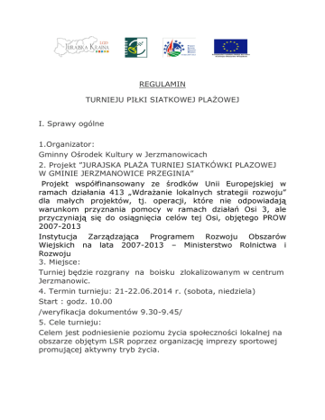REGULAMIN TURNIEJU PIŁKI SIATKOWEJ PLAŻOWEJ I. Sprawy ogólne 1.Organizator: Gminny Ośrodek Kultury w Jerzmanowicach 2. Projekt ”JURAJSKA PLAŻA TURNIEJ SIATKÓWKI PLAZOWEJ W GMINIE JERZMANOWICE PRZEGINIA” Projekt współfinansowany ze środków Unii Europejskiej w ramach działania 413 „Wdrażanie lokalnych strategii rozwoju” dla małych projektów, tj. operacji, które nie odpowiadają warunkom przyznania pomocy w ramach działań Osi 3, ale przyczyniają się do osiągnięcia celów tej Osi, objętego PROW 2007-2013 Instytucja Zarządzająca Programem Rozwoju Obszarów Wiejskich na lata 2007-2013 – Ministerstwo Rolnictwa i Rozwoju 3. Miejsce: Turniej będzie rozgrany na boisku zlokalizowanym w centrum Jerzmanowic. 4. Termin turnieju: 21-22.06.2014 r. (sobota, niedziela) Start : godz. 10.00 /weryfikacja dokumentów 9.30-9.45/ 5. Cele turnieju: Celem jest podniesienie poziomu życia społeczności lokalnej na obszarze objętym LSR poprzez organizację imprezy sportowej promującej aktywny tryb życia. II. Zasady uczestnictwa: 1. Zawodnicy/zawodniczki startują na własną odpowiedzialność i nie mają przeciwwskazań lekarskich. 2. Drużyna składa się z dwóch osób: kobiet lub mężczyzn zamieszkałych na terenie gminy Jerzmanowice –Przeginia 3. Kategorie wiekowe: - kobiety: od lat 15 OPEN - mężczyźni: od lat 15 OPEN - młodzież szkolna dziewczęta - młodzież szkolna chłopcy 4. Zgłoszenia drużyn przyjmowane będą do 17.06.2014 drogą e-mailową na adres [email protected] lub pisemnie na adres: GOK Jerzmanowice 366b 32-048 Jerzmanowice. Zgłoszenia po terminie nie będą rozpatrywane. W zgłoszeniu należy podać: - imię i nazwisko zawodników - nazwę drużyny - kategorię wiekową - e-mail kapitana drużyny ZGŁOSZENIE DRUŻYNY JEST RÓWNOZNACZNE Z ZAPOZNANIEM I AKCEPTACJĄ REGULAMINU ZAWODÓW. 6. Ilość drużyn jest ograniczona -pierwsze 32 zespoły(MĘZCZYŹNI+KOBIETY+MŁODZIEŻ SZKOLNA DZIEWCZĘTA I CHŁOPCY-decyduje kolejność zgłoszeń) 7. Zawodnik musi legitymować się dokumentem potwierdzającym jego dane. Osoby niepełnoletnie muszą przedstawić pisemną zgodę rodziców/prawnego opiekuna na udział w turnieju ZAŁĄCZNIK NUMER 1,ZAŁĄCZNIK NUMER 2. III. Przepisy 1. Ilość rozgrywanych setów będzie uzależniona od liczby uczestniczących drużyn. 2. System rozgrywek uzależniony będzie od ilości zgłoszonych drużyn, o systemie i ilości setów drużyny zostaną poinformowane w dniu zawodów. 3. W rozgrywkach obowiązują przepisy gry w piłki plażowej. Zgodnie z FIVB. IV. Sprawy Finansowe 1. Koszty organizacji i prowadzenia turnieju ponosi organizator. V. Nagrody Dla zwycięzców turnieju przewidziano nagrody osobno w kategorii męskiej i żeńskiej, dziewcząt i chłopców : 1 2 3 4 miejsce-nagroda rzeczowa miejsce- nagroda rzeczowa miejsce- nagroda rzeczowa miejsce- nagroda rzeczowa VI. Postanowienia końcowe 1. Każdy zawodnik jest zobowiązany do zapoznania się z regulaminem. 2. Każdy zawodnik musi posiadać strój sportowy. 3. Turniej będzie rozgrany piłką firmy „MIKASA”, które zapewnia organizator. 4. Do rozgrzewki drużyny muszą posiadać własne piłki. 5. Zawodnicy przygotowują się do spotkań i rozgrzewki na boisko Zespołu Szkół w Jerzamnowicach. 6. Przed meczem drużyna ma prawo do 2 minutowej rozgrzewki na boisku. 7. Zawodnicy uczestniczący w turnieju ubezpieczają się we własnym zakresie(opcjonalnie), biorą udział na własną odpowiedzialność, organizator nie ponosi odpowiedzialności za ewentualne wypadki. 8. Organizator zapewnia podstawową opiekę medyczną (apteczka pierwszej pomocy, osoba przeszkolona medycznie), o poziomie medycznego zabezpieczenia zawodów decyduje organizator. 9. Zawodnicy uczestniczący w turnieju winni posiadać aktualne badania lekarskie, stwierdzające zdolność do gry w plażowej piłce siatkowej lub w dniu zawodów złożą oświadczenieZAŁĄCZNIK NRUMER 3 i 4. 10. Organizator nie ponosi odpowiedzialności za mienie zawodników. 11. Organizator zastrzega sobie prawo do dokonywania zmian oraz ostatecznej interpretacji regulaminu i zasad gry. 12. W sprawach spornych lub nie ujętych w regulaminie decydują organizatorzy (sędzia główny zawodów). ZAŁĄCZNIK NUMER 1 JURAJSKA PLAŻA IMIĘ I NAZWISKO DZIECKA: …..………………………………………………… PESEL: ….………………………………………… NR LEGITYMACJI SZKOLNEJ: ……………………… ZGODA RODZICA / OPIEKUNA PRAWNEGO Wyrażam zgodę na udział mojego dziecka w rozgrywkach Jurajska Plaża 2014. Wyrażam zgodę, bez zobowiązań i kompensaty dla mnie ani dla dziecka/zawodnika, do publikacji, pokazywania i wykorzystywania w zależności od wyboru zdjęć, wizerunku, portretu, nazwiska, głosu i danych biograficznych dziecka/zawodnika z Turnieju w dowolnym formacie i we wszystkich mediach istniejących obecnie i w przyszłości na całym świecie. Materiały te będą wykorzystywane wyłącznie za zgodą Organizatora . Zapoznałem/am się z Regulaminem Turnieju i akceptuje zawarte w nim postanowienia. ………………………………………….… Podpis Rodzica /Opiekuna prawnego (czytelnie) ZAŁĄCZNIK NUMER 2 OŚWIADCZENIE WYRAŻAM ZGODĘ NA UDZIAŁ DZIECKA…………………………………………….. MOJEGO W TURNIEJU JURAJSKA PLAŻA W DNIACH 21-22.06.2014 W JERZMANOWICACH. OŚWIADCZAM ŻE DZIECKO NIE MA PRZECIWWSKAZAŃ ZDROWOTNYCH DO UDZIAŁU W TURNIEJU. ………………………………………….… Podpis Rodzica /Opiekuna prawnego (czytelnie) ZAŁĄCZNIK NUMER 3 JURAJSKA PLAŻA IMIĘ I NAZWISKO: …..………………………………………………… PESEL: ….………………………………………… ZGODA Wyrażam zgodę, bez zobowiązań i kompensaty dla mnie, do publikacji, pokazywania i wykorzystywania w zależności od wyboru zdjęć, wizerunku, portretu, nazwiska, głosu i danych biograficznych zawodnika z Turnieju w dowolnym 