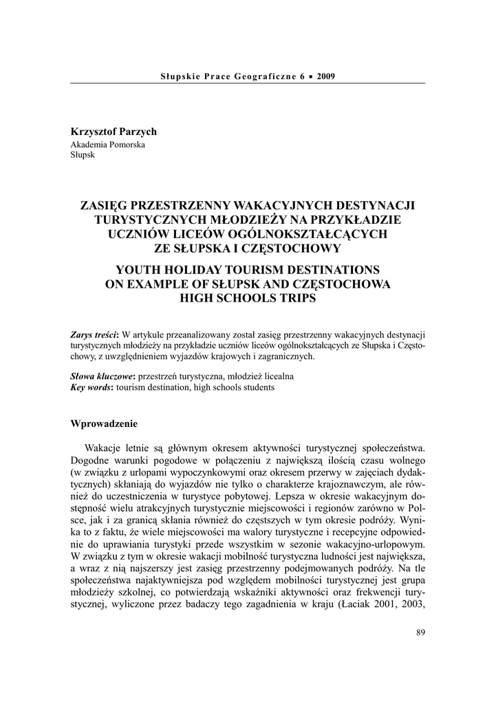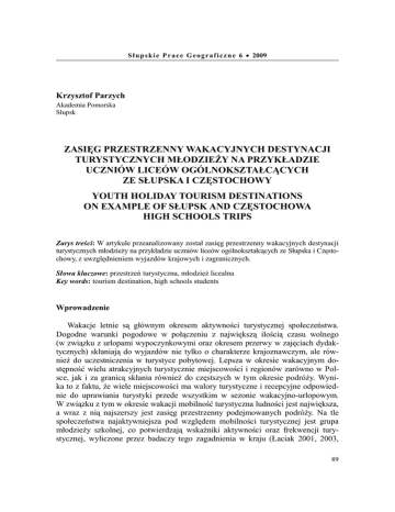 S ł u p s k i e P r a c e G e o g r a f i c z n e 6 • 2009 Krzysztof Parzych Akademia Pomorska Słupsk ZASIĘG PRZESTRZENNY WAKACYJNYCH DESTYNACJI TURYSTYCZNYCH MŁODZIEśY NA PRZYKŁADZIE UCZNIÓW LICEÓW OGÓLNOKSZTAŁCĄCYCH ZE SŁUPSKA I CZĘSTOCHOWY YOUTH HOLIDAY TOURISM DESTINATIONS ON EXAMPLE OF SŁUPSK AND CZĘSTOCHOWA HIGH SCHOOLS TRIPS Zarys treści: W artykule przeanalizowany został zasięg przestrzenny wakacyjnych destynacji turystycznych młodzieŜy na przykładzie uczniów liceów ogólnokształcących ze Słupska i Częstochowy, z uwzględnieniem wyjazdów krajowych i zagranicznych. Słowa kluczowe: przestrzeń turystyczna, młodzieŜ licealna Key words: tourism destination, high schools students Wprowadzenie Wakacje letnie są głównym okresem aktywności turystycznej społeczeństwa. Dogodne warunki pogodowe w połączeniu z największą ilością czasu wolnego (w związku z urlopami wypoczynkowymi oraz okresem przerwy w zajęciach dydaktycznych) skłaniają do wyjazdów nie tylko o charakterze krajoznawczym, ale równieŜ do uczestniczenia w turystyce pobytowej. Lepsza w okresie wakacyjnym dostępność wielu atrakcyjnych turystycznie miejscowości i regionów zarówno w Polsce, jak i za granicą skłania równieŜ do częstszych w tym okresie podróŜy. Wynika to z faktu, Ŝe wiele miejscowości ma walory turystyczne i recepcyjne odpowiednie do uprawiania turystyki przede wszystkim w sezonie wakacyjno-urlopowym. W związku z tym w okresie wakacji mobilność turystyczna ludności jest największa, a wraz z nią najszerszy jest zasięg przestrzenny podejmowanych podróŜy. Na tle społeczeństwa najaktywniejsza pod względem mobilności turystycznej jest grupa młodzieŜy szkolnej, co potwierdzają wskaźniki aktywności oraz frekwencji turystycznej, wyliczone przez badaczy tego zagadnienia w kraju (Łaciak 2001, 2003, 89 Ryc. 1. Rozkład przestrzenny krajowych wyjazdów turystycznych młodzieŜy licealnej Słupska (A) i Częstochowy (B) w okresie wakacji letnich 2001 roku Fig. 1. The spatial arrangement of the national touristic departures of the Słupsk (A) and Częstochowa (B) high school students during summer holidays 2001 Źródło: opracowanie własne na podstawie wyników badań ankietowych 90 91 2005, Lubowicz 1990, 1996, 1999, Wartecka 2001, Sołtysik 2002, Łopaciński 1989, 1990, Matczak 1994, 1996, Mentuch, Treder-Mentuch 2000 i inni) i za granicą (Abdel-Ghaffar 1992, Bywater 1993, Carr 2002, Garibaldi, Rebora 1995, Horak, Crnković, Mikacić 1989, Manriquez, Fawaz Fernandez 2003, Richards, Wilson 2003, 2004, Seekings 1998 oraz inni). W artykule przedstawiono analizę zasięgu przestrzennego wakacyjnych destynacji turystycznych młodzieŜy licealnej zamieszkującej dwa miasta: Słupsk i Częstochowę. Wybór tych miast był celowy i podyktowany próbą określenia wpływu determinanty środowiskowej (odmiennych cech geograficznych środowiska zamieszkania młodzieŜy) na przestrzeń turystyczną podejmowanych przez młodzieŜ podróŜy. Terminu destynacja uŜywa się w odniesieniu do docelowych miejsc migracji turystycznych. Jego uŜycie jest spowodowane brakiem jednoznacznego odpowiednika w polskiej literaturze z zakresu geografii turyzmu. Badania przeprowadzono metodą ankietową. Miały one charakter losowy, warstwowy i proporcjonalny. Operat losowania wyniósł ogółem 1962 osoby, w tym 1412 z Częstochowy i 550 ze Słupska. Miejscem badań były wszystkie państwowe licea ogólnokształcące funkcjonujące w roku szkolnym 2001/2002 w Słupsku i Częstochowie. Zasięg przestrzenny podróŜy wakacyjnych obu badanych populacji młodzieŜy określono na podstawie miejscowości docelowych wyjazdów turystycznych krajowych i zagranicznych w okresie wakacji letnich w 2001 roku. Analiza mapy zasięgu przestrzennego krajowych wyjazdów turystycznych młodzieŜy licealnej ze Słupska i Częstochowy wskazuje na wysoki stopień ich koncentracji w najatrakcyjniejszych pod względem turystyczno-krajoznawczym miejscowościach i regionach Polski, a takŜe w najbliŜszych okolicach miejsc zamieszkania. Mapy wakacyjnej przestrzeni turystycznej obu badanych populacji wskazują na znaczne zróŜnicowanie liczby miejscowości odwiedzonych w okresie wakacji letnich, jak równieŜ natęŜenia wyjazdów do poszczególnych miejscowości i regionów turystycznych w Polsce i za granicą. MłodzieŜ licealna ze Słupska odwiedziła w trakcie swoich wakacyjnych podróŜy w 2002 roku 252 miejscowości, z tego 176 (69,8%) na obszarze Polski oraz 76 (30,2%) za granicą. Spośród 589 wyjazdów 408 (69,3%) stanowiły wyjazdy krajowe, natomiast 181 (30,7%) wyjazdy zagraniczne. Najwięcej podróŜy odbyto do miejscowości w najbliŜszych okolicach Słupska i innych miejscowości podregionu słupskiego (ryc. 1A). Ich duŜy udział wśród wyjazdów wakacyjnych moŜe wynikać z bliskości bardzo atrakcyjnych pod względem wypoczynkowym miejscowości nadmorskich, które w sezonie wakacyjno-urlopowym są najczęściej odwiedzane w Polsce. Ogółem w podregionie słupskim odwiedzono 54 miejscowości, do których było skierowanych 28,3% wszystkich wyjazdów krajowych badanej populacji młodzieŜy. Najczęściej odwiedzane w tej grupie były kąpieliska nadmorskie: Ustka (22 wyjazdy), Łeba (8), Jarosławiec (10) oraz ośrodki nad jeziorami, zwłaszcza Koczała na Pojezierzu Bytowskim (8). Obserwacje autora badań dotyczące liczby wizyt w miejscowościach nadmorskich mieszkańców Słupska pozwalają przypuszczać, Ŝe liczba deklarowanych wyjazdów młodzieŜy słupskiej do miejscowości nadmorskich w okresie wakacyjnym wydaje się znacznie zaniŜona. Jest to prawdopodobnie wynikiem nieuwzględniania 92 jednodniowych wyjazdów bez noclegu do Ustki i innych miejscowości nadmorskich podregionu słupskiego wśród wyjazdów o charakterze turystycznym. Fakt powyŜszy znajduje swoje uzasadnienie naukowe, poniewaŜ w terminologii badań ruchu turystycznego jako wyjazdy turystyczne traktow