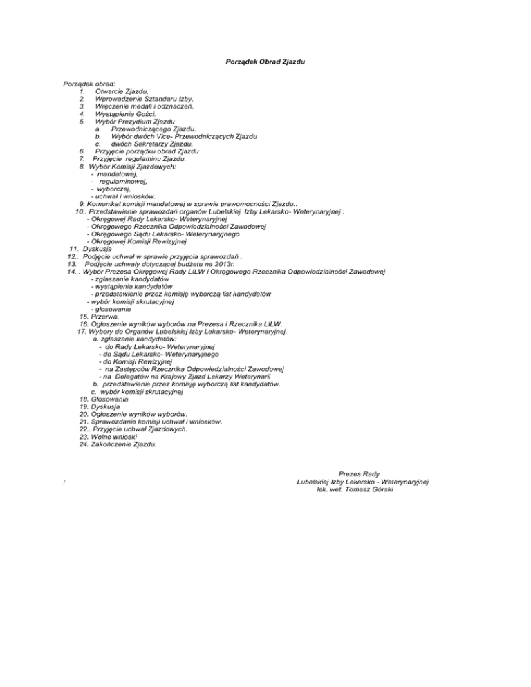 Porządek Obrad Zjazdu Porządek 1. 2. 3. 4. 5. obrad: Otwarcie Zjazdu, Wprowadzenie Sztandaru Izby, Wręczenie medali i odznaczeń. Wystąpienia Gości. Wybór Prezydium Zjazdu a. Przewodniczącego Zjazdu. b. Wybór dwóch Vice- Przewodniczących Zjazdu c. dwóch Sekretarzy Zjazdu. 6. Przyjęcie porządku obrad Zjazdu 7. Przyjęcie regulaminu Zjazdu. 8. Wybór Komisji Zjazdowych: - mandatowej, - regulaminowej, - wyborczej, - uchwał i wniosków. 9. Komunikat komisji mandatowej w sprawie prawomocności Zjazdu.. 10.. Przedstawienie sprawozdań organów Lubelskiej Izby Lekarsko- Weterynaryjnej : - Okręgowej Rady Lekarsko- Weterynaryjnej - Okręgowego Rzecznika Odpowiedzialności Zawodowej - Okręgowego Sądu Lekarsko- Weterynaryjnego - Okręgowej Komisji Rewizyjnej 11. Dyskusja 12.. Podjęcie uchwał w sprawie przyjęcia sprawozdań . 13. Podjęcie uchwały dotyczącej budżetu na 2013r. 14. . Wybór Prezesa Okręgowej Rady LILW i Okręgowego Rzecznika Odpowiedzialności Zawodowej - zgłaszanie kandydatów - wystąpienia kandydatów - przedstawienie przez komisję wyborczą list kandydatów - wybór komisji skrutacyjnej - głosowanie 15. Przerwa. 16. Ogłoszenie wyników wyborów na Prezesa i Rzecznika LILW. 17. Wybory do Organów Lubelskiej Izby Lekarsko- Weterynaryjnej. a. zgłaszanie kandydatów: - do Rady Lekarsko- Weterynaryjnej - do Sądu Lekarsko- Weterynaryjnego - do Komisji Rewizyjnej - na Zastępców Rzecznika Odpowiedzialności Zawodowej - na Delegatów na Krajowy Zjazd Lekarzy Weterynarii b. przedstawienie przez komisję wyborczą list kandydatów. c. wybór komisji skrutacyjnej 18. Głosowania 19. Dyskusja 20. Ogłoszenie wyników wyborów. 21. Sprawozdanie komisji uchwał i wniosków. 22.. Przyjęcie uchwał Zjazdowych. 23. Wolne wnioski 24. Zakończenie Zjazdu. : Prezes Rady Lubelskiej Izby Lekarsko - Weterynaryjnej lek. wet. Tomasz Górski
