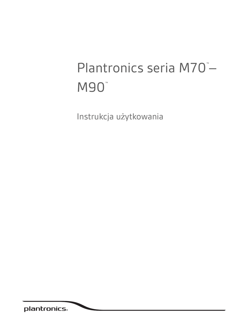 Plantronics seria M70 – M90 ™ ™ Instrukcja użytkowania Spis treści 3 Witamy! 4 Zawartość opakowania* 5 Wybór języka Parowanie 6 Opis słuchawki 7 Zapewnij sobie bezpieczeństwo 7 Przejmij kontrolę 8 Odebranie lub zakończenie rozmowy 8 Odrzucenie rozmowy 8 Wyreguluj głośność 8 Włącz/wyłącz mikrofon 8 Aktywuj wybieranie głosowe (funkcja telefonu) Ponowne nawiązywanie połączenia 8 Zmień język 8 Dopasowywanie Ładowanie 8 10 11 Oszczędzanie energii 12 Utrzymywanie połączenia 13 Więcej funkcji 14 Korzystanie z dwóch telefonów 14 Komunikaty głosowe 14 Słuchanie muzyki i nie tylko 14 Pomoc 15 2 Witamy! Gratulujemy zakupu nowego produktu firmy Plantronics. W niniejszej instrukcji użytkowania opisano konfigurację i użytkowanie słuchawek Plantronics seria M70™–M90™. Przed zainstalowaniem lub użyciem produktu należy zapoznać się z ważnymi informacjami na temat zachowania bezpieczeństwa znajdującymi się w broszurze pt. „Instrukcje bezpieczeństwa”. 3 Zawartość opakowania* Słuchawki Opcjonalny zaczep na ucho Kabel do ładowarki USB NOTA * Zawartość opakowania może różnić się w zależności od produktu. 4 Wybór języka Po założeniu słuchawki włącz ją. Po pierwszym włączeniu słuchawki zostanie nadany komunikat z prośbą o wybranie jednego języka spośród trzech dostępnych. Po wykonaniu tej czynności usłyszysz komunikat „pairing” (trwa parowanie). Przejdź do menu ustawień w telefonie, aby nawiązać połączenie ze słuchawką. 5 Parowanie 1 Uruchomić funkcję Bluetooth®w swoim telefonie i ustawić dla niej wyszukiwanie nowych urządzeń. • iPhone* Settings (Ustawienia) > Bluetooth > On (Wł.) • Smartfony z systemem Android™* Settings (Ustawienia) > Wireless & Networks (Sieci zwykłe i bezprzewodowe) > Bluetooth: On (Wł.) > Scan for devices (Szukaj urządzeń) 2 W razie potrzeby wpisz cztery zera (0000) jako hasło lub zaakceptuj połączenie. Po udanym sparowaniu wskaźnik przestanie migać. 6 Opis słuchawki + Przycisk zasilania Wskaźnik Przycisk odbioru/zakończenia rozmowy Gniazdo ładowarki Przycisk głośności: zwiększenie lub zmniejszenie głośności Wyciszenie: naciśnij i przytrzymaj przez 1–2 sekundy przyciski zwiększania i zmniejszania głośności Następny utwór Poprzedni utwór Zapewnij sobie bezpieczeństwo Przed użyciem słuchawki należy zapoznać się z instrukcjami dotyczącymi bezpieczeństwa, ładowania, akumulatora oraz informacjami prawnymi. 7 Przejmij kontrolę + Odebranie lub zakończenie rozmowy Odrzucenie rozmowy Wyreguluj głośność Włącz/wyłącz mikrofon Aktywuj wybieranie głosowe (funkcja telefonu) Ponowne nawiązywanie połączenia Zmień język Naciśnij przycisk odbioru/zakończenia rozmowy . Naciśnij i przytrzymaj przycisk odbioru/zakończenia rozmowy przez 2 sekundy. Naciśnij przycisk zwiększania (+) lub zmniejszania (–) głośności. Aby wyciszyć mikrofon, jednocześnie naciśnij i przytrzymaj przez 1–2 sekundy przyciski zwiększania (+) i zmniejszania (–) głośności. Usłyszysz komunikat głosowy „mute on” (mikrofon wyłączony). Nie będzie on powtarzany. Potem, gdy mikrofon jest wyłączony, co 15 minut będzie powtarzany sygnał dźwiękowy. Aby z powrotem włączyć mikrofon, ponownie naciśnij i przytrzymaj te same przyciski. Naciśnij i przytrzymaj przycisk odbioru/zakończenia rozmowy przez przez 2 sekundy. Zaczekaj, aż telefon nada komunikat, po czym wymów imię i nazwisko osoby zapisanej w książce telefonicznej, do której chcesz zadzwonić. Jeśli słuchawka utraci połączenie Bluetooth® z telefonem, spróbuje nawiązać je ponownie. Jeśli słuchawka nie wznowi połączenia automatycznie, jeden raz naciśnij przycisk odbioru/zakończenia rozmowy lub ręcznie ponów połączenie, korzystając z menu Bluetooth w telefonie. Jeśli słuchawka pozostanie poza zasięgiem przez ponad 90 minut, urządzenie przejdzie w tryb uśpienia DeepSleep®. W dowolnym momencie można zmienić język komunikatów, włączając w słuchawce tryb parowania. Naciśnij przycisk odbioru/zakończenia rozmowy i przytrzymaj go, aż wskaźnik zacznie migać na czerwono i niebiesko oraz usłyszysz komunikat „Pairing, please select a different language” 8 (Trwa parowanie, proszę wybrać inny język). Należy wtedy ponownie wybrać słuchawkę z menu urządzeń, aby ukończyć parowanie. 9 Dopasowywanie Uniwersalna wkładka do uszu jest wyposażona w cienki zaczep, który odgina się, dzięki czemu wygodnie przylega do konturów lewego lub prawego ucha. Aby dopasować słuchawkę, można obrócić wkładkę douszną lub zamocować opcjonalny zaczep na ucho. Dla zapewnienia najlepszej jakości dźwięku zadbaj o to, aby słuchawka była zawsze skierowana w kierunku kącika ust. 10 Ładowanie Akumulator nowej słuchawki umożliwia przeprowadzenie procesu parowania oraz wykonanie kilku połączeń. Pełne ładowanie słuchawki trwa 2 godziny. Po zakończeniu ładowania wskaźnik gaśnie. 11 Oszczędzanie energii Jeśli włączona słuchawka będzie znajdować się poza zasięgiem sparowanego telefonu dłużej niż 90 minut, słuchawka przejdzie w tryb DeepSleep® w celu oszczędzania energii akumulatora. Gdy słuchawka ponownie znajdzie się w zasięgu telefonu, wystarczy nacisnąć przycisk odbioru/zakończenia rozmowy , aby wyjść z trybu DeepSleep. Gdy telefon zadzwoni, należy ponownie nacisnąć przycisk odbioru/zakończenia rozmowy , aby odebrać połączenie. 12 Utrzymywanie połączenia Odległość pomiędzy słuchawką a telefonem dla połączenia Bluetooth może wynosić maks. 10 metrów. Zwiększenie odległości spowoduje pogorszenie jakości dźwięku i w końcu utratę połączenia. W przypadku przerwania połączenia słuchawka spróbuje ponownie nawiązać połączenie po znalezieniu się w zasięgu. W celu zapewnienia najlepszej jakości odbioru należy trzymać telefon i słuchawkę po tej samej stronie ciała. 13 Więcej funkcji Kor