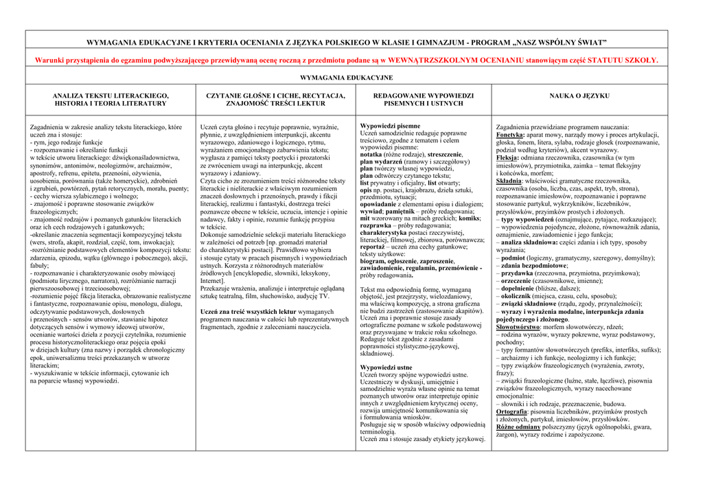 WYMAGANIA EDUKACYJNE I KRYTERIA OCENIANIA Z JĘZYKA POLSKIEGO W KLASIE I GIMNAZJUM - PROGRAM „NASZ WSPÓLNY ŚWIAT” Warunki przystąpienia do egzaminu podwyższającego przewidywaną ocenę roczną z przedmiotu podane są w WEWNĄTRZSZKOLNYM OCENIANIU stanowiącym część STATUTU SZKOŁY. WYMAGANIA EDUKACYJNE ANALIZA TEKSTU LITERACKIEGO, HISTORIA I TEORIA LITERATURY CZYTANIE GŁOŚNE I CICHE, RECYTACJA, ZNAJOMOŚĆ TREŚCI LEKTUR REDAGOWANIE WYPOWIEDZI PISEMNYCH I USTNYCH NAUKA O JĘZYKU Zagadnienia w zakresie analizy tekstu literackiego, które uczeń zna i stosuje: - rym, jego rodzaje funkcje - rozpoznawanie i określanie funkcji w tekście utworu literackiego: dźwiękonaśladownictwa, synonimów, antonimów, neologizmów, archaizmów, apostrofy, refrenu, epitetu, przenośni, ożywienia, uosobienia, porównania (także homeryckie), zdrobnień i zgrubień, powtórzeń, pytań retorycznych, morału, puenty; - cechy wiersza sylabicznego i wolnego; - znajomość i poprawne stosowanie związków frazeologicznych; - znajomość rodzajów i poznanych gatunków literackich oraz ich cech rodzajowych i gatunkowych; -określanie znaczenia segmentacji kompozycyjnej tekstu (wers, strofa, akapit, rozdział, część, tom, inwokacja); -rozróżnianie podstawowych elementów kompozycji tekstu: zdarzenia, epizodu, wątku (głównego i pobocznego), akcji, fabuły; - rozpoznawanie i charakteryzowanie osoby mówiącej (podmiotu lirycznego, narratora), rozróżnianie narracji pierwszoosobowej i trzecioosobowej; -rozumienie pojęć fikcja literacka, obrazowanie realistyczne i fantastyczne, rozpoznawanie opisu, monologu, dialogu, odczytywanie podstawowych, dosłownych i przenośnych - sensów utworów, stawianie hipotez dotyczących sensów i wymowy ideowej utworów, ocenianie wartości dzieła z pozycji czytelnika, rozumienie procesu historycznoliterackiego oraz pojęcia epoki w dziejach kultury (zna nazwy i porządek chronologiczny epok, uniwersalizmu treści przekazanych w utworze literackim; - wyszukiwanie w tekście informacji, cytowanie ich na poparcie własnej wypowiedzi. Uczeń czyta głośno i recytuje poprawnie, wyraźnie, płynnie, z uwzględnieniem interpunkcji, akcentu wyrazowego, zdaniowego i logicznego, rytmu, wyrażaniem emocjonalnego zabarwienia tekstu; wygłasza z pamięci teksty poetycki i prozatorski ze zwróceniem uwagi na interpunkcję, akcent wyrazowy i zdaniowy. Czyta cicho ze zrozumieniem treści różnorodne teksty literackie i nieliterackie z właściwym rozumieniem znaczeń dosłownych i przenośnych, prawdy i fikcji literackiej, realizmu i fantastyki, dostrzega treści poznawcze obecne w tekście, uczucia, intencje i opinie nadawcy, fakty i opinie, rozumie funkcję przypisu w tekście. Dokonuje samodzielnie selekcji materiału literackiego w zależności od potrzeb [np. gromadzi materiał do charakterystyki postaci]. Prawidłowo wybiera i stosuje cytaty w pracach pisemnych i wypowiedziach ustnych. Korzysta z różnorodnych materiałów źródłowych [encyklopedie, słowniki, leksykony, Internet]. Przekazuje wrażenia, analizuje i interpretuje oglądaną sztukę teatralną, film, słuchowisko, audycję TV. Wypowiedzi pisemne Uczeń samodzielnie redaguje poprawne treściowo, zgodne z tematem i celem wypowiedzi pisemne: notatka (różne rodzaje), streszczenie, plan wydarzeń (ramowy i szczegółowy) plan twórczy własnej wypowiedzi, plan odtwórczy czytanego tekstu; list prywatny i oficjalny, list otwarty; opis np. postaci, krajobrazu, dzieła sztuki, przedmiotu, sytuacji; opowiadanie z elementami opisu i dialogiem; wywiad; pamiętnik – próby redagowania; mit wzorowany na mitach greckich; komiks; rozprawka – próby redagowania; charakterystyka postaci rzeczywistej, literackiej, filmowej, zbiorowa, porównawcza; reportaż – uczeń zna cechy gatunkowe; teksty użytkowe: biogram, ogłoszenie, zaproszenie, zawiadomienie, regulamin, przemówienie próby redagowania. Zagadnienia przewidziane programem nauczania: Fonetyka: aparat mowy, narządy mowy i proces artykulacji, głoska, fonem, litera, sylaba, rodzaje głosek (rozpoznawanie, podział według kryteriów), akcent wyrazowy. Fleksja: odmiana rzeczownika, czasownika (w tym imiesłowów), przymiotnika, zaimka – temat fleksyjny i końcówka, morfem; Składnia: właściwości gramatyczne rzeczownika, czasownika (osoba, liczba, czas, aspekt, tryb, strona), rozpoznawanie imiesłowów, rozpoznawanie i poprawne stosowanie partykuł, wykrzykników, liczebników, przysłówków, przyimków prostych i złożonych. – typy wypowiedzeń (oznajmujące, pytające, rozkazujące); – wypowiedzenia pojedyncze, złożone, równoważnik zdania, oznajmienie, zawiadomienie i jego funkcja; – analiza składniowa: części zdania i ich typy, sposoby wyrażania; – podmiot (logiczny, gramatyczny, szeregowy, domyślny); – zdania bezpodmiotowe; – przydawka (rzeczowna, przymiotna, przyimkowa); – orzeczenie (czasownikowe, imienne); – dopełnienie (bliższe, dalsze); – okolicznik (miejsca, czasu, celu, sposobu); – związki składniowe (rządu, zgody, przynależności); – wyrazy i wyrażenia modalne, interpunkcja zdania pojedynczego i złożonego. Słowotwórstwo: morfem słowotwórczy, rdzeń; – rodzina wyrazów, wyrazy pokrewne, wyraz podstawowy, pochodny; – typy formantów słowotwórczych (prefiks, interfiks, sufiks); – archaizmy i ich funkcje, neologizmy i ich funkcje; – typy związków frazeologicznych (wyrażenia, zwroty, frazy); – związki frazeologiczne (luźne, stałe, łączliwe), pisownia związków frazeologicznych, wyrazy nacechowane emocjonalnie: – słowniki i ich rodzaje, przeznaczenie, budowa. Ortografia: pisownia liczebników, przyimków prostych i złożonych, partykuł, imiesłowów, przysłówków. Różne odmiany polszczyzny (język ogólnopolski, gwara, żargon), wyrazy rodzime i zapożyczone. Uczeń zna treść wszystkich lektur wymaganych programem nauczania w całości lub reprezentatywnych fra
