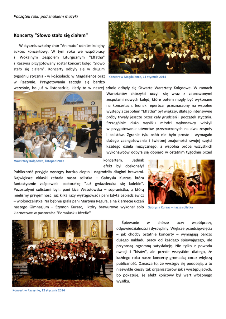 Początek roku pod znakiem muzyki Koncerty "Słowo stało się ciałem" W styczniu szkolny chór "Animato" odniósł kolejny sukces koncertowy. W tym roku we współpracy z Wokalnym Zespołem Liturgicznym "Effatha" z Raszyna przygotowany został koncert kolęd "Słowo stało się ciałem". Koncerty odbyły się w drugim tygodniu stycznia - w kościołach: w Magdalence oraz Koncert w Magdalence, 11 stycznia 2014 w Raszynie. Przygotowania zaczęły się bardzo wcześnie, bo już w listopadzie, kiedy to w naszej szkole odbyły się Otwarte Warsztaty Kolędowe. W ramach Warsztatów chórzyści uczyli się wraz z zaproszonymi zespołami nowych kolęd, które potem mogły być wykonane na koncertach. Jednak repertuar przeznaczony na wspólne występy z zespołem "Effatha" był większy, dlatego intensywne próby trwały jeszcze przez cały grudzień i początek stycznia. Szczególnie dużo wysiłku młodzi wykonawcy włożyli w przygotowanie utworów przeznaczonych na dwa zespoły i solistów. Zgranie tylu osób nie było proste i wymagało dużego zaangażowania i świetnej znajomości swojej części każdego dzieła muzycznego, a wspólna próba wszystkich wykonawców odbyła się dopiero w ostatnim tygodniu przed koncertem. Jednak efekt był doskonały! Publiczność przyjęła występy bardzo ciepło i nagrodziła długimi brawami. Największe oklaski zebrała nasza solistka – Gabrysia Kurzac, która fantastycznie zaśpiewała pastorałkę "Już gwiazdeczka się kolebie". Pozostałymi solistami byli: pani Liza Wesołowska – sopranistka, z którą mieliśmy przyjemność już kilka razy występować i pani Edyta Lebiedziewicz – wiolonczelistka. Na bębnie grała pani Martyna Reguła, a na klarnecie uczeń naszego Gimnazjum – Szymon Kurzac, który brawurowo wykonał solo Gabrysia Kurzac – nasza solistka klarnetowe w pastorałce "Pomaluśku Józefie". Warsztaty Kolędowe, listopad 2013 Śpiewanie w chórze uczy współpracy, odpowiedzialności i dyscypliny. Większe przedsięwzięcia – jak choćby ostatnie koncerty – wymagają bardzo dużego nakładu pracy od każdego śpiewającego, ale przynoszą ogromną satysfakcję. Nie tylko z powodu owacji i "bisów", ale przede wszystkim dlatego, że każdego roku nasze koncerty gromadzą coraz większą publiczność. Oznacza to, że występy się podobają, a to niezwykle cieszy tak organizatorów jak i występujących, bo pokazuje, że efekt końcowy był wart włożonego wysiłku. Koncert w Raszynie, 12 stycznia 2014 Konkurs Kolęd, Pastorałek i Piosenek Świątecznych dla klas 4-6 Pod koniec stycznia odbył się konkurs kolęd dla klas 4-6. I miejsce zdobyła Gabrysia Kurzac, II zajęły ex aequo Karolina Kępińska i Martyna Pałęga, II ex aequo duet Ewy Krawczyk i Juli Okruch oraz Katarzyna Białecka, zaś wyróżnienie otrzymały Natalia Mazurkiewicz oraz duet Joasi Jabłońskiej i Klary Pluty. Zwycięzcom gratulujemy i życzymy dalszych sukcesów wokalnych! Koncert Noworoczny W lutym odbył się w naszej szkole Koncert Noworoczny. Wystąpili: Chór Szkolny "Animato", Chór Kandydacki oraz solistki: Madzia Mętel i Łucja Gurdziel z klasy 0a, Natalia Kurzac z klasy 0b, Gabrysia Mętel, Wiktoria Dybowska, Ola Florczak i Julia Śliwowska z klasy 3e oraz Gabrysia Kurzac z klasy 5c. Chór szkolny "Animato" pierwszy raz wykonał repertuar tylko do podkładów karaoke, co wymagało od chórzystów wiele nauki. Zupełnie inaczej śpiewa się swobodnie, "na rękę" dyrygenta, który kontroluje, ale i słyszy - czy wszystkim starcza oddechu, czy zdążają z tekstem itp. - i może zareagować, gdy coś jest nie tak, jak być powinno, a zupełnie inaczej, gdy trzeba zdążyć do gotowego podkładu, który nie zmieni się według potrzeb chórzystów. Publiczności szczególnie spodobała się 3-głosowa piosenka "O, o, o - Orkiestra!" oraz 2-głosowa pieśń indiańska "The Earth is my mother". Chórzyści szczególnie polubili amerykańską piosenkę "Head and shoulders baby" i żydowską "Ner li". Nowością był także 3-głosowy "Perkusyjny fitness" z akompaniamentem gestodźwięków. Mimo, że był to utwór mówiony, a nie śpiewany, jego odpowiednie zgranie w czasie (każdy głos miał niezależny rytm i tekst) nie było proste. Później wystąpił Chór Kandydacki, który zaśpiewał tzw. "piosenki świąteczne": "Spojrzały Aniołki", "Dziewczynka z Andersena", "Zielony gość", "Grająca choinka" i "Strojnisia choinka". Dziewczęta z klas 0-3 akompaniowały sobie na instrumentach perkusyjnych. Pięknie wykonane piosenki wzbudziły bardzo żywe reakcje publiczności. W ostatniej części koncertu wystąpiły solistki. Najpierw duet Natalii Kurzac i Wiktorii Dybowskiej wykonał piosenkę "Zagraj dziecku kołysankę" do słów Wandy Chotomskiej. Potem Madzia Mętel z Łucją Gurdziel zaśpiewały razem piosenkę "Aniołek Najładniejszy". Następnie wystąpiły: Gabrysia Mętel z piosenką "Kolędowy czas" i duet Oli Florczak z Julią Śliwowską w piosence "Pastuszek bosy". Na końcu Gabrysia Kurzac zaśpiewała pastorałkę "Już gwiazdeczka się kolebie", do której sama zaakompaniowała na fortepianie. Dziewczęta zachwyciły publiczność przepięknymi interpretacjami prezentowanych piosenek oraz dużymi możliwościami wokalnymi. Większość z nich zajęła wysokie lokaty w szkolnym konkursie kolęd. Występ bardzo się spodobał, zarówno słuchacze jak i młodzi artyści byli zadowoleni ze wspólnego spotkania z muzyką. Muzyczne zapowiedzi To nie koniec muzycznych atrakcji – wkrótce czekają nas dwa kolejne konkursy szkolne: piosenki angielskiej oraz piosenki dziecięcej. Mamy nadzieję na liczny udział naszych uzdolnionych uczniów. W marcu odbędzie się także międzypowiatowy konkurs piosenki patriotycznej w Pamiątce, do którego przygotowują się zwycięzcy etapu szkolnego oraz chór "Animato". Trzymamy kciuki! Olivia Kaczyńska