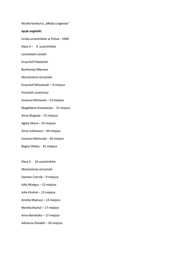 Wyniki konkursu „Młody Lingwista” Język angielski Liczba uczestników w Polsce - 5460 Klasy 4 – 9 uczestników Laureatami zostali: Krzysztof Palatyński Bartłomiej Mierzwa Wyróżnienia otrzymali: Krzysztof Wilczewski – 9 miejsce Pozostali uczestnicy: Zuzanna Wicherek – 13 miejsce Magdalena Kraszewska - 15 miejsce Anna Wygoda – 15 miejsce Agata Sikora – 24 miejsce Anna Juśkiewicz – 30 miejsce Zuzanna Niemczyk – 36 miejsce Bogna Oleksy - 41 miejsce Klasy 5 - 10 uczestników Wyróżnienie otrzymali: Szymon Czernik – 9 miejsce Julia Wielgus – 12 miejsce Julia Kindrat – 13 miejsce Amelia Majnusz – 13 miejsce Monika Buchal – 17 miejsce Anna Bartetzko – 17 miejsce Adrianna Śmiałek – 20 miejsce Julia Czapelka – 21 miejsce Hanna Szabla – 22 miejsce Marcelina Wyskwarska – 33 miejsce Klasa 6 - 4 uczestników Julia Brzozowska - 19 miejsce Mateusz Sperczyński – 19 miejsce Mateusz Kowalczuk – 25 miejsce Tomasz Dołmat – 25 miejsce Język niemiecki Liczba uczestników w Polsce: 1014 Klasa 4b – 5 uczestników Wyróżnienie otrzymali: Krzysztof Palatyński – 5 miejsce Marta Seredyńska – 6 miejsce Zuzanna Wicherek – 6 miejsce Kacper Świszcz – 6 miejsce Mateusz Wróblewski – 10 miejsce Klasy 5 – 6 uczestników Wyróżnienia otrzymali: Julia Kindrat – 8 miejsce Szymon Czernik – 8 miejsce Pozostali uczestnicy: Anna Bartetzko – 11 miejsce Amelia Majnusz – 11 miejsce Celina Dziurdzia – 12 miejsce Język francuski Liczba uczestników w Polsce - 532 Klasy 5 - 4 uczestników Hanna Szabla – 22 miejsce Maria Głowacka – 31 miejsce Monika Buchal – 34 miejsce Julia Wielgus – 40 miejsce