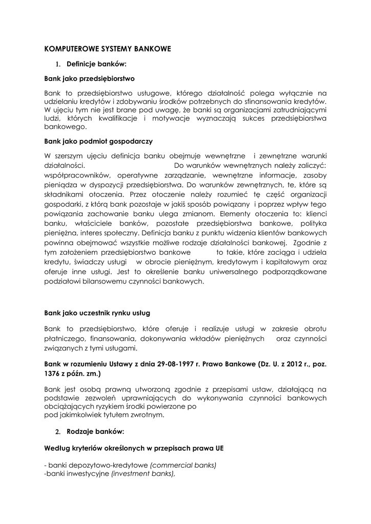 KOMPUTEROWE SYSTEMY BANKOWE 1. Definicje banków: Bank jako przedsiębiorstwo Bank to przedsiębiorstwo usługowe, którego działalność polega wyłącznie na udzielaniu kredytów i zdobywaniu środków potrzebnych do sfinansowania kredytów. W ujęciu tym nie jest brane pod uwagę, że banki są organizacjami zatrudniającymi ludzi, których kwalifikacje i motywacje wyznaczają sukces przedsiębiorstwa bankowego. Bank jako podmiot gospodarczy W szerszym ujęciu definicja banku obejmuje wewnętrzne i zewnętrzne warunki działalności. Do warunków wewnętrznych należy zaliczyć: współpracowników, operatywne zarządzanie, wewnętrzne informacje, zasoby pieniądza w dyspozycji przedsiębiorstwa. Do warunków zewnętrznych, te, które są składnikami otoczenia. Przez otoczenie należy rozumieć tę część organizacji gospodarki, z którą bank pozostaje w jakiś sposób powiązany i poprzez wpływ tego powiązania zachowanie banku ulega zmianom. Elementy otoczenia to: klienci banku, właściciele banków, pozostałe przedsiębiorstwa bankowe, polityka pieniężna, interes społeczny. Definicja banku z punktu widzenia klientów bankowych powinna obejmować wszystkie możliwe rodzaje działalności bankowej. Zgodnie z tym założeniem przedsiębiorstwo bankowe to takie, które zaciąga i udziela kredytu, świadczy usługi w obrocie pieniężnym, kredytowym i kapitałowym oraz oferuje inne usługi. Jest to określenie banku uniwersalnego podporządkowane podziałowi bilansowemu czynności bankowych. Bank jako uczestnik rynku usług Bank to przedsiębiorstwo, które oferuje i realizuje usługi w zakresie obrotu płatniczego, finansowania, dokonywania wkładów pieniężnych oraz czynności związanych z tymi usługami. Bank w rozumieniu Ustawy z dnia 29-08-1997 r. Prawo Bankowe (Dz. U. z 2012 r., poz. 1376 z późn. zm.) Bank jest osobą prawną utworzoną zgodnie z przepisami ustaw, działającą na podstawie zezwoleń uprawniających do wykonywania czynności bankowych obciążających ryzykiem środki powierzone po pod jakimkolwiek tytułem zwrotnym. 2. Rodzaje banków: Według kryteriów określonych w przepisach prawa UE - banki depozytowo-kredytowe (commercial banks) -banki inwestycyjne (investment banks), -banki uniwersalne, które wykonują czynności zarówno banków depozytowokredytowych, jak i banków inwestycyjnych. Według Ustawy z dnia 29-08-1997 r. Prawo Bankowe (Dz. U. z 2012 r., poz. 1376 z późn. zm.) - bank krajowy - bank mający siedzibę na terenie Rzeczypospolitej Polskiej, - bank zagraniczny- bank mający siedzibę za granicą Rzeczypospolitej Polskiej, na terytorium państwa niebędącego członkiem Unii Europejskiej, 3. Rodzaje czynności bankowych według Ustawy z dnia 29-08-1997 r. Prawo Bankowe (Dz. U. z 2012 r., poz. 1376 z późn. zm.) i ich znaczenie w realnym systemie bankowym 1. Czynnościami bankowymi są: - przyjmowanie wkładów pieniężnych płatnych na żądanie lub z nadejściem oznaczonego terminu oraz prowadzenie rachunków tych wkładów, - prowadzenie innych rachunków bankowych - udzielanie kredytów, - udzielanie i potwierdzanie gwarancji bankowych oraz otwieranie i potwierdzanie akredytyw, - emitowanie bankowych papierów wartościowych, - przeprowadzanie bankowych rozliczeń pieniężnych, - wykonywanie innych czynności przewidzianych wyłącznie dla banku w odrębnych ustawach. 2. Czynnościami bankowymi są również następujące czynności, o ile są one wykonywane przez banki: - udzielanie pożyczek pieniężnych, - operacje czekowe i wekslowe oraz operacje, których przedmiotem są warranty, -świadczenie usług płatniczych oraz wydawanie pieniądza elektronicznego, - terminowe operacje finansowe, - nabywanie i zbywanie wierzytelności pieniężnych, - przechowywanie przedmiotów i papierów wartościowych oraz udostępnianie skrytek sejfowych, - prowadzenie skupu i sprzedaży wartości dewizowych, - udzielanie i potwierdzanie poręczeń, wykonywanie czynności zleconych, związanych z emisją papierów wartościowych, - pośrednictwo w dokonywaniu przekazów pieniężnych oraz rozliczeń w obrocie dewizowym. Definicje operacji bankowych - to wszelkiego rodzaje usługi świadczone przez banki, które utożsamiane są z czynnościami bankowymi (Prawo bankowe z 1997r., art. 5): - czynności bankowe zastrzeżone wyłącznie dla banków - czynności, które są bankowymi, o ile są wykonywane przez banki (mogą być wykonywane przez inne podmioty), - wszelkie inne usługi świadczone przez banki na rzecz klientów - to wszelkiego rodzaju czynności wykonywane przez banki, które powodują zmiany w stanach rachunków i prowadzonej ewidencji księgowej - zarówno te które związane są ze świadczeniem usług na rzecz klientów - jak i operacje wynikające z gospodarki własnej Produkt bankowy - to usługa (operacja) będąca elementem oferty bankowej - to pojęcie tożsame z definicją operacji jako wszelkiego rodzaje usług świadczonych przez banki na rzecz klientów Rodzaje operacji bankowych Kryterium podziału Operacje Przedmiot bierne czynne pośredniczące Podmiot własne klientów Podział terytorialny krajowe zagraniczne Waluta operacji złotowe walutowe Forma rozliczeń bezgotówkowe gotówkowe Klasyczny podział operacji Operacje (pasywne) bierne Operacje (aktywne) Pozyskiwanie źródeł finansowania: przyjmowanie depozytów od klientów przyjmowanie depozytów od innych banków emisja własnych papierów wartościowych zaciąganie kredytów, w tym od NBP czynne Operacje pośredniczące Inwestowanie zgromadzonych środków pieniężnych w aktywa przychodowe: udzielanie kredytów i pożyczek udzielanie lokat innym bankom zakup papierów wartościowych skup wierzytelności lokowanie środków pieniężnych w NBP w ramach operacji otwartego rynku Operacje usługowe, których zadaniem nie jest ani pozyskiwanie, ani sprzedaż pieniądza. Wykonywane na zlecenie, rachunek i ryzyko klientów. obsługa rachunków bankowych przepro