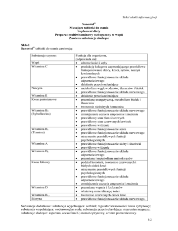 Tekst ulotki informacyjnej Sanostol® Musujące tabletki do ssania Suplement diety Preparat multiwitaminowy wzbogacony w wapń Zawiera substancje słodzące Skład: Sanostol® tabletki do ssania zawierają: Substancje czynne: Wapń Witamina C Niacyna Witamina E Kwas pantotenowy Witamina B2 (Ryboflawina) Witamina B1 (Tiamina) Witamina A Witamina B6 Kwas foliowy Witamina D Witamina B12 Biotyna Funkcja dla organizmu, (odpowiada za): • zdrowe kości i zęby • produkcję kolagenu zapewniającego prawidłowe funkcjonowanie skóry, kości, zębów, naczyń krwionośnych • prawidłowe funkcjonowanie układu odpornościowego • działanie przeciwutleniające • metabolizm węglowodanów, tłuszczów i białek • prawidłowe funkcjonowanie układu nerwowego • działanie przeciwutleniające • przemianę energetyczną, metabolizm białek i tłuszczów • tworzenie niektórych hormonów • prawidłowe funkcjonowanie układu nerwowego • zmniejszenie uczucia zmęczenia i znużenia • prawidłowy stan błon śluzowych • prawidłowy stan czerwonych krwinek • prawidłowe widzenie • prawidłowe funkcjonowanie serca • prawidłowe funkcjonowanie układu nerwowego • utrzymanie prawidłowych funkcji psychologicznych • prawidłowe funkcjonowanie skóry i śluzówki • prawidłowe widzenie • prawidłowe funkcjonowanie układu odpornościowego • przemianę i metabolizm aminokwasów • podział komórek, tworzenie czerwonych i białych ciałek krwi • utrzymanie prawidłowych funkcji psychologicznych • prawidłowe funkcjonowanie układu odpornościowego • zmniejszenie uczucia zmęczenia i znużenia • przemianę wapnia i fosforanów • właściwą mineralizację kości • tworzenie czerwonych ciałek krwi • prawidłowe funkcjonowanie układu nerwowego. Substancje dodatkowe: substancja wypełniająca: sorbitol; regulator kwasowości: kwas cytrynowy; substancja wypełniająca: wodorowęglan sodu; substancja przeciwzbrylająca: stearynian magnezu; substancje słodzące: aspartam, acesulfam K; aromat cytrynowy, aromat pomarańczowy. 1/2 Zalecane spożycie: • Dzieci od 4 do 6 roku życia: 1 tabletka dziennie. • Dzieci od 6 do 12 roku życia: 2 tabletki dziennie. • Dzieci od 12 roku życia, młodzież i dorośli: 3 tabletki dziennie. Nie należy przekraczać zalecanej porcji do spożycia w ciągu dnia. Informacje na temat preparatu Sanostol® jest preparatem w postaci tabletek do ssania o owocowym smaku, zawierających zestaw witamin oraz wapń. Witaminy oraz wapń są istotne dla prawidłowego wzrostu i rozwoju dziecka. Wapń i witamina D obecne w preparacie są jednymi z ważniejszych substancji dla organizmu człowieka. Są potrzebne m.in. dla prawidłowego wzrostu i rozwoju kości u dzieci. Ponadto wapń bierze udział w procesach krzepnięcia krwi, prawidłowym działaniu układu nerwowego i mięśniowego. Organizm ludzki nie potrafi wytworzyć witamin oraz wapnia, dlatego też składniki te muszą być dostarczane wraz z pożywieniem. Stosowanie preparatu Sanostol® uzupełnia poziom witamin i wapnia w organizmie. Zalecenia do stosowania preparatu Sanostol®: • dzieci i młodzież w okresie intensywnego wzrostu, • w okresie jesienno-zimowym, • w okresie rekonwalescencji, • w okresie szczególnego przeciążenia organizmu (stres, duży wysiłek fizyczny i umysłowy). Dla utrzymania prawidłowego stanu zdrowia należy stosować zrównoważoną, zróżnicowaną dietę i prowadzić zdrowy tryb życia. Preparat ten nie może być stosowany jako substytut zróżnicowanej diety. Preparat nie zawiera cukru. Produkt zawiera aspartam, który jest źródłem fenyloalaniny. Spożycie w nadmiernych ilościach może mieć efekt przeczyszczający. Preparat przechowywać w temperaturze nieprzekraczającej 25°C, w szczelnie zamkniętym opakowaniu, w sposób niedostępny dla małych dzieci. Nie stosować po upływie daty minimalnej trwałości podanej na opakowaniu. Środek osuszający (żel krzemionkowy) zawarty w nakrętce nie jest przeznaczony do spożycia – chronić przed dziećmi. Dostępne opakowania: 30 i 60 tabletek. Producent: Takeda Pharma Sp. z o.o. Al. Jerozolimskie 146 A 02-305 Warszawa tel. 22 608 13 00 faks 22 608 13 03 (logo) Miejsce wytwarzania: Takeda Pharma Sp. z o.o. ul. Księstwa Łowickiego 12 99-420 Łyszkowice www.sanostol.pl 2/2