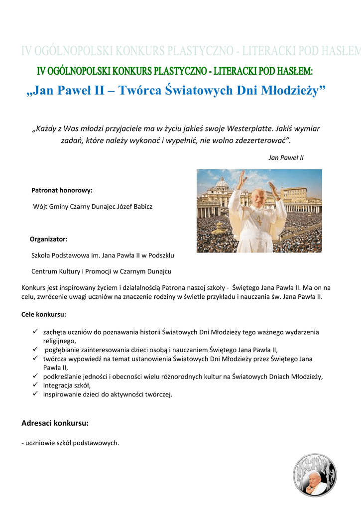 „Jan Paweł II – Twórca Światowych Dni Młodzieży” „Każdy z Was młodzi przyjaciele ma w życiu jakieś swoje Westerplatte. Jakiś wymiar zadań, które należy wykonać i wypełnić, nie wolno zdezerterować”. Jan Paweł II Patronat honorowy: Wójt Gminy Czarny Dunajec Józef Babicz Organizator: Szkoła Podstawowa im. Jana Pawła II w Podszklu Centrum Kultury i Promocji w Czarnym Dunajcu Konkurs jest inspirowany życiem i działalnością Patrona naszej szkoły - Świętego Jana Pawła II. Ma on na celu, zwrócenie uwagi uczniów na znaczenie rodziny w świetle przykładu i nauczania św. Jana Pawła II. Cele konkursu: zachęta uczniów do poznawania historii Światowych Dni Młodzieży tego ważnego wydarzenia religijnego, pogłębianie zainteresowania dzieci osobą i nauczaniem Świętego Jana Pawła II, twórcza wypowiedź na temat ustanowienia Światowych Dni Młodzieży przez Świętego Jana Pawła II, podkreślanie jedności i obecności wielu różnorodnych kultur na Światowych Dniach Młodzieży, integracja szkół, inspirowanie dzieci do aktywności twórczej. Adresaci konkursu: - uczniowie szkół podstawowych. Zasady uczestnictwa: • KONKURS PLASTYCZNY – „JAN PAWEŁ II – TWÓRCA ŚWIATOWYCH DNI MŁODZIEŻY” - PLAKAT 1. 2. 3. 4. 5. 6. 7. 8. 9. • Uczestnicy konkursu wykonują pracę plastyczną zgodnie z hasłem: „Jan Paweł II – Twórca Światowych Dni Młodzieży” – PLAKAT. Format prac: A4 lub A3. Technika wykonania – dowolna: malarstwo, rysunek, techniki mieszane (oprócz prac przestrzennych). Praca musi być wykonana tylko przez jednego autora, bez pomocy osób trzecich (prace zbiorowe nie będą brane pod uwagę). Uczestnik konkursu składa tylko jedną pracę, szkoła w każdej kategorii maksymalnie może złożyć 3 prace. Prac konkursowych nie należy podklejać ani oprawiać. Prace zrolowane, zniszczone w wyniku niewłaściwego opakowania, nadesłane po terminie oraz niezgodne z regulaminem nie będą oceniane. Do każdej pracy powinny być dołączone: tytuł pracy, imię i nazwisko autora, adres, klasa, kategoria, dane szkoły, imię i nazwisko opiekuna pracy według metryczki stanowiącej załącznik nr 1 do niniejszego regulaminu. Termin nadsyłania prac do 12.10.2015 r. na adres: Szkoła Podstawowa im. Jana Pawła II w Podszklu Podszkle 47, 34-472 Piekielnik Kryteria oceny: 1. Prace zostaną ocenione w dwóch grupach wiekowych: I grupa: kl. I-III II grupa: kl. IV-VI 2. Powołana przez organizatora komisja weźmie pod uwagę: - zgodność z tematyką konkursu, - oryginalność pomysłu, - walory artystyczne, - samodzielność wykonania pracy. 3. Autorzy nagrodzonych i wyróżnionych prac otrzymają dyplomy oraz nagrody rzeczowe. 4. Prace konkursowe nie podlegają zwrotowi. • Nagrody: 1. Ogłoszenie wyników oraz wręczenie nagród odbędzie się 22 października 2015 r. w Szkole Podstawowej im. Jana Pawła II w Podszklu. • Uwagi organizacyjne: 1. Wyniki konkursu plastycznego zostaną wysłane na podane w metryczkach skrzynki e-mailowe szkół. 2. Bliższych informacji na temat konkursów można zasięgać pod numerem telefonu szkoły: 18-285-70-07 lub (Lucyna Hosaniak 511-173-367). • KONKURS LITERACKI – „WYWIAD Z JANEM PAWŁEM II NA TEMAT ŚWIATOWYCH . DNI MŁODZIEŻY” 1. Praca powinna zawierać cechy wywiadu (układ graficzny, zwroty grzecznościowe, osobisty ton wypowiedzi, trójdzielna budowa). 2. Na konkurs można nadsyłać prace tylko w formie wydruku komputerowego. 3. Objętość pracy maksymalnie dwie strony tekstu formatu A4. 4. Jeden uczestnik może nadesłać jedną pracę, a dana szkoła maksymalnie trzy prace. 5. Do konkursu dopuszczone będą wyłącznie prace, które nie były wcześniej publikowane i w sposób oczywisty będą nawiązywać do hasła konkursu „Wywiad z Janem Pawłem II na temat Światowych Dni Młodzieży”. 6. Do każdej pracy powinny być dołączone: tytuł pracy, imię i nazwisko autora, adres, klasa, kategoria, dane szkoły, imię i nazwisko opiekuna pracy według metryczki stanowiącej załącznik nr 1 do niniejszego regulaminu. 7. Termin nadsyłania prac: do 12.10.2015 r. na adres: Szkoła Podstawowa im. Jana Pawła II w Podszklu Podszkle 47, 34-472 Piekielnik • Kryteria oceny: 1. Prace zostaną ocenione w jednej grupie wiekowej: kl. IV-VI 2. Powołana przez organizatora komisja weźmie pod uwagę: - zgodność z tematyką konkursu, - oryginalność ujęcia tematu (kreatywność, wrażliwość i sposób emocjonalnego wyrazu), - poprawność językową, stylistyczną, ortograficzną, - samodzielność wykonania pracy. 3. Autorzy nagrodzonych i wyróżnionych prac otrzymają dyplomy oraz nagrody rzeczowe. 4. Prace konkursowe nie podlegają zwrotowi. • Nagrody: 1. Ogłoszenie wyników oraz wręczenie nagród odbędzie się 22 października 2015 r. w Szkole Podstawowej im. Jana Pawła II w Podszklu. • Uwagi organizacyjne: 1. Wyniki konkursu literackiego zostaną wysłane na podane w metryczkach skrzynki e-mailowe szkół. 2. Bliższych informacji na temat konkursów można zasięgać pod numerem telefonu szkoły: 18-285-70-07 lub (Lucyna Hosaniak 511-173-367). Załącznik nr 1 METRYCZKA PRACY (prosimy wypełniać drukowanymi literami) Tytuł pracy: Imię i nazwisko autora pracy: Klasa, kategoria: Dokładny adres szkoły: Pieczątka szkoły: Telefon, fax, e-mail szkoły: Imię i nazwisko opiekuna pracy: ……………………………………………………………….. (podpis opiekuna pracy) Wyrażam zgodę na: • Umieszczenie i przetwarzanie moich danych osobowych w bazie danych adresowej organizatora, we wszelkich działaniach związanych z IV Ogólnopolskim Konkursem Plastyczno – Literackim pod hasłem: „Jan Paweł II – Twórca Światowych Dni Młodzieży” • Wykorzystanie przez organizatora moich prac do celów edukacyjnych oraz ich publikacji we fragmentach lub w całości z zachowaniem praw autorskich. …………………………………………