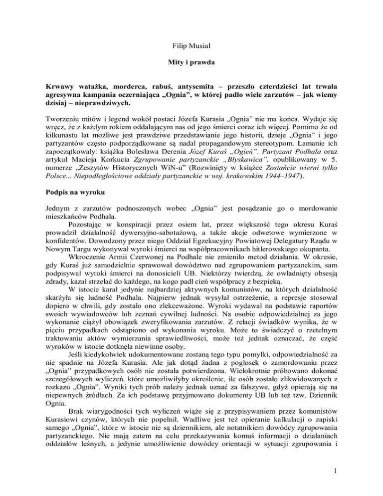 Filip Musiał Mity i prawda Krwawy watażka, morderca, rabuś, antysemita – przeszło czterdzieści lat trwała agresywna kampania oczerniająca „Ognia”, w której padło wiele zarzutów – jak wiemy dzisiaj – nieprawdziwych. Tworzeniu mitów i legend wokół postaci Józefa Kurasia „Ognia” nie ma końca. Wydaje się wręcz, że z każdym rokiem oddalającym nas od jego śmierci coraz ich więcej. Pomimo że od kilkunastu lat możliwe jest prawdziwe przedstawianie jego historii, dzieje „Ognia” i jego partyzantów często podporządkowane są nadal propagandowym stereotypom. Łamanie ich zapoczątkowały: książka Bolesława Derenia Józef Kuraś „Ogień”. Partyzant Podhala oraz artykuł Macieja Korkucia Zgrupowanie partyzanckie „Błyskawica”, opublikowany w 5. numerze „Zeszytów Historycznych WiN-u” (Rozwinięty w książce Zostańcie wierni tylko Polsce... Niepodległościowe oddziały partyzanckie w woj. krakowskim 1944–1947). Podpis na wyroku Jednym z zarzutów podnoszonych wobec „Ognia” jest posądzanie go o mordowanie mieszkańców Podhala. Pozostając w konspiracji przez osiem lat, przez większość tego okresu Kuraś prowadził działalność dywersyjno-sabotażową, a także akcje odwetowe wymierzone w konfidentów. Dowodzony przez niego Oddział Egzekucyjny Powiatowej Delegatury Rządu w Nowym Targu wykonywał wyroki śmierci na współpracownikach hitlerowskiego okupanta. Wkroczenie Armii Czerwonej na Podhale nie zmieniło metod działania. W okresie, gdy Kuraś już samodzielnie sprawował dowództwo nad zgrupowaniem partyzanckim, sam podpisywał wyroki śmierci na donosicieli UB. Niektórzy twierdzą, że owładnięty obsesją zdrady, kazał strzelać do każdego, na kogo padł cień współpracy z bezpieką. W istocie karał jedynie najbardziej aktywnych komunistów, na których działalność skarżyła się ludność Podhala. Najpierw jednak wysyłał ostrzeżenie, a represje stosował dopiero w chwili, gdy zostało ono zlekceważone. Wyroki wydawał na podstawie raportów swoich wywiadowców lub zeznań cywilnej ludności. Na osobie odpowiedzialnej za jego wykonanie ciążył obowiązek zweryfikowania zarzutów. Z relacji świadków wynika, że w pięciu przypadkach odstąpiono od wykonania wyroku. Może to świadczyć o rzetelnym traktowaniu aktów wymierzania sprawiedliwości, może też jednak oznaczać, że część wyroków w istocie dotknęła niewinne osoby. Jeśli kiedykolwiek udokumentowane zostaną tego typu pomyłki, odpowiedzialność za nie spadnie na Józefa Kurasia. Ale jak dotąd żadna z pogłosek o zamordowaniu przez „Ognia” przypadkowych osób nie została potwierdzona. Wielokrotnie próbowano dokonać szczegółowych wyliczeń, które umożliwiłyby określenie, ile osób zostało zlikwidowanych z rozkazu „Ognia”. Wyniki tych prób należy jednak uznać za fałszywe, gdyż opierają się na niepewnych źródłach. Za ich podstawę przyjmowano dokumenty UB lub też tzw. Dziennik Ognia. Brak wiarygodności tych wyliczeń wiąże się z przypisywaniem przez komunistów Kurasiowi czynów, których nie popełnił. Wadliwe jest też opieranie kalkulacji o zapiski samego „Ognia”, które w istocie nie są dziennikiem, ale notatnikiem dowódcy zgrupowania partyzanckiego. Nie mają zatem na celu przekazywania komuś informacji o działaniach oddziałów leśnych, a jedynie umożliwienie dowódcy orientacji w sytuacji zgrupowania i 1 ewidencji wydanych czy planowanych rozkazów. Sposób zapisu – równoważniki zdań, stosowanie rozmaitych „znaczków” – przy braku wskazówek do ich odczytania, wyklucza, jak się wydaje, możliwość prawidłowego ich odcyfrowania. Na rachunek „Ognia” Przeciwnicy Józefa Kurasia twierdzą, że jego partyzanci dokonywali pospolitych rabunków, podnosi się przy tej okazji tzw. problem „bandycenia się” oddziałów niepodległościowych. Większość partyzantów została zmuszona do powrotu do lasu w wyniku działań podejmowanych przez polski i sowiecki aparat represji. Dowódcy oddziałów trwali przy koncepcji walki zbrojnej, licząc na rychły wybuch III wojny światowej. Zainstalowaną początkowo w Lublinie, a następnie w Warszawie, władzę komunistyczną i jej ekspozytury w terenie traktowali jako nowych okupantów. Jednocześnie likwidacja struktur Podziemnego Państwa sprawiała, że każdy z oddziałów musiał zdobywać środki do prowadzenia dalszej działalności niepodległościowej na własną rękę. Mając do wyboru prywatnych gospodarzy i instytucje państwowe lub spółdzielnie (które w istocie – wbrew swej naturze – także były upaństwowione), Kuraś stosował konfiskatę wobec tych drugich, traktując je jako własność nowego okupanta. Tego typu akcje były jedynym sposobem na zdobycie środków umożliwiających dozbrojenie i przetrwanie oddziału. Wspomina się także często o rabunkach na osobach prywatnych, jakich dopuszczać się mieli partyzanci ze zgrupowania „Błyskawica”. Odróżnić jednak należy akcje o charakterze kontrybucyjnym od rabunku. „Ogień” nakładał na konfidentów i współpracowników UB oraz aktywnych działaczy PPR kary finansowe, które mogły być zamienione na produkty lub inwentarz żywy. Działania te propaganda komunistyczna przedstawiała jako pospolite zbrodnie i starała się skonfliktować ludność Podhala z partyzantami. „Dziennik Polski” w lutym 1946 roku pisał m.in.: Na terenie podhalańskim działają tzw. bandy „Ognia”. Jest to pseudonim znanego przed wojną koniokrada, psychopaty Józefa Kurasia, który w czasie wojny prowadził partyzantkę „na własny rachunek”, odznaczając się szczególnym sadyzmem wobec eksploatowanej ludności góralskiej. W aktach oskarżeń i wyrokach skazywanych partyzantów celowo kładziono nacisk na rzekomo terrorystyczno-rabunkowy charakter ich działalności. Komunistyczny wymiar sprawiedliwości starał się przedstawiać wszelkie ugrupowa