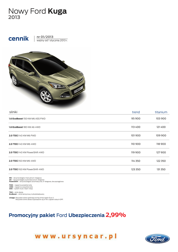 Nowy Ford Kuga 2013 cennik nr 01/2013 ważny od 1 stycznia 2013 r. silniki trend titanium 1.6 EcoBoost 150 KM M6 ASS FWD 95 900 103 900 1.6 EcoBoost 180 KM A6 4WD 113 400 121 400 2.0 TDCi 140 KM M6 FWD 101 900 109 900 2.0 TDCi 140 KM M6 4WD 110 900 118 900 2.0 TDCi 140 KM PowerShift 4WD 119 900 127 900 2.0 TDCi 163 KM M6 4WD 114 350 122 350 2.0 TDCi 163 KM PowerShift 4WD 123 350 131 350 M6 – skrzynia biegów manualna 6–biegowa A6 – skrzynia biegów automatyczna 6–biegowa PowerShift – skrzynia biegów automatyczna, 6–biegowa, dwusprzęgłowa FWD – napęd na przednie koła 4WD – napęd na wszystkie koła ASS – system Auto–Start–Stop TDCi – silnik diesla EcoBoost – silnik benzynowy turbodoładowany Uwaga: Wszystkie silniki spełniają normę emisji spalin Euro V. Wszystkie silniki diesla wyposażone są w filtr cząstek stałych DPF. Promocyjny pakiet Ford Ubezpieczenia 2,99% Nowy Ford Kuga 2013 wyposażenie bezpieczeństwo System ABS – z elektronicznym układem podziału siły hamowania (EBD) Elektroniczny układ stabilizacji toru jazdy (ESP) – z układem poprawiającym stabilność na zakrętach (TVC), układem ułatwiającym ruszanie na wzniesieniach (HSA) oraz systemem stabilizacji toru jazdy przyczepy (w wersji Titanium zawiera dodatkowo system zapobiegający wywróceniu pojazdu (RSC)) Światła awaryjnego hamowania – pulsujące światła stop, włączające się automatycznie podczas gwałtownego hamowania Poduszki powietrzne – poduszki czołowe dla kierowcy i pasażera z przodu Poduszki powietrzne – poduszka chroniąca kolana kierowcy Poduszki powietrzne – poduszki boczne dla kierowcy i pasażera z przodu Poduszki powietrzne – boczne kurtyny powietrzne chroniące osoby w 1. i 2. rzędzie siedzeń Układ monitorowania ciśnienia w ogumieniu (DDS) ISOFIX – system mocowania fotelików dziecięcych na skrajnych siedzeniach w 2. rzędzie System zapobiegający kolizjom przy małych prędkościach (ACS) (w wersji Trend zawiera dodatkowo podgrzewaną przednią szybę) System wspomagający utrzymanie pojazdu na pasie ruchu (LKA) – zawiera: system zapobiegający kolizjom przy małych prędkościach (ACS), system rozpoznawania znaków drogowych, system monitorowania koncentracji kierowcy oraz system automatycznej zmiany świateł drogowych na mijania System wspomagający utrzymanie pojazdu na pasie ruchu (LKA) – zawiera: system zapobiegający kolizjom przy małych prędkościach (ACS), system rozpoznawania znaków drogowych, system monitorowania koncentracji kierowcy, system automatycznej zmiany świateł drogowych na mijania, podgrzewaną przednią szybę, automatycznie sterowane wycieraczki z czujnikiem deszczu, automatycznie ściemniające się lusterko wsteczne Przednie światła przeciwmgielne Spryskiwacze reflektorów Reflektory automatyczne – zawierają: automatycznie sterowane wycieraczki z czujnikiem deszczu, automatycznie ściemniające się lusterko wsteczne, funkcję wyłączania świateł z opóźnieniem Reflektory biksenonowe – z samoczynną regulacją kąta ustawienia, spryskiwaczami i systemem statycznych świateł doświetlających zakręty (zawierają światła do jazdy dziennej LED oraz tylne światła LED) System monitorowania martwego pola widzenia w lusterkach (BLIS) – zawiera elektrycznie składane lusterka boczne Funkcja elektrycznej blokady zamków tylnych drzwi – uniemożliwiająca ich otwarcie od środka przez dzieci komfort Klimatyzacja manualna Klimatyzacja elektroniczna dwustrefowa – z automatyczną regulacją temperatury (DEATC) Przycisk rozrusznika Ford Power System wspomagający parkowanie (SAPP) – zawiera czujniki parkowania z przodu i z tyłu Wycieraczki przedniej szyby – sterowane automatycznie, z czujnikiem deszczu (dostępne tylko z automatycznymi reflektorami i samoczynnie ściemniającym się lusterkiem wstecznym) Przednia szyba – podgrzewana (Quickclear) i podgrzewane dysze spryskiwaczy Lusterko wsteczne – automatycznie ściemniające się (dostępne tylko z: automatycznymi reflektorami i automatycznymi wycieraczkami z czujnikiem deszczu) Szyby – elektrycznie sterowane szyby przednich i tylnych drzwi – opuszczanie i podnoszenie jednym naciśnięciem przycisku, z czujnikami przeszkody, funkcja całkowitego otwierania i zamykania wszystkich szyb Lusterka boczne – sterowane i podgrzewane elektrycznie, obudowy lakierowane w kolorze nadwozia, ze zintegrowanymi kierunkowskazami Lusterka boczne – składane elektrycznie Fotel kierowcy – regulacja podparcia odcinka lędźwiowego Fotel kierowcy – ręczna regulacja położenia w 6. kierunkach Fotel pasażera – ręczna regulacja położenia w 4. kierunkach Przednie fotele – podgrzewane, z regulacją temperatury Przednie fotele – regulacja położenia zagłówków w 4. kierunkach Fotele – styl sportowy, tapicerka materiałowa Fotele – styl sportowy, tapicerka częściowo skórzana Fotele – styl sportowy, tapicerka skórzana Torino, fotel kierowcy z elektryczną regulacją położenia w 10. kierunkach, fotel pasażera z ręczną regulacją położenia w 6. kierunkach, ręczna regulacja podparcia odcinka lędźwiowego fotela kierowcy i pasażera, podłokietnik na środku tylnej kanapy, składane blaty stolików na oparciach przednich foteli) (3CFDW) Tempomat – zawiera układ regulowanego ograniczania prędkości (ASLD) Inteligentny tempomat ACC – z systemem wczesnego ostrzegania Czujniki parkowania – z tyłu Drzwi bagażnika – zamykane/ otwierane elektrycznie i bezdotykowo Dach panoramiczny – otwierany elektrycznie (zawiera: lampki sufitowe wyłączane z opóźnieniem oraz lampki do czytania z przodu i z tyłu) Kamera ułatwiająca parkowanie tyłem – dostępna jedynie z systemem nawigacji satelitarnej Sony CD/SD Konsola centralna Premium – z podłokietnikiem z regulacją w poziomie, otwartym schowkiem, schowkiem na płyty CD, dodatkowymi gniazdkami zasilania 12V (z przodu i z tyłu) Konsola centralna Premium – z pod