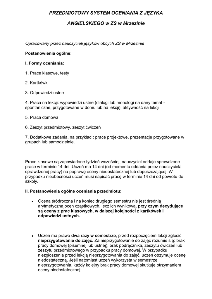 PRZEDMIOTOWY SYSTEM OCENIANIA Z JĘZYKA ANGIELSKIEGO w ZS w Mrzezinie Opracowany przez nauczycieli języków obcych ZS w Mrzezinie Postanowienia ogólne: I. Formy oceniania: 1. Prace klasowe, testy 2. Kartkówki 3. Odpowiedzi ustne 4. Praca na lekcji: wypowiedzi ustne (dialogi lub monologi na dany temat spontaniczne, przygotowane w domu lub na lekcji); aktywność na lekcji 5. Praca domowa 6. Zeszyt przedmiotowy, zeszyt ćwiczeń 7. Dodatkowe zadania, na przykład : prace projektowe, prezentacje przygotowane w grupach lub samodzielnie. Prace klasowe są zapowiadane tydzień wcześniej, nauczyciel oddaje sprawdzone prace w terminie 14 dni. Uczeń ma 14 dni (od momentu oddania przez nauczyciela sprawdzonej pracy) na poprawę oceny niedostatecznej lub dopuszczającej. W przypadku nieobecności uczeń musi napisać pracę w terminie 14 dni od powrotu do szkoły. II. Postanowienia ogólne oceniania przedmiotu: Ocena śródroczna i na koniec drugiego semestru nie jest średnią arytmetyczną ocen cząstkowych, lecz ich wynikową, przy czym decydujące są oceny z prac klasowych, w dalszej kolejności z kartkówek i odpowiedzi ustnych. Uczeń ma prawo dwa razy w semestrze, przed rozpoczęciem lekcji zgłosić nieprzygotowanie do zajęć. Za nieprzygotowanie do zajęć rozumie się: brak pracy domowej (pisemnej lub ustnej), brak podręcznika, zeszytu ćwiczeń lub zeszytu przedmiotowego w przypadku pracy domowej. W przypadku niezgłoszenia przed lekcją nieprzygotowania do zajęć, uczeń otrzymuje ocenę niedostateczną. Jeśli natomiast uczeń wykorzysta w semestrze nieprzygotowania, każdy kolejny brak pracy domowej skutkuje otrzymaniem oceny niedostatecznej. W przypadku sprawdzianów pisemnych, prac klasowych lub kartkówek przyjmuje się skalę punktową przeliczaną na oceny cyfrowe wg kryteriów: ocena celująca 100% - 95% ocena bardzo dobra 94% - 86% ocena dobra 85% - 70% ocena dostateczna 69% - 50% ocena dopuszczająca 49% - 31% ocena niedostateczna 30% - 0% Uczeń otrzymuje „minus” (-) ołówkiem do dziennika w następujących przypadkach: -gdy nie ma zeszytu, podręcznika, ćwiczeń ( o ile nie było w nich zadanej pracy domowej) - w przypadku braku pracy na lekcji (na jednej lekcji można dostać jeden lub więcej minusów) Trzy minusy są podstawą do postawienia oceny niedostatecznej. Za aktywność na lekcji uczeń otrzymuje plusy (+) ołówkiem do dziennika. Za uzyskanie trzech plusów uczeń otrzymuje ocenę bardzo dobrą. III. Zasady poprawiania stopni: Prace klasowe są zapowiadane tydzień wcześniej, nauczyciel oddaje sprawdzone prace w terminie 14 dni. Uczeń ma 14 dni (od momentu oddania przez nauczyciela sprawdzonej pracy) na poprawę oceny niedostatecznej lub dopuszczającej. W przypadku nieobecności uczeń musi napisać pracę w terminie 14 dni od powrotu do szkoły. Na koniec semestru i roku szkolnego nie przewiduje się zaliczania materiału w celu podwyższenia stopnia. Kartkówki mogą być niezapowiedziane, sprawdzają wiedzę maksymalnie z trzech ostatnich lekcji. Oceny z kartkówki nie można poprawić, za wyjątkiem oceny niedostatecznej lub dopuszczającej. Prace niesamodzielne, plagiaty, fakt odpisywania podczas pisania sprawdzianu, pracy klasowej czy kartkówki skutkuje otrzymaniem oceny niedostatecznej bez możliwości poprawy. IV. Sposób udostępniania rodzicom prac kontrolnych: Prace klasowe (całogodzinne) udostępniane są na prośbę rodziców w obecności nauczyciela danego przedmiotu w trakcie dnia otwartego lub po indywidualnym ustaleniu terminu spotkania. V. Kryteria stosowane wobec uczniów z aktualnymi opiniami z Poradni Psychologiczno-Pedagogicznej. Nauczyciel ma obowiązek zapoznania się z opinią Poradni Psychologiczno-Pedagogicznej i dostosowania wymagań do indywidualnej opinii ucznia. Na przykład, w przypadku uczniów ze stwierdzoną dysortografią obowiązują podstawowe kryteria oceniania stosowane dla wszystkich uczniów z wyjątkiem wymagań dotyczących ortografii. Uczeń ze stwierdzoną dysortografią powinien znać teoretyczne zasady ortograficzne z języka angielskiego, ma jednak prawo do błędów w ich praktycznym zastosowaniu. Błędy te nie mają wpływu na ocenę. Nauczyciel podczas sprawdzania prac pisemnych ucznia, uwzględnia fonetyczny zapis wyrazu (uczeń nie jest w stanie przyswoić zapisu graficznego, ale pisze, jak wymawia się dany wyraz). Uczniowie z dysfunkcjami mają wydłużony czas pracy podczas prac pisemnych. Obowiązują następujące, ogólne kryteria oceniania z języka angielskiego (wg Statutu Szkoły) 1) ocenę celującą otrzymuje uczeń, który: a) spełnia wymagania co najmniej wykraczające, zawarte w programie nauczania, uwzględniające podstawę programową ; b) samodzielnie i twórczo rozwija swe uzdolnienia; c) biegle posługuje się zdobytymi wiadomościami w rozwiązywaniu problemów teoretycznych i praktycznych, proponuje rozwiązania nietypowe, rozwiązuje także zadania wykraczające poza program nauczania danej klasy; d) osiąga sukcesy w konkursach i olimpiadach przedmiotowych, kwalifikuje się do finałów na szczeblu wojewódzkim, regionalnym albo krajowym lub posiada inne porównywalne osiągnięcia; 2) ocenę bardzo dobrą otrzymuje uczeń, który: a) opanował pełny zakres wiedzy i umiejętności określony programem nauczania przedmiotu w danej klasie; b) sprawnie posługuje się zdobytymi wiadomościami, rozwiązuje samodzielnie problemy teoretyczne i praktyczne, potrafi zastosować posiadaną wiedzę do rozwiązywania zadań, problemów w nowych sytuacjach; 3) ocenę dobrą otrzymuje uczeń, który: a) opanował wiadomości i umiejętności w zakresie pozwalającym na rozumienie większości relacji między elementami wiedzy z danego przedmiotu nauczania; b) poprawnie stosuje wiadomości, rozwiązuje samodzielnie typowe zadania teoretyczne lub praktyczne; 4) ocenę dostateczną otrzymuje uczeń, który: a) opanował podstawowe treści programowe w zakresie umożliwiającym po