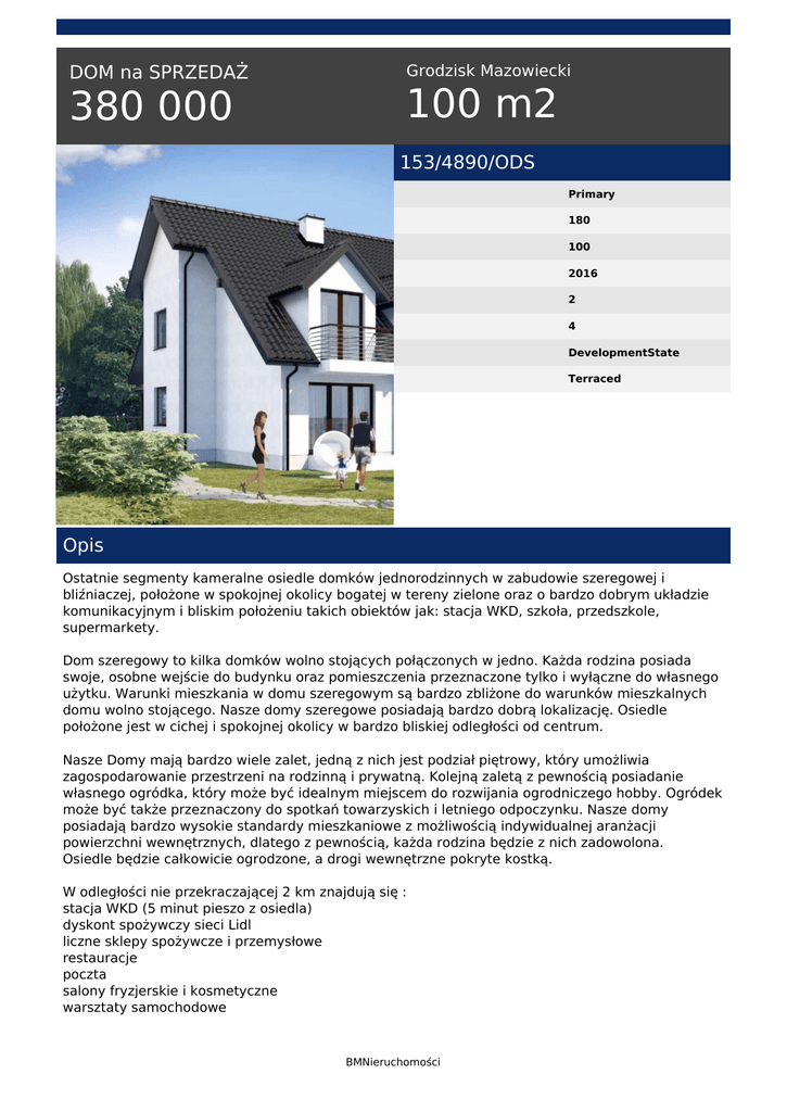 DOM na SPRZEDAŻ 380 000 Grodzisk Mazowiecki 100 m2 153/4890/ODS Primary 180 100 2016 2 4 DevelopmentState Terraced Opis Ostatnie segmenty kameralne osiedle domków jednorodzinnych w zabudowie szeregowej i bliźniaczej, położone w spokojnej okolicy bogatej w tereny zielone oraz o bardzo dobrym układzie komunikacyjnym i bliskim położeniu takich obiektów jak: stacja WKD, szkoła, przedszkole, supermarkety. Dom szeregowy to kilka domków wolno stojących połączonych w jedno. Każda rodzina posiada swoje, osobne wejście do budynku oraz pomieszczenia przeznaczone tylko i wyłączne do własnego użytku. Warunki mieszkania w domu szeregowym są bardzo zbliżone do warunków mieszkalnych domu wolno stojącego. Nasze domy szeregowe posiadają bardzo dobrą lokalizację. Osiedle położone jest w cichej i spokojnej okolicy w bardzo bliskiej odległości od centrum. Nasze Domy mają bardzo wiele zalet, jedną z nich jest podział piętrowy, który umożliwia zagospodarowanie przestrzeni na rodzinną i prywatną. Kolejną zaletą z pewnością posiadanie własnego ogródka, który może być idealnym miejscem do rozwijania ogrodniczego hobby. Ogródek może być także przeznaczony do spotkań towarzyskich i letniego odpoczynku. Nasze domy posiadają bardzo wysokie standardy mieszkaniowe z możliwością indywidualnej aranżacji powierzchni wewnętrznych, dlatego z pewnością, każda rodzina będzie z nich zadowolona. Osiedle będzie całkowicie ogrodzone, a drogi wewnętrzne pokryte kostką. W odległości nie przekraczającej 2 km znajdują się : stacja WKD (5 minut pieszo z osiedla) dyskont spożywczy sieci Lidl liczne sklepy spożywcze i przemysłowe restauracje poczta salony fryzjerskie i kosmetyczne warsztaty samochodowe BMNieruchomości ręczna i automatyczna myjnia samochodowa kościół gabinety lekarskie i dentystyczne szkoła podstawowa wraz z gimnazjum przedszkole w odległości ok. 3,6 km znajduje się stacja PKP Grodzisk Mazowiecki Zapraszam do bliższego zapoznania się z ofertą. Zmieniasz swoje życie? Przeprowadzasz się, inwestujesz, szukasz swojego miejsca? Sprzedaż czy kupno nieruchomości rodzi tyle samo emocji co obaw czy wybór jest słuszny, cena adekwatna, dokumenty rzetelnie sprawdzone... Wychodząc naprzeciw potrzebom i oczekiwaniom klientów oferujemy kompleksowe przygotowanie transakcji. Wyszukanie nieruchomości na miarę Państwa potrzeb i oczekiwań, przygotowanie i sprawdzenie niezbędnych dokumentów, pomoc w uzyskaniu kredytu - współpracujemy z 20 bankami! Niniejsze ogłoszenie nie stanowi oferty w rozumieniu Kodeksu Cywilnego, lecz ma charakter informacyjny. Niektóre zdjęcia mogą przedstawiać przykładowe możliwości aranżacji wnętrza lub elewacji - nie są odzwierciedleniem rzeczywistego stanu prezentowanej nieruchomości. Zapraszamy! BMNieruchomości http://www.bmn.net.pl Jacek Milewski tel. 503065167 tel. 22 3337383 email: [email protected] BMNieruchomości Powered by TCPDF (www.tcpdf.org)